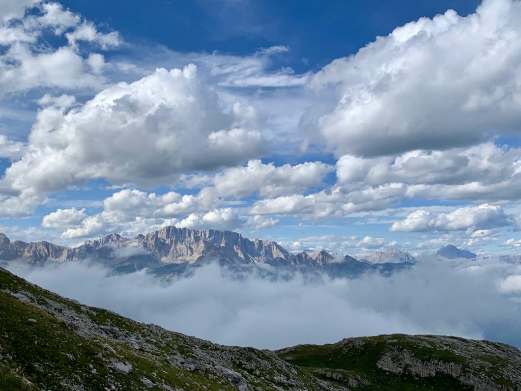 We had all recently completed the northern part of AV2 from Brixen/Bressanone to Lake Fedaia, and both Maeve and Francois had just done the additional day around the shoulder of Marmolada. What surprised all of us was how much more difficult the southern part is compared to the northern part. The trail has bigger and steeper ups and downs; more narrow ledges with dramatic exposure; and more rocky locations that require scrambling skills. Furthermore, there are no chairlifts or gondolas available to ease the burden. It was certainly an arduous week!