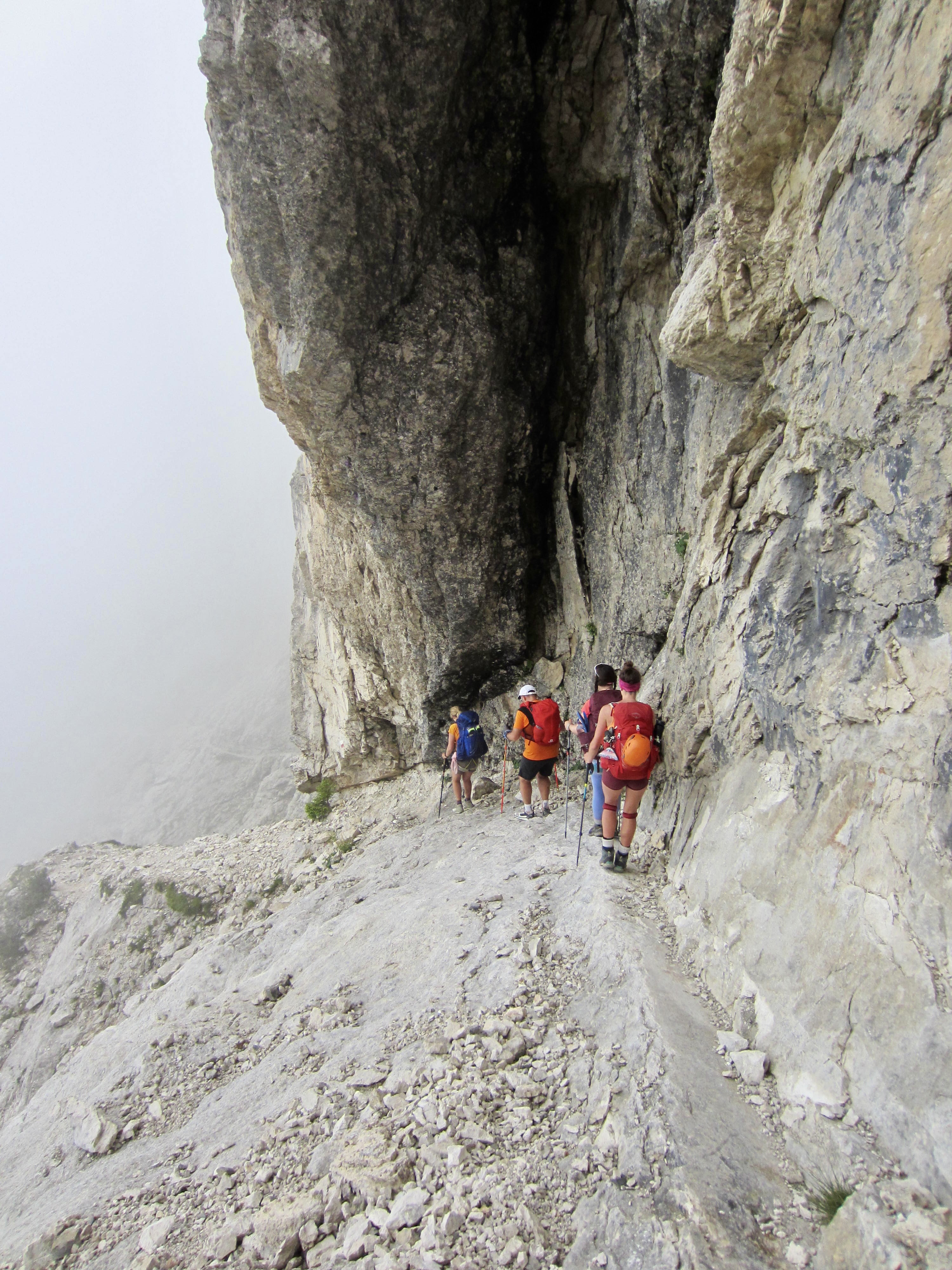 Today was advertised to be “a tough day on the knees” due to a total elevation loss of nearly 6000 feet. Uhhgg! We all got an early start, knowing it would be long and painful hike, but Brooke had an added impetus because she wanted to tuck in two popular via ferratas along the way. Our trail began with tight switchbacks down a steep slope, followed by a cable-aided traverse across a wildly exposed cliff.