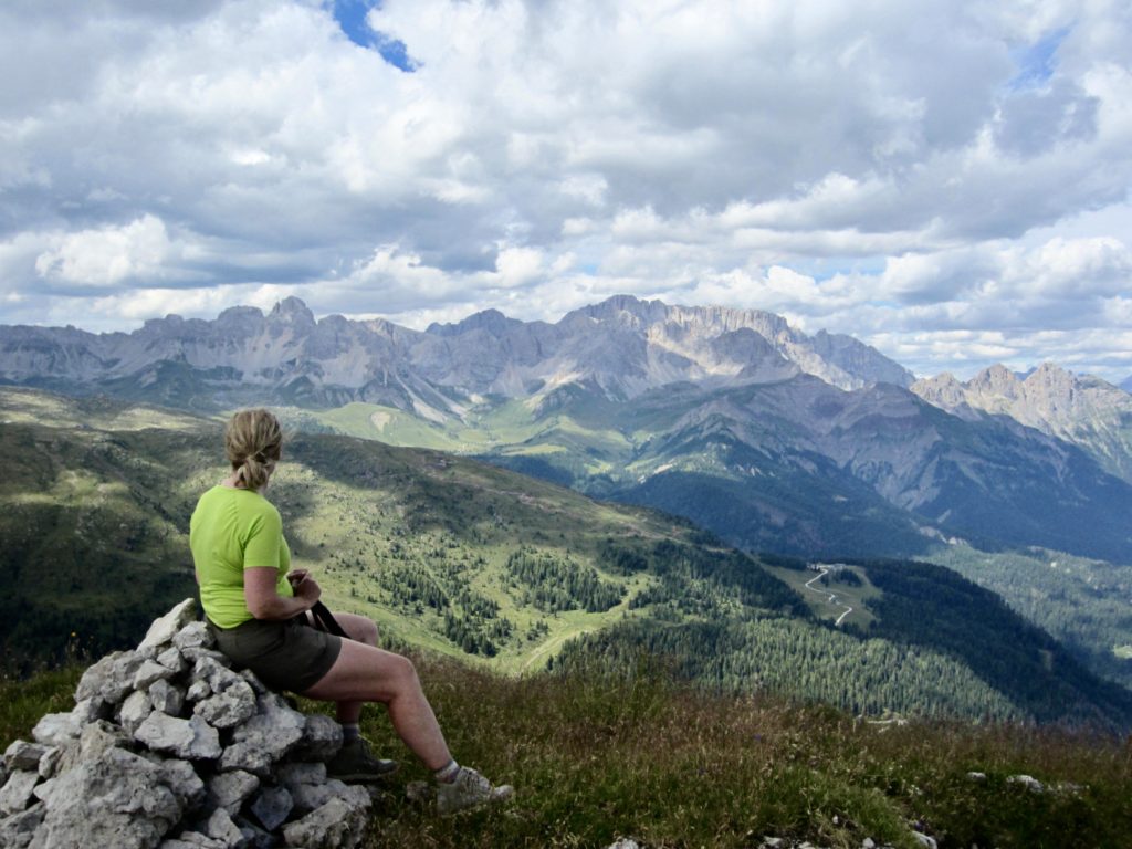 Eileen and I had enough time before dinner to hike up nearby Cima delle Rosetta. This excellent view summit is reached by means of a nicely constructed trail marked with dozens of tall cairns. Thanks to a gondola station located only 200 feet below the summit, it sees lots of visitors.