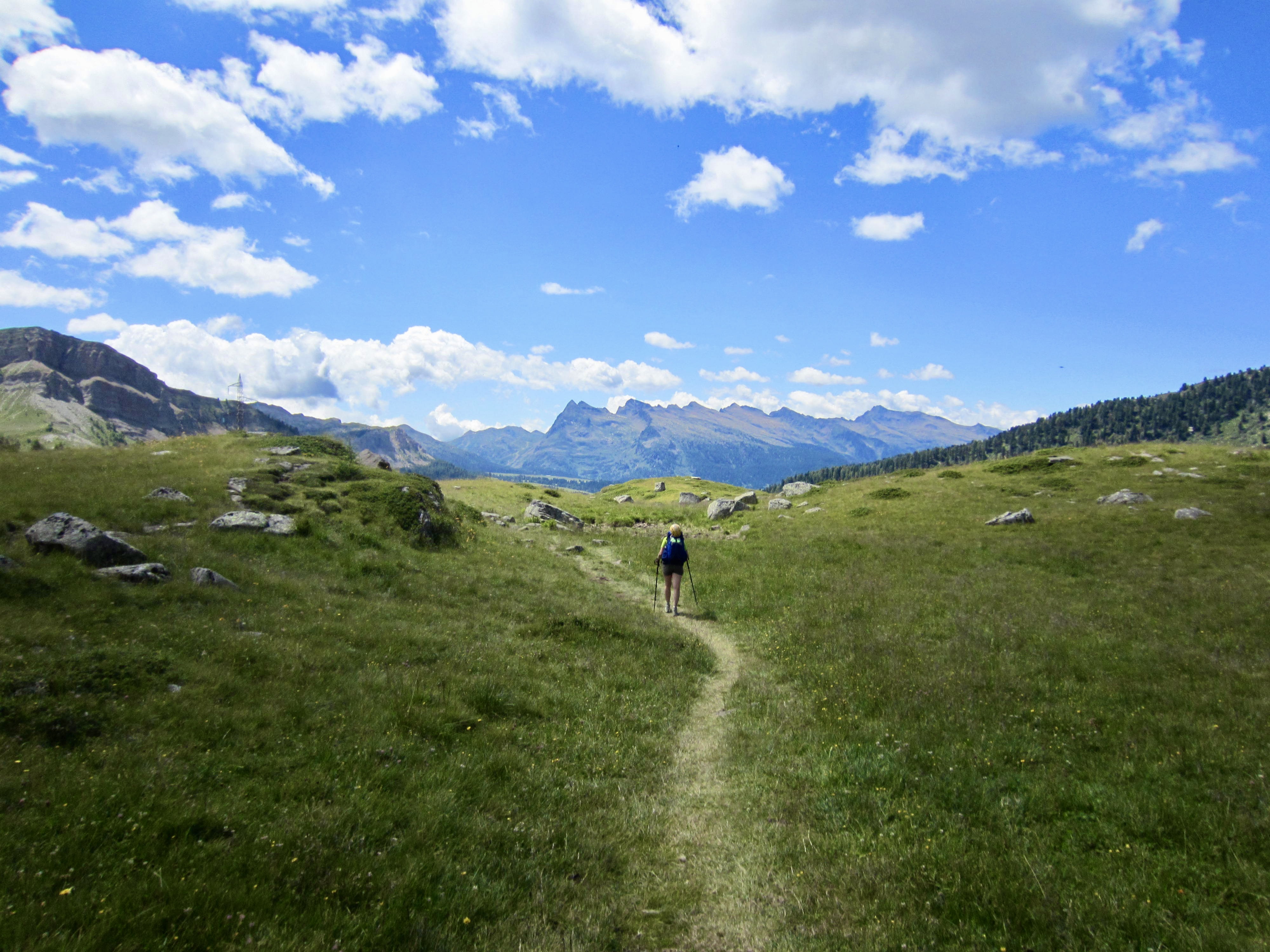 Starting from the busy trailhead parking lot at San Pellegrino Pass, Eileen, Brooke, and I puzzled out the confusing trails and headed southward on AV2. We soon encountered Maeve, a solo traveler from Ireland who immediately became a welcome addition to our group for the whole trek. The four of us spent our morning hiking through rolling pastureland on a combination of trails and roads.