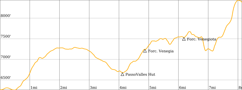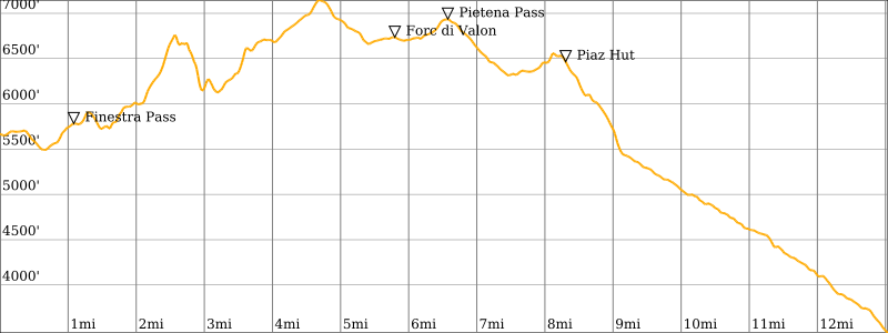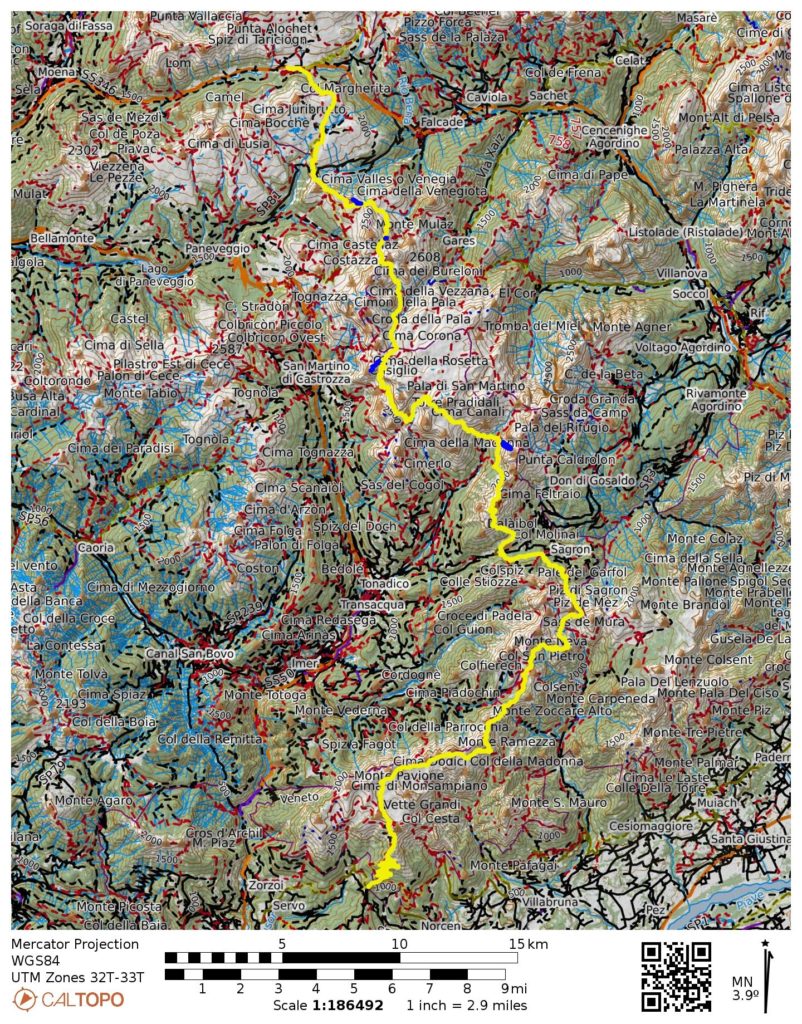 Way Points: Valles Pass Hut & Forcella Venegia & Venegiota Pass & Mulaz Hut & Forcella Margherita & Farangole Pass & Cantoni Basin & Rosetta Hut & Ball Pass & Pradidali Hut & Lede Pass & Minazio Bivouac & Canali Creek & Treviso Hut & Regade Pass & Bastie & Cereda Pass / Cereda Hut & Ortada Grande & Comedon Pass & Bodo Bivouac & Bechi Col & Mura Pass & Boz Hut & Finestra Pass & Pietena Pass & Vette Grandi Pass & Piaz Hut & Croce d’Aune (trail hike & trail scramble)