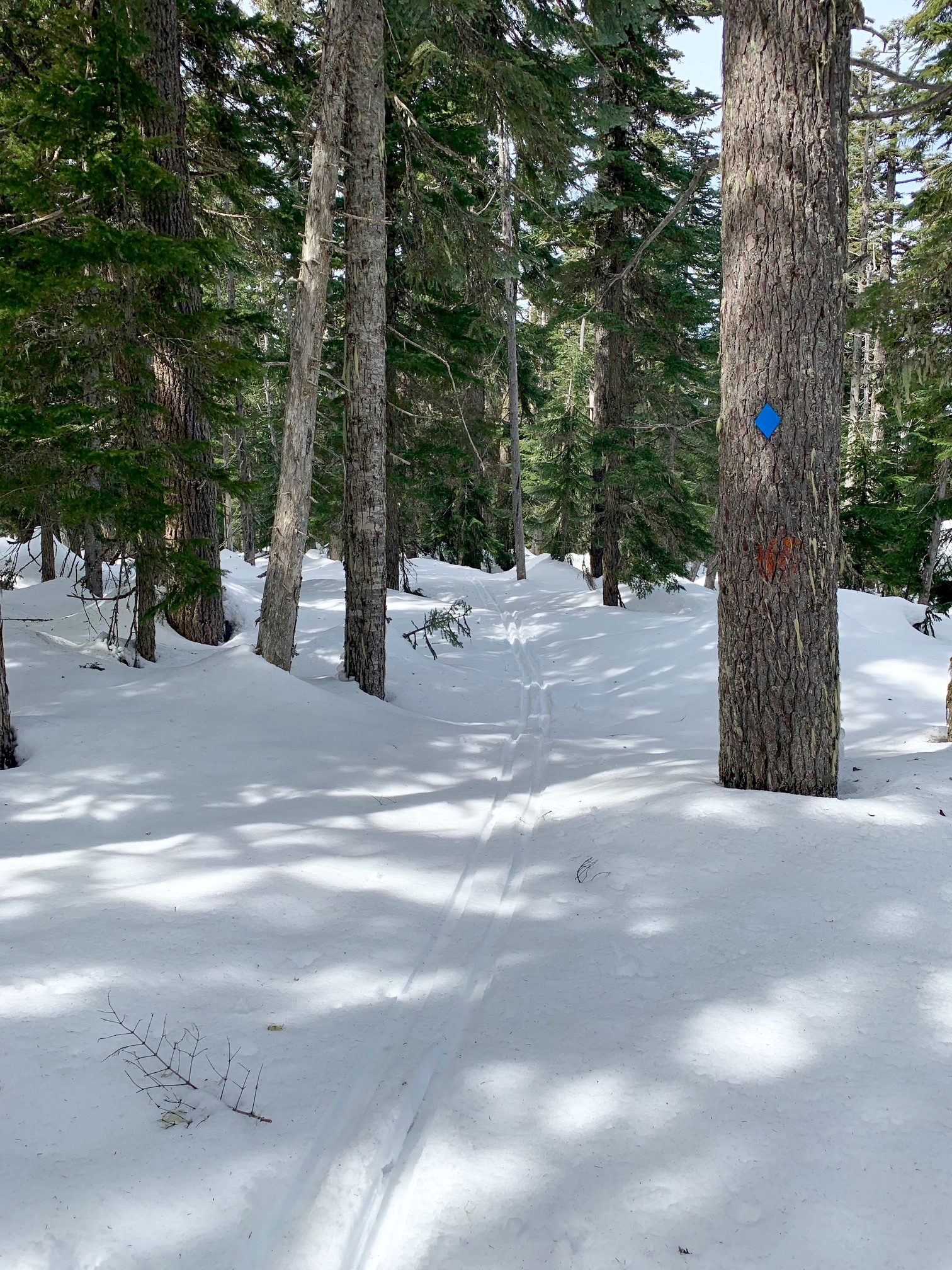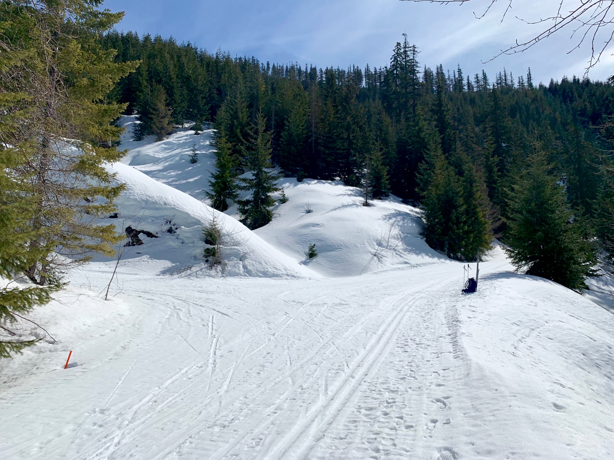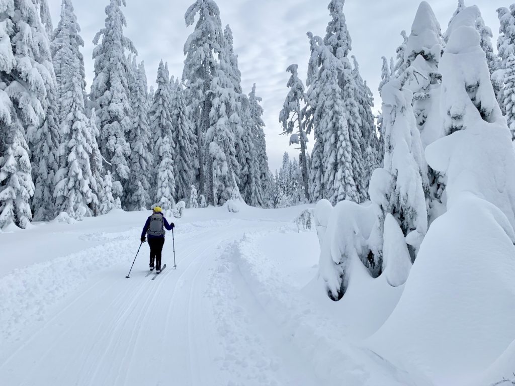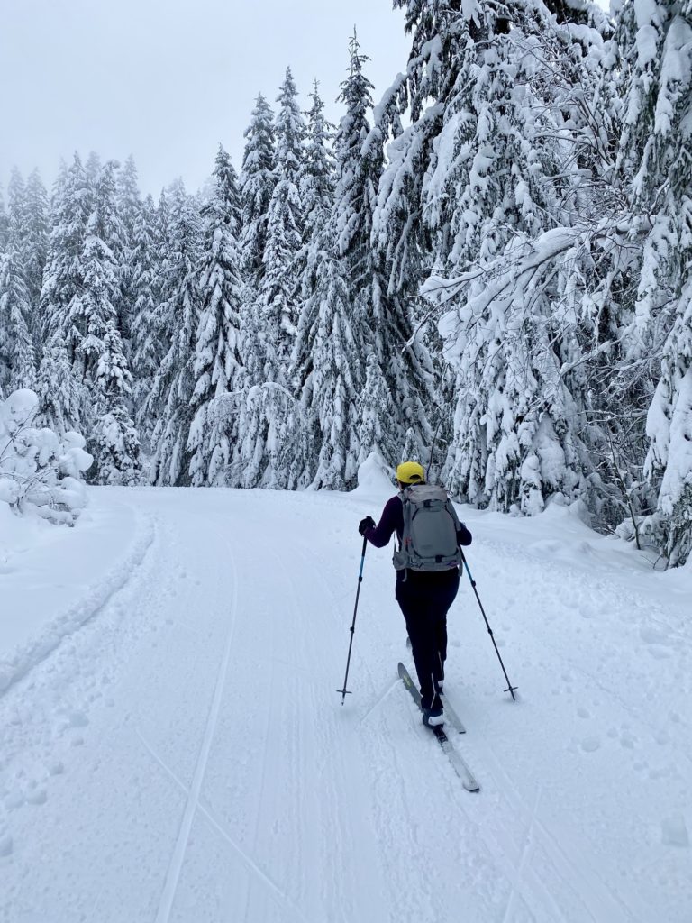 Under favorable snow conditions, the Amabilis Mountain Ski Loop can be readily done on standard cross-country ski gear and even skate-skiing gear. Under difficult conditions, however, such gear will seem less than adequate. Having completed the loop approximately 100 times over a span of 15 years, I’ve experienced the full gamut of trail conditions, ranging from well-groomed “corduroy” to completely ungroomed “backcountry” snow.