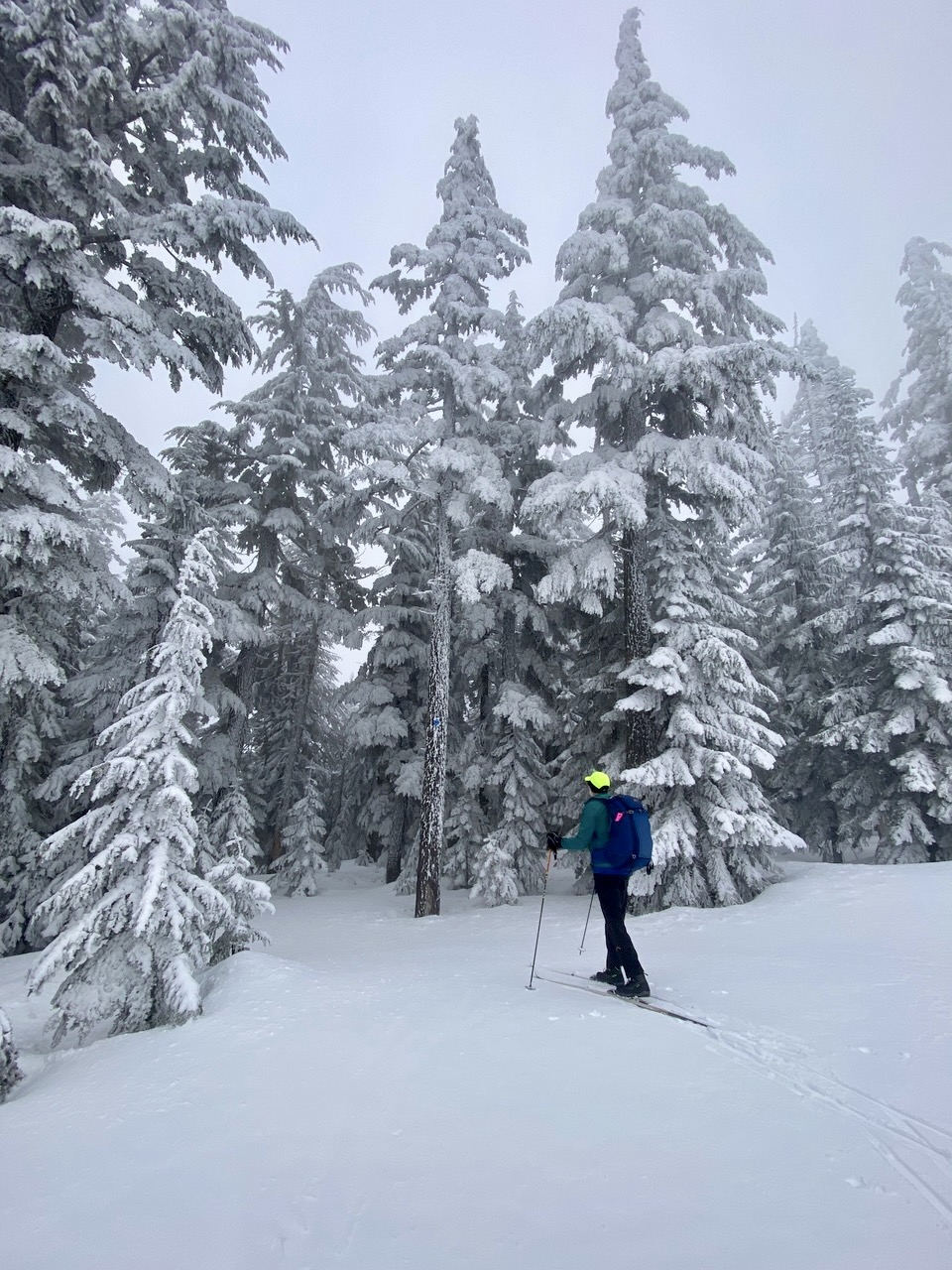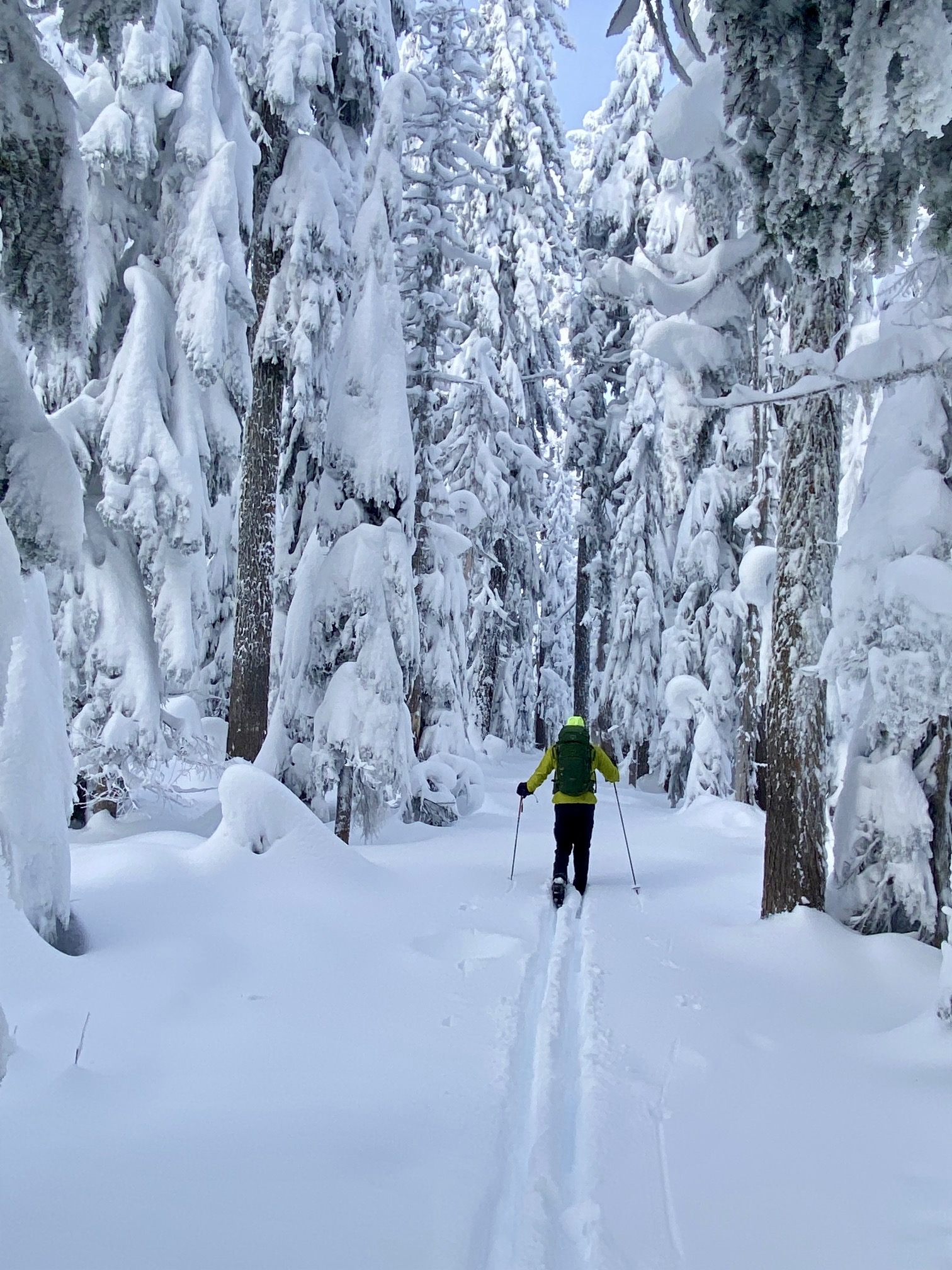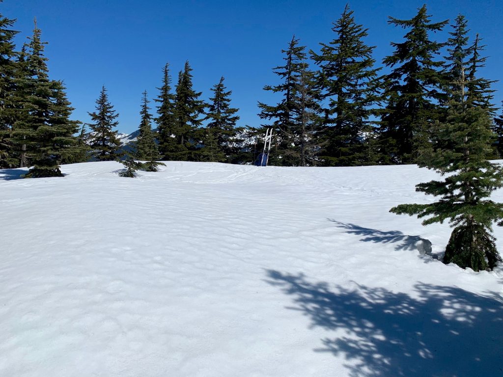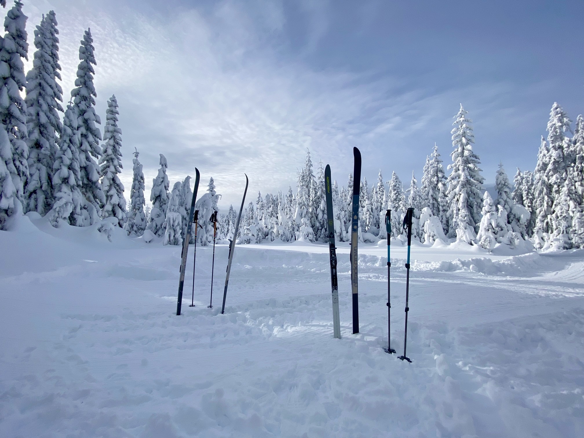 Under favorable snow conditions, the Amabilis Mountain Ski Loop can be readily done on standard cross-country ski gear and even skate-skiing gear. Under difficult conditions, however, such gear will seem less than adequate. Having completed the loop approximately 100 times over a span of 15 years, I’ve experienced the full gamut of trail conditions, ranging from well-groomed “corduroy” to completely ungroomed “backcountry” snow.