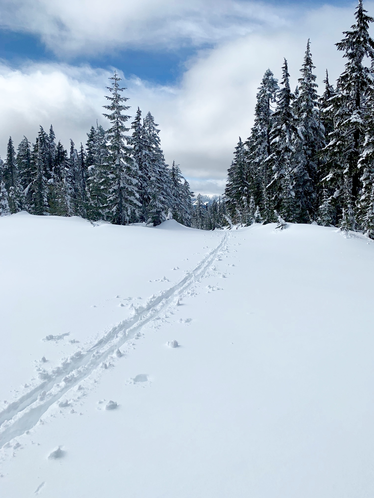 Continuing on, you will soon arrive at the Amabilis “Y,” thereby closing your loop. From here, more twists and turns take you back down to your starting point in the Cabin Creek Nordic Area. The total loop, excluding any sidetrips, is approximately 11 miles with 2100 feet of elevation gain.