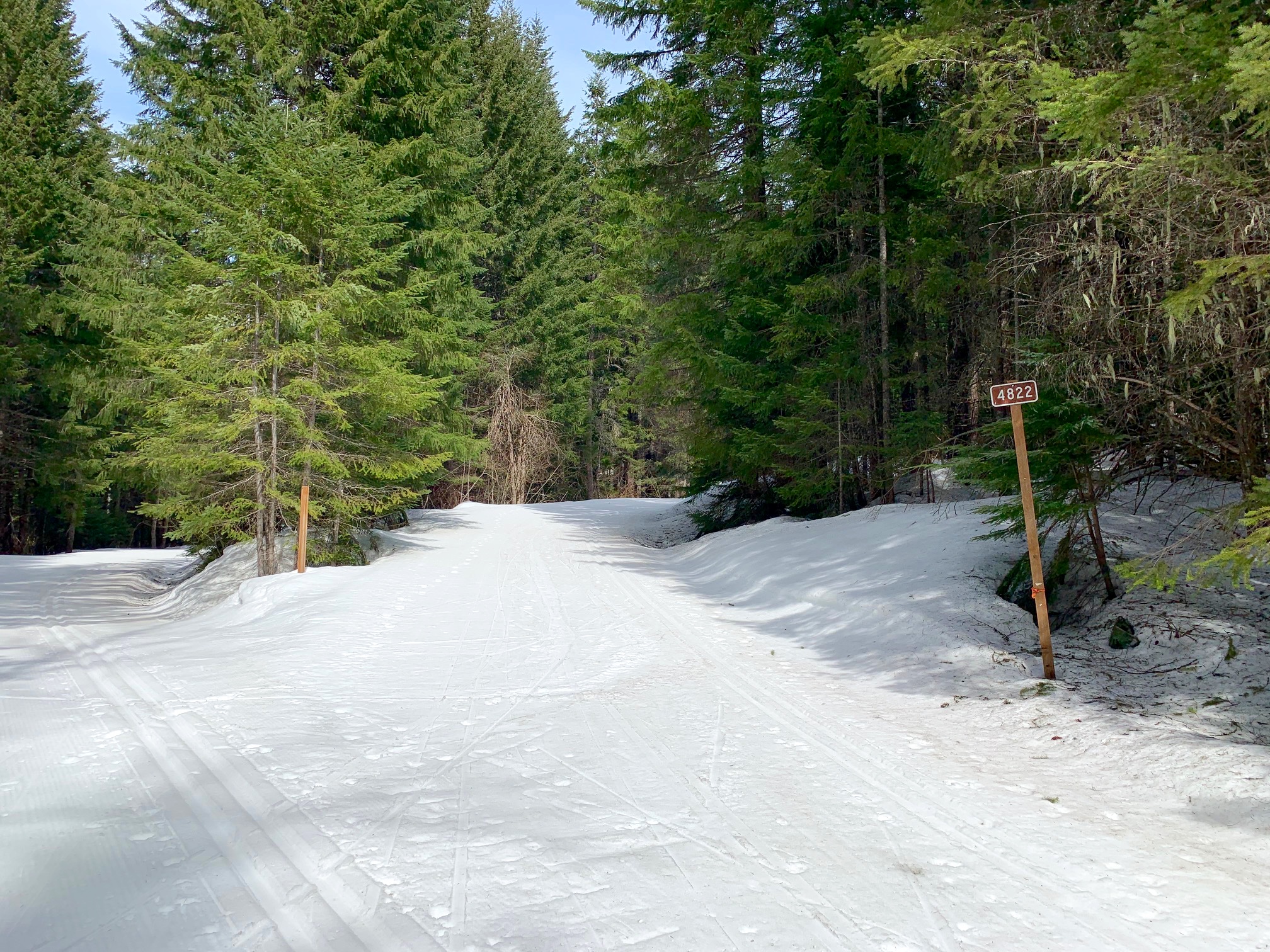 From the north-fork road terminus, it’s all downhill. This road is usually groomed, so you will likely be able to enjoy a fast glide down the ridge, making numerous twists and turns but still generally heading northward. In approximately 1½ miles, the road makes a sharp left-hand turn at the North Hairpin, which marks the northernmost extent of the loop. From here, it begins traversing back to the south.