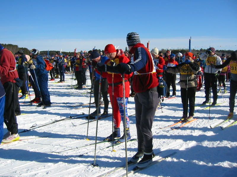 The mass start of a big cross-country ski race is really something that needs to be experienced in an up-close and personal way. Thousands of arms, legs, poles, and skis flail in all directions, and a certain percentage of skiers inevitably take comical wipe-outs. Skate-skiing, even more than stride-skiing, is definitely not what you would call a “compact” activity; the lateral skating motion requires a good 5-foot buffer in all directions around each skier. Just try to imagine everyone in the Boston Marathon carrying sideways a 10-foot-long 2×4 with carbide points on both ends, then you’ll begin to get part of the picture.