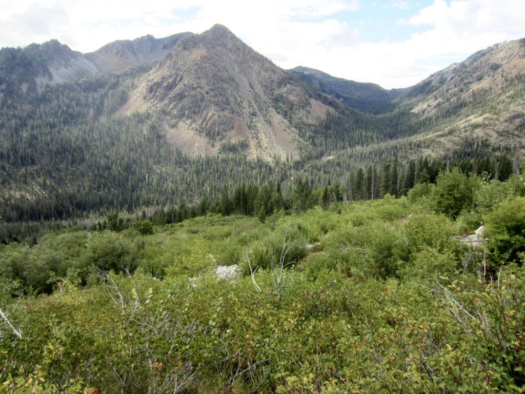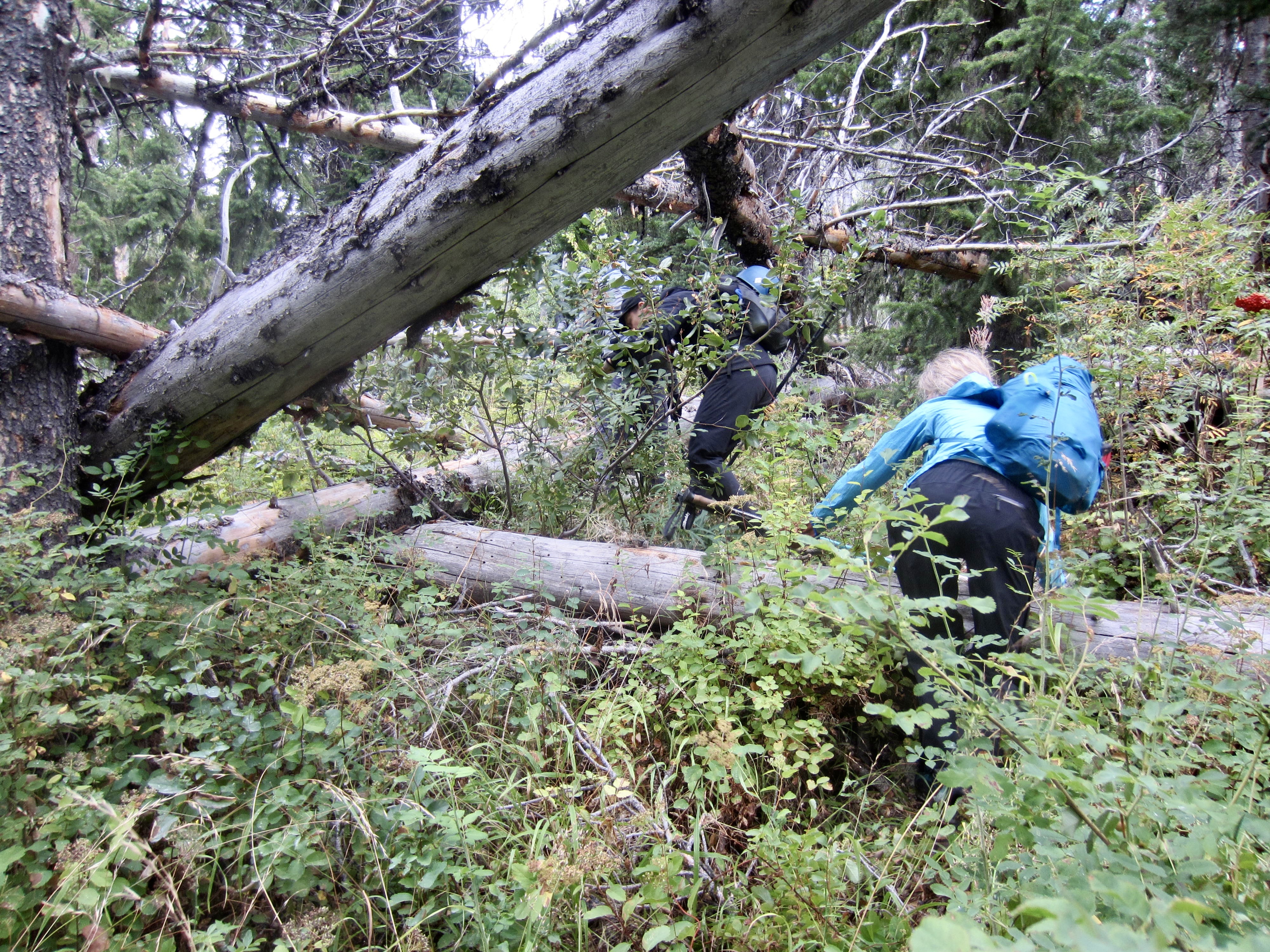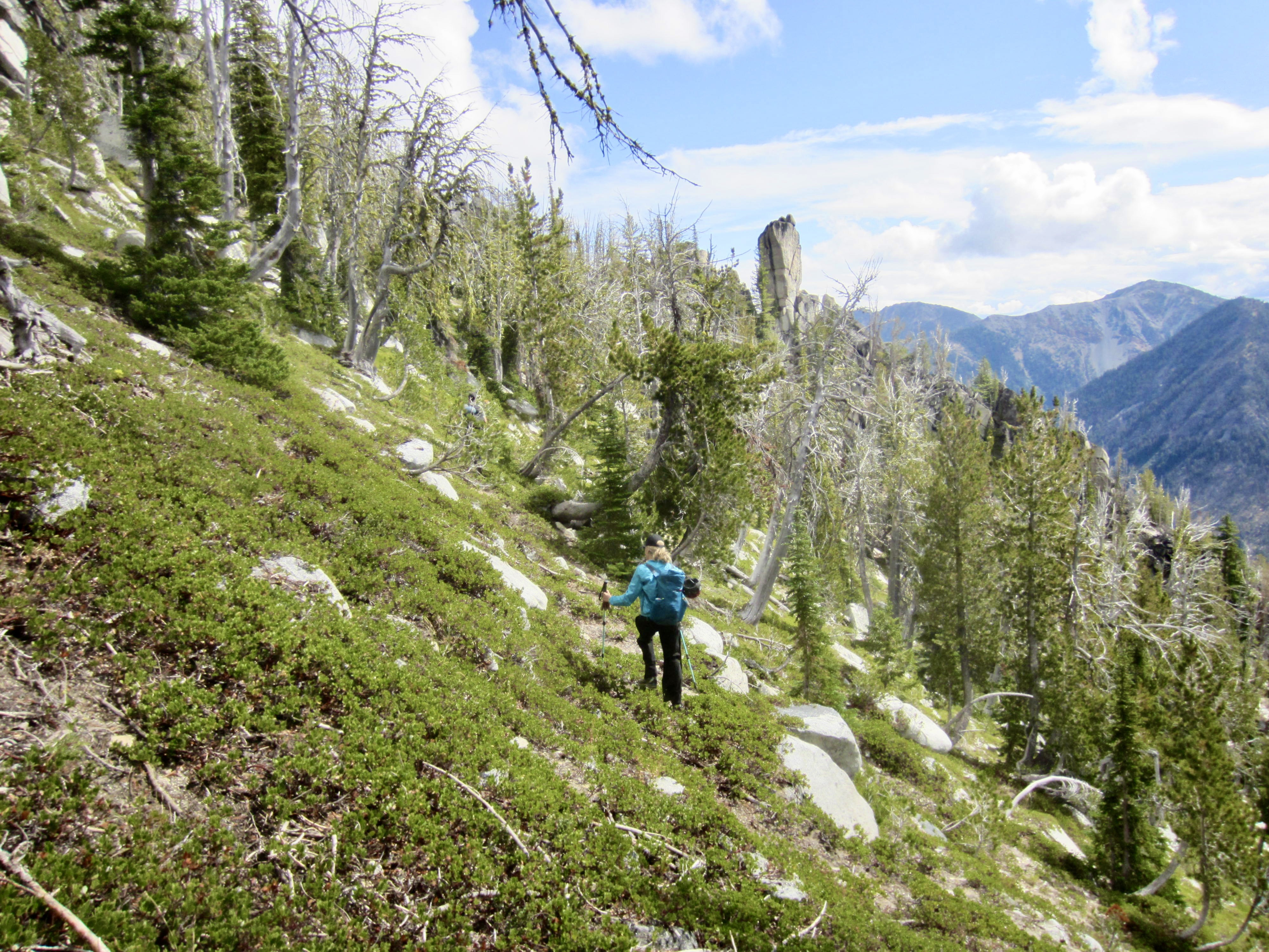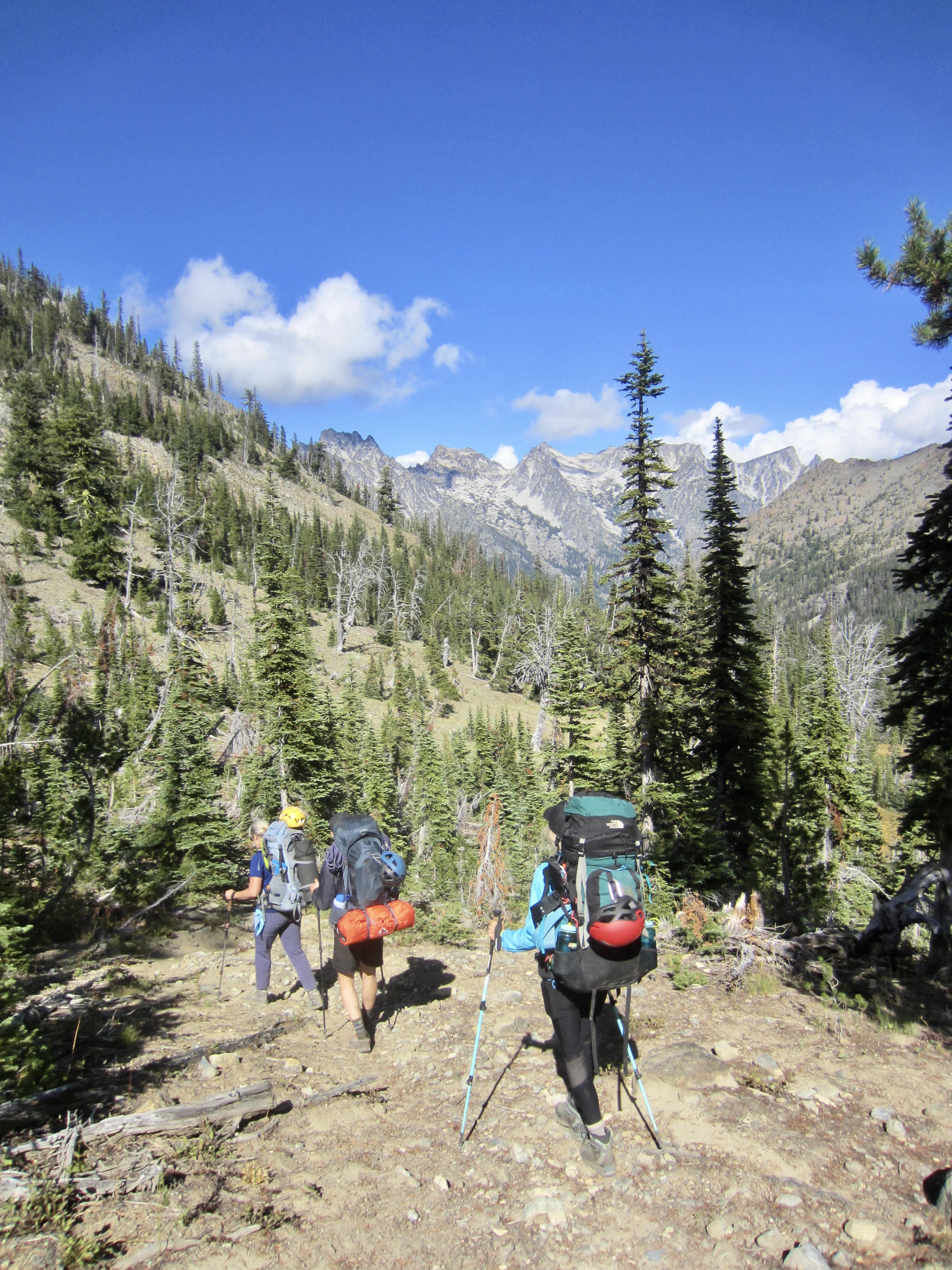 Following a clear, cold night, everybody was packed up and ready to go by 7:45am. During our hike over Fourth Creek Pass, Eileen and I kept looking back at Argonaut Peak, studying the terrain and contemplating a revised strategy for approaching and climbing the mountain on a future attempt. One thing was for certain: neither of us had any interest in battling through the south-side brush again!