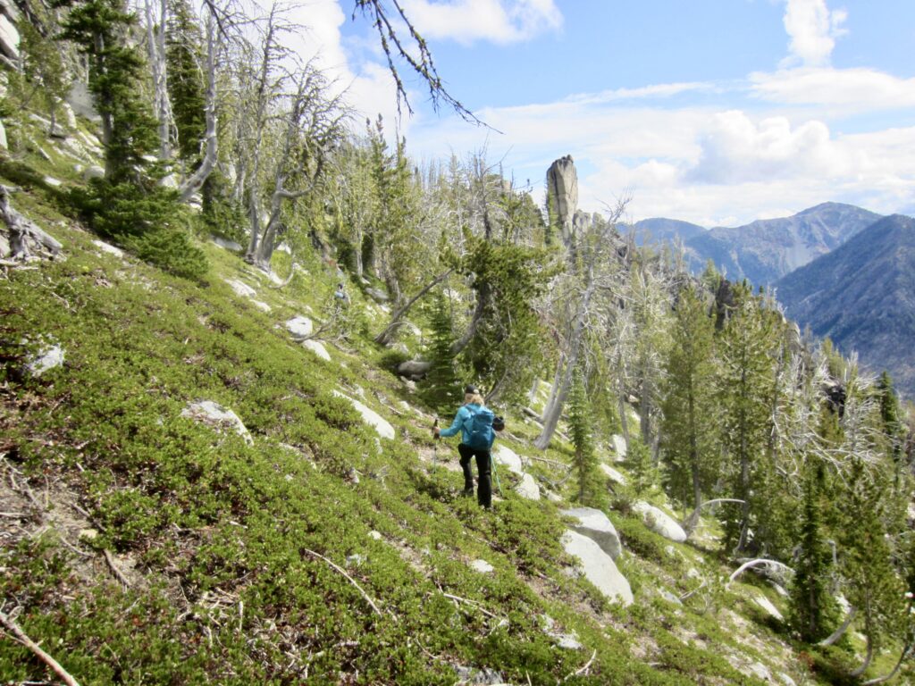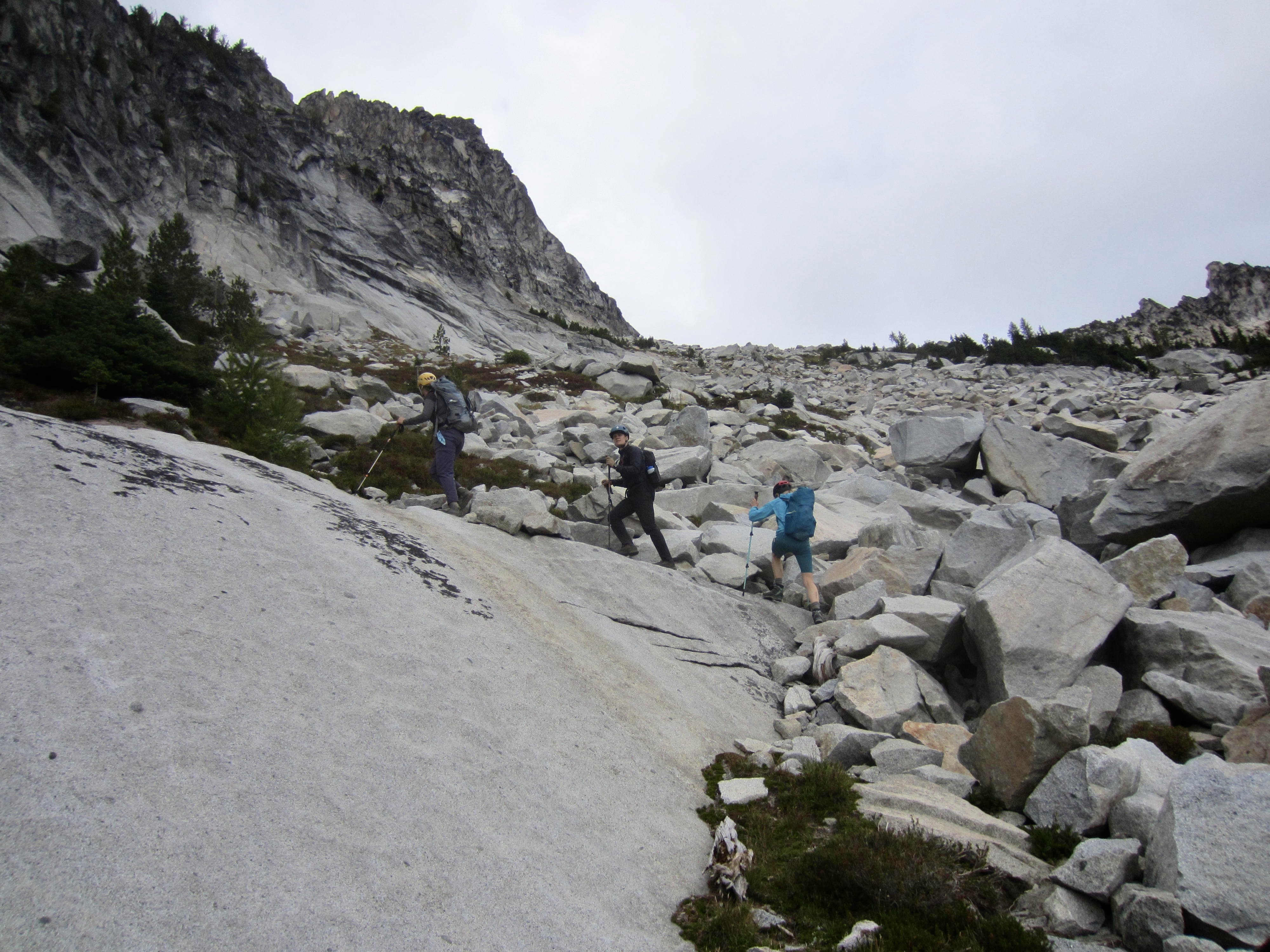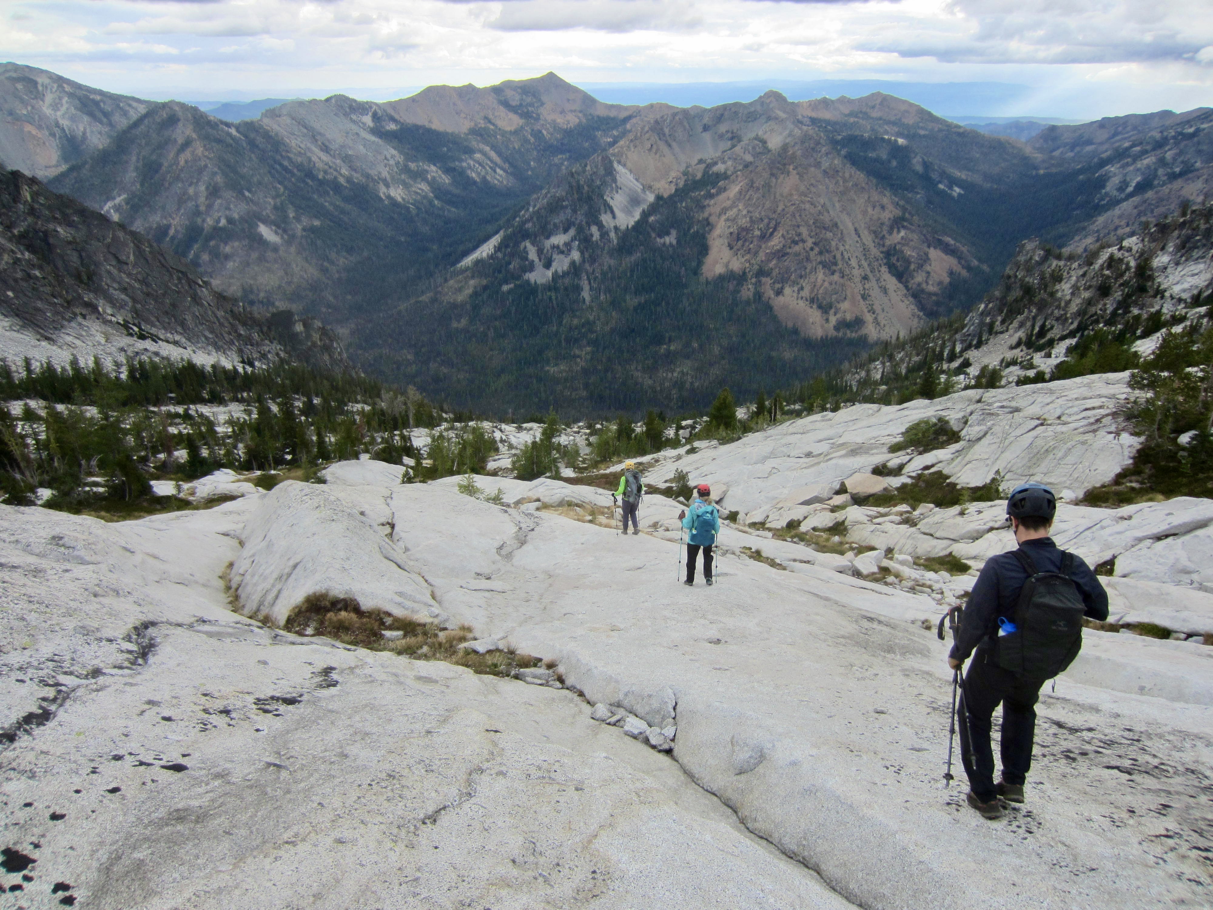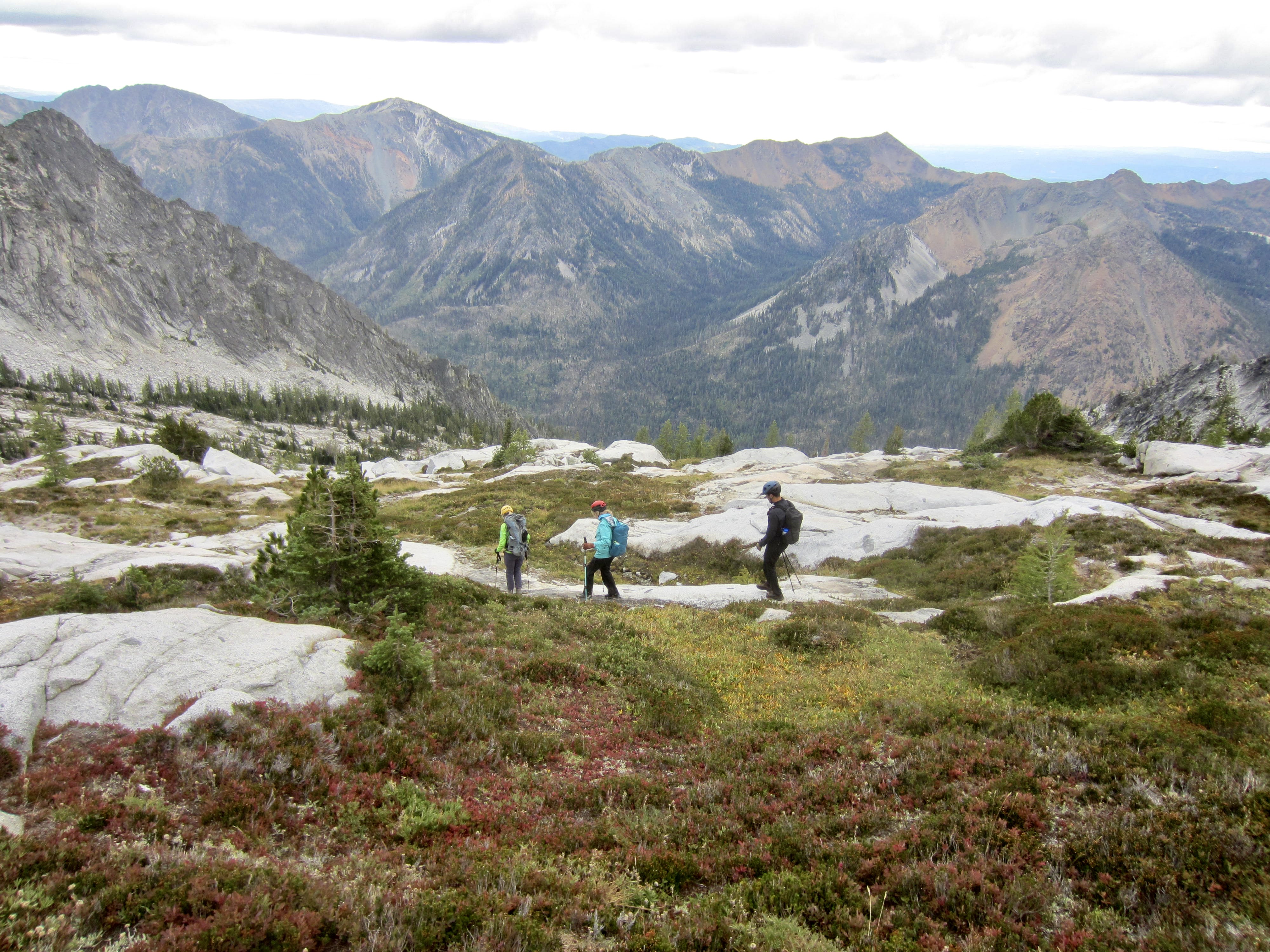 None of us wanted to return to camp by way of the horrible brush that we’d ascended this morning, especially considering that we would run out of daylight well before reaching Ingalls Creek Trail. Instead, we descended along a route farther to the east, generally following Porcupine Creek the whole way. Our route initially took us down a series of pleasant heather benches and polished granite slabs through the wide basin.