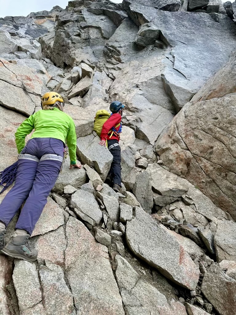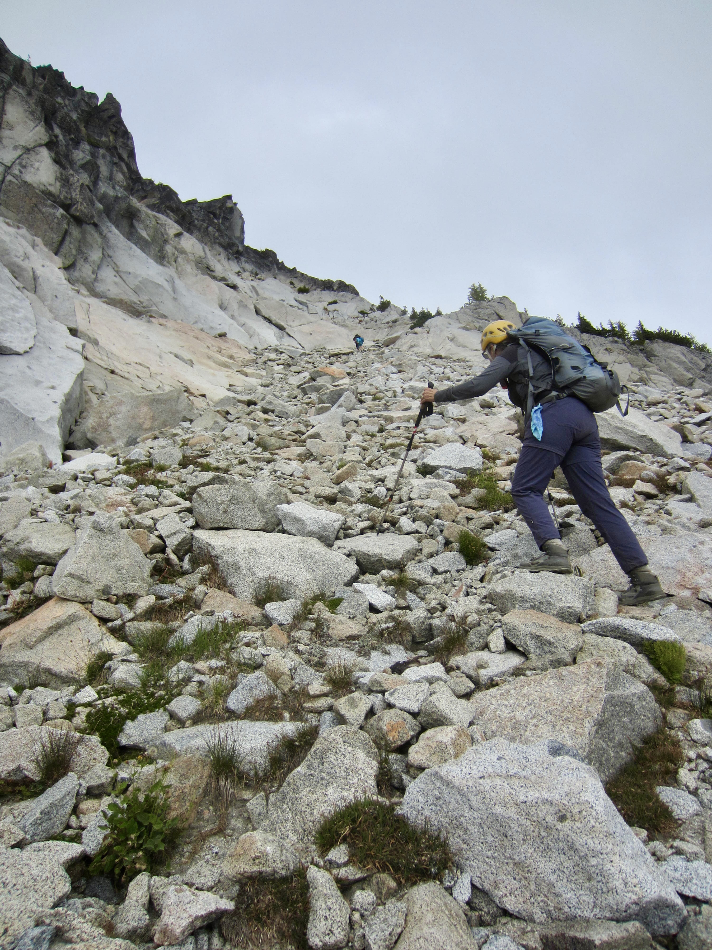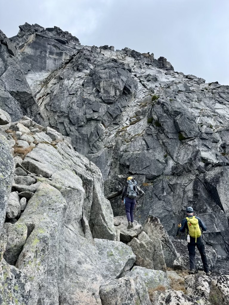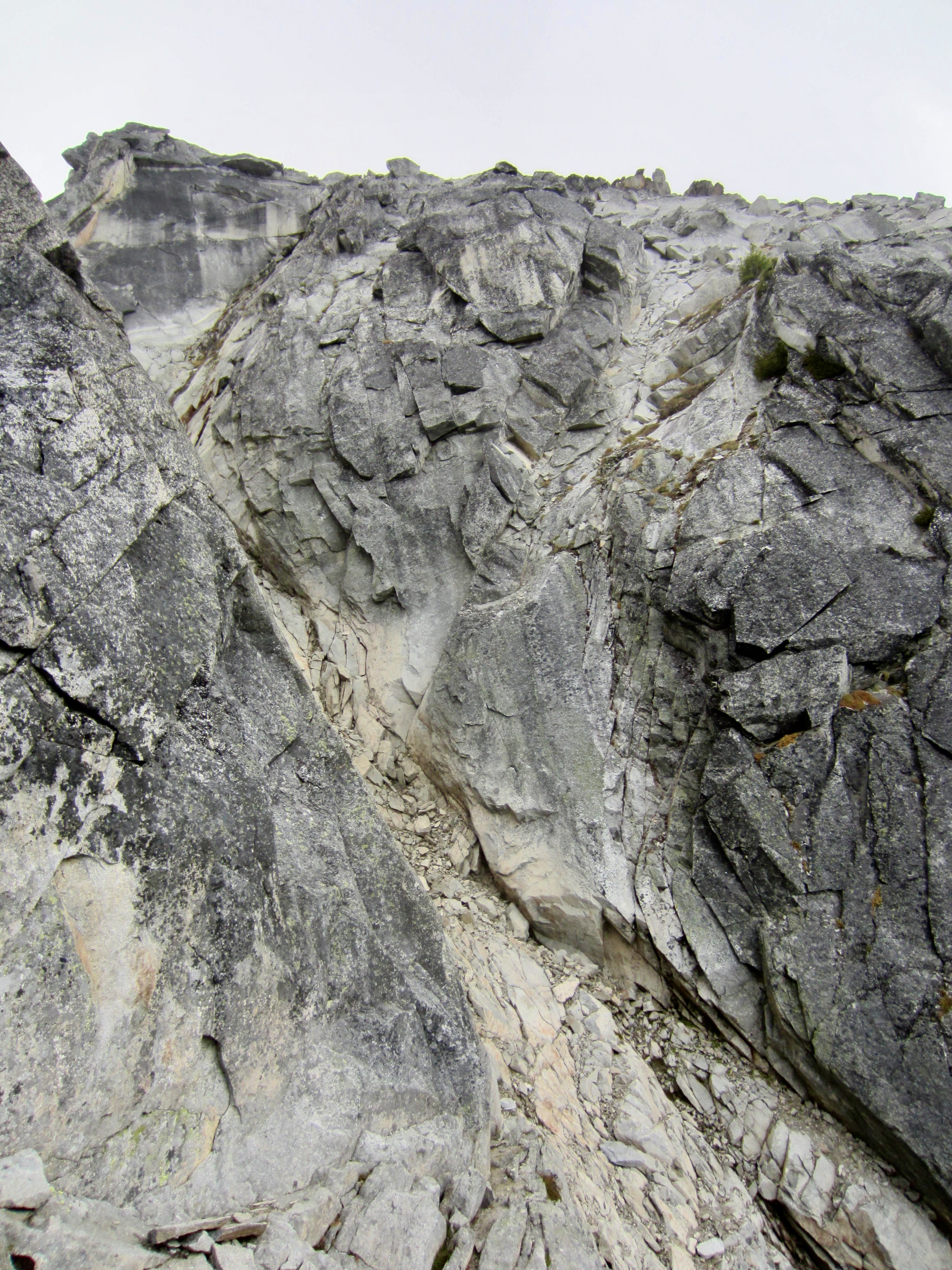 We ascended heather, talus, scree, and rock slabs for 1000 feet until gaining the Colchuck–Argonaut Saddle at 7750 feet. This put us on Argonaut’s northeast ridge, with a view of the summit block and the broad upper northeast face. We scrambled up the ridge crest until it steepened, then we traversed along the right (northwestern) side of the crest a bit farther.