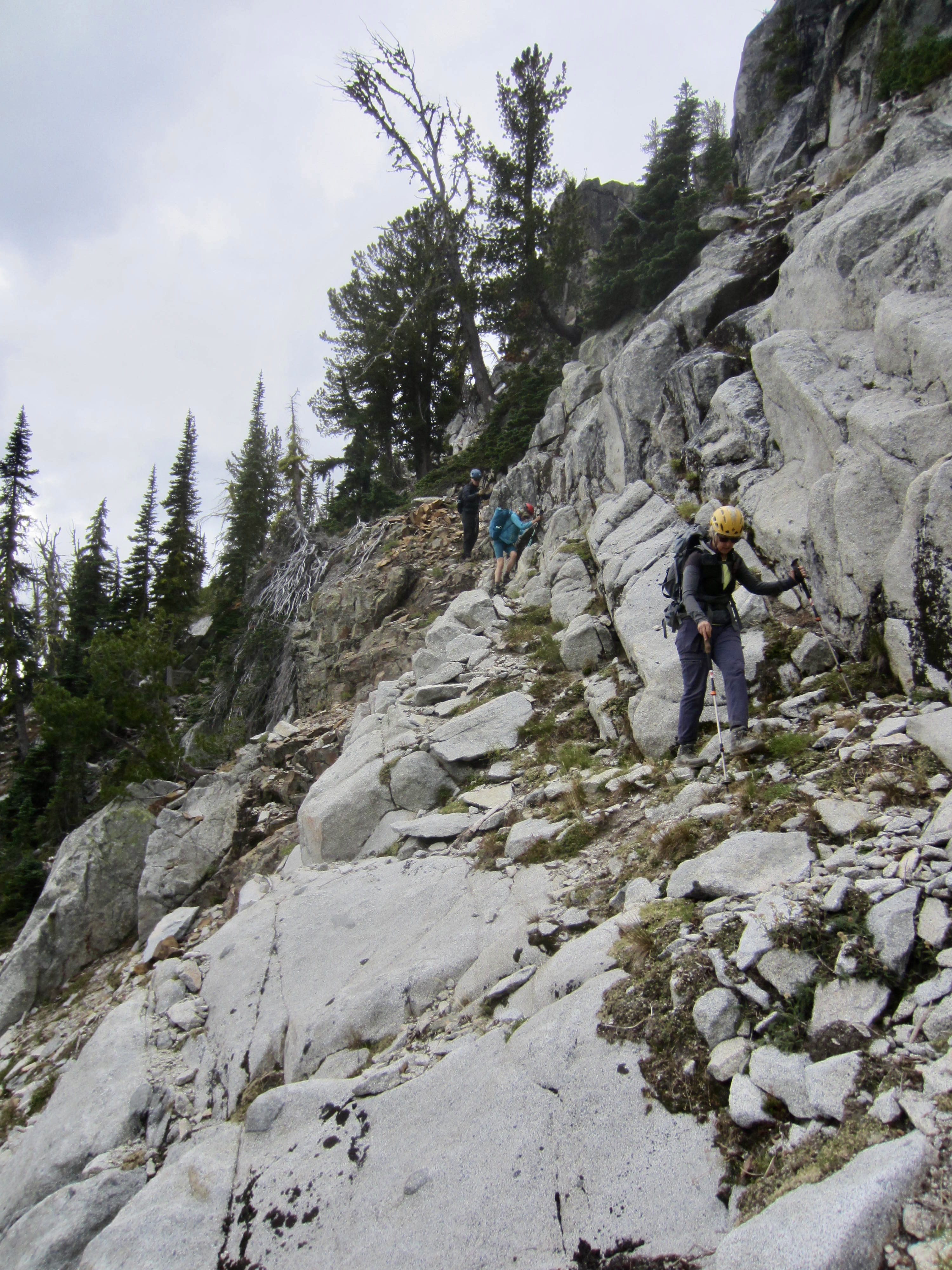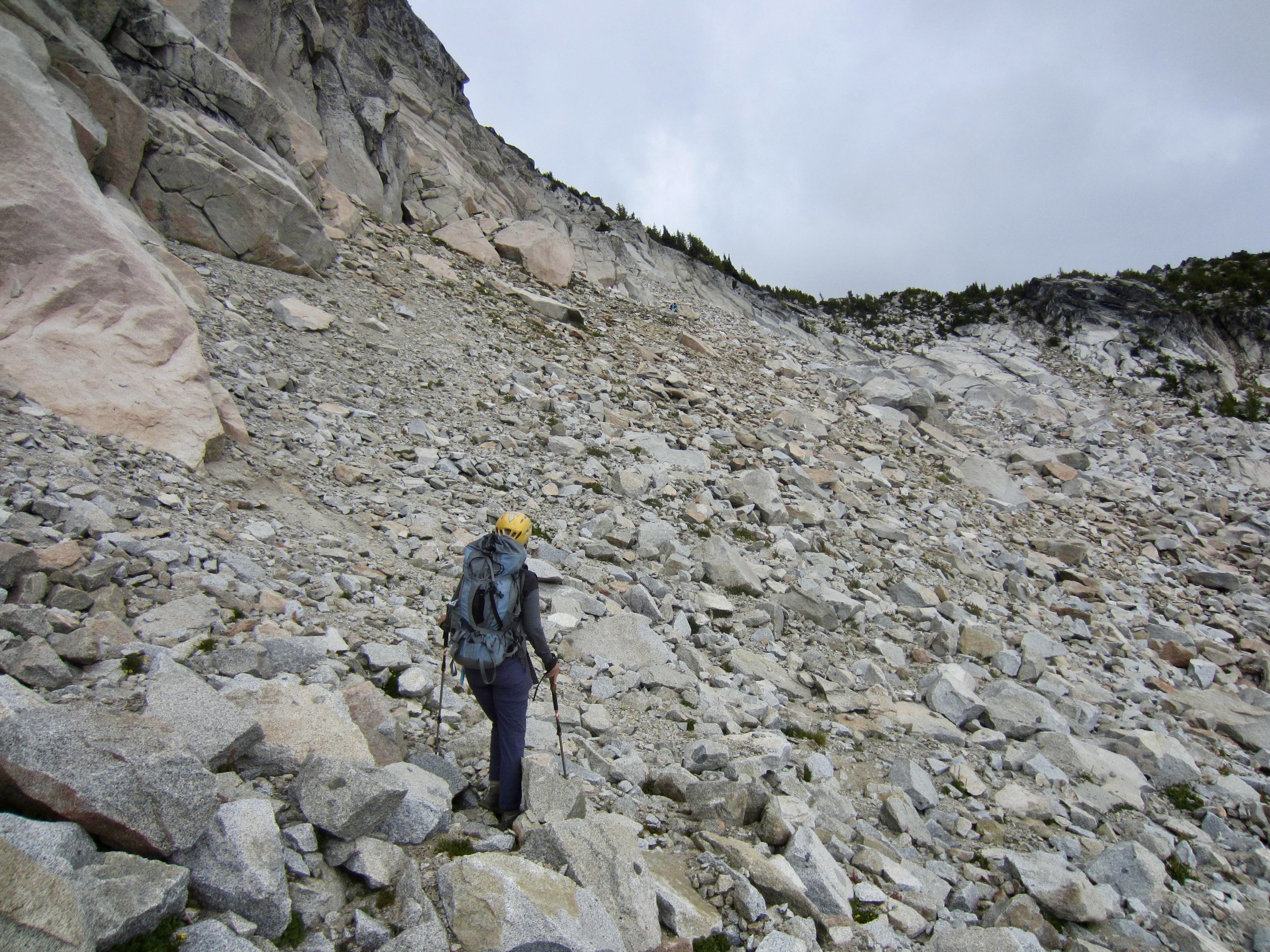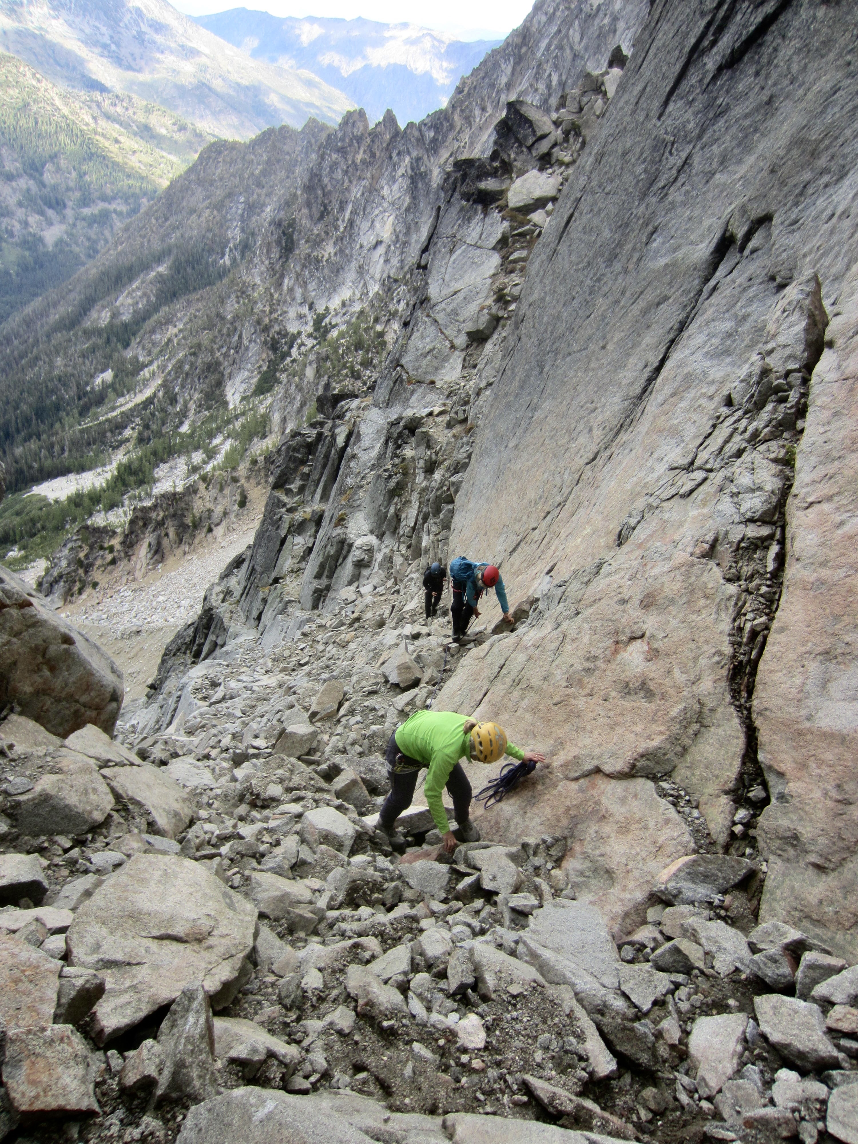 We crossed over Argonaut’s southeast ridge at a 6750-foot notch and scrambled down a broken ramp that opened onto the vast Porcupine Creek Basin. Dragontail Peak and Colchuck Peak were visible up to the right, and the Colchuck–Argonaut Saddle was visible up to the left.