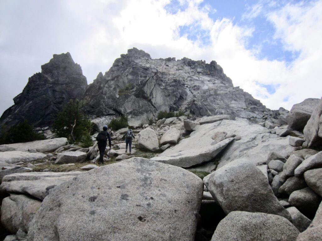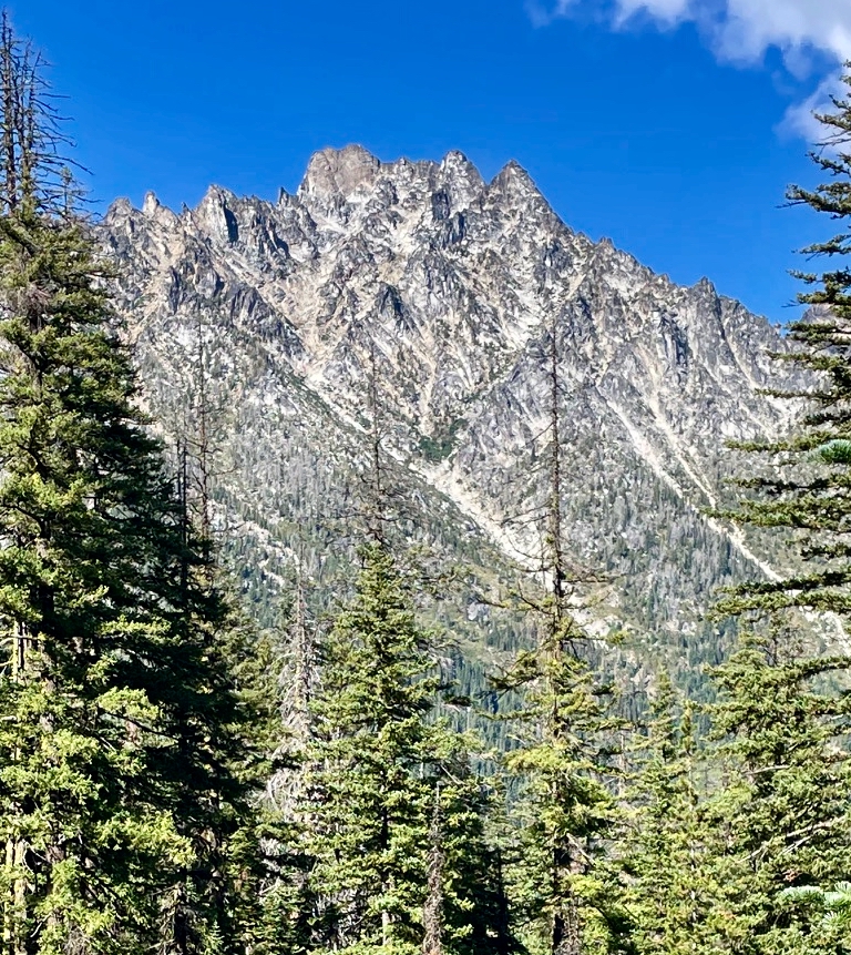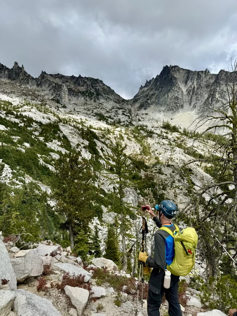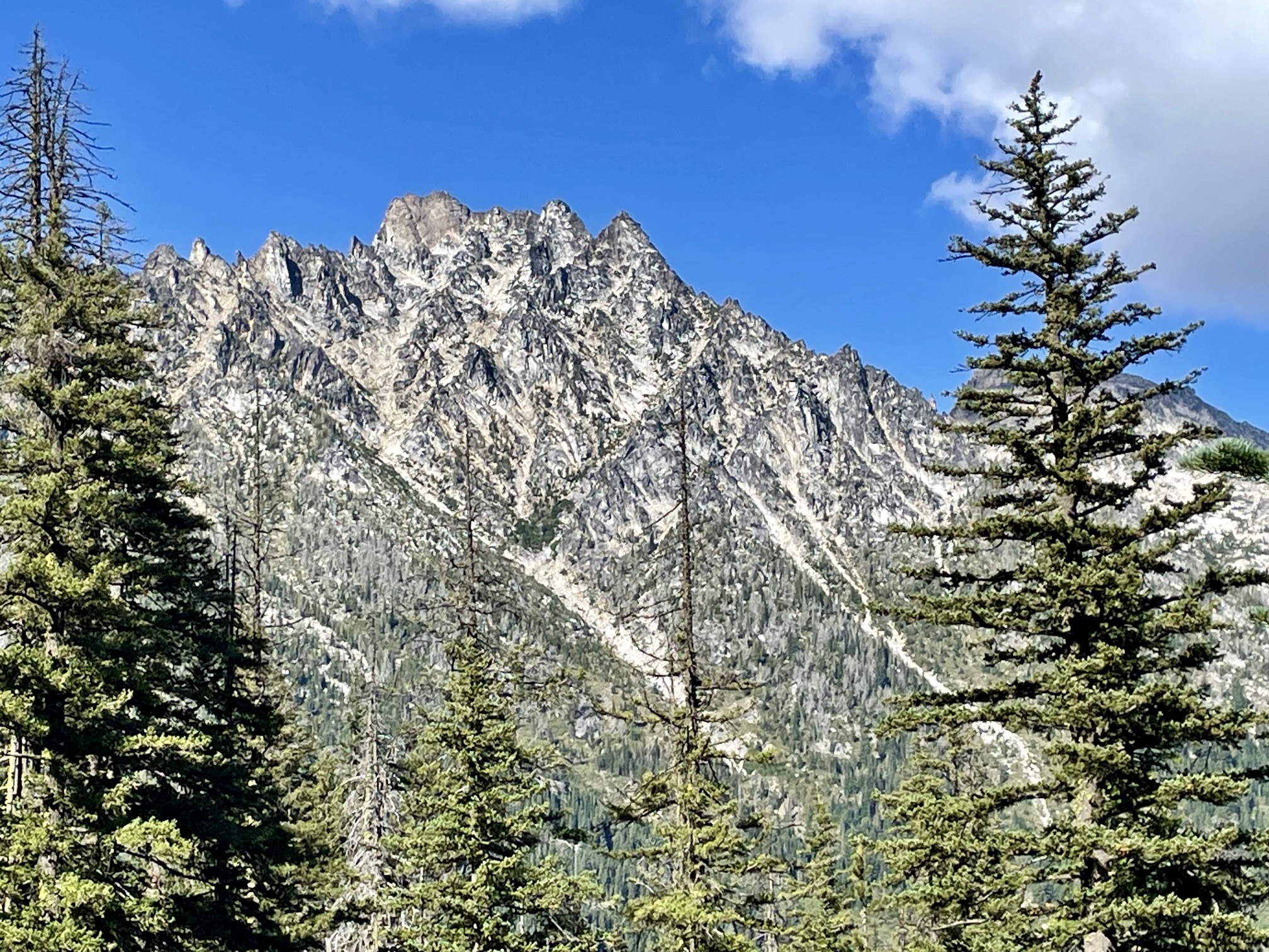 Eileen, Kerry, Cody, and I were planning to do a three-day climb in the Olympics this weekend, but a rainy forecast made that an unappealing destination. As a last-minute alternative, I suggested Argonaut Peak in the Stuart Range, and everybody gave it a thumbs up. I had climbed Argonaut 25 years ago via Colchuck Lake, Colchuck Col, and the northeast ridge, so I had a little familiarity with the mountain. However, because we held little hope of getting a permit for ultra-popular Colchuck Lake this late in the game, it made sense to approach the mountain from the Teanaway side, via Fourth Creek Pass and Ingalls Creek. I had no knowledge of south-side conditions on Argonaut Peak, but I figured that we could wrap around the eastern side of the mountain and get onto familiar terrain. Things didn’t play out quite as envisioned, but we had a memorable adventure regardless.