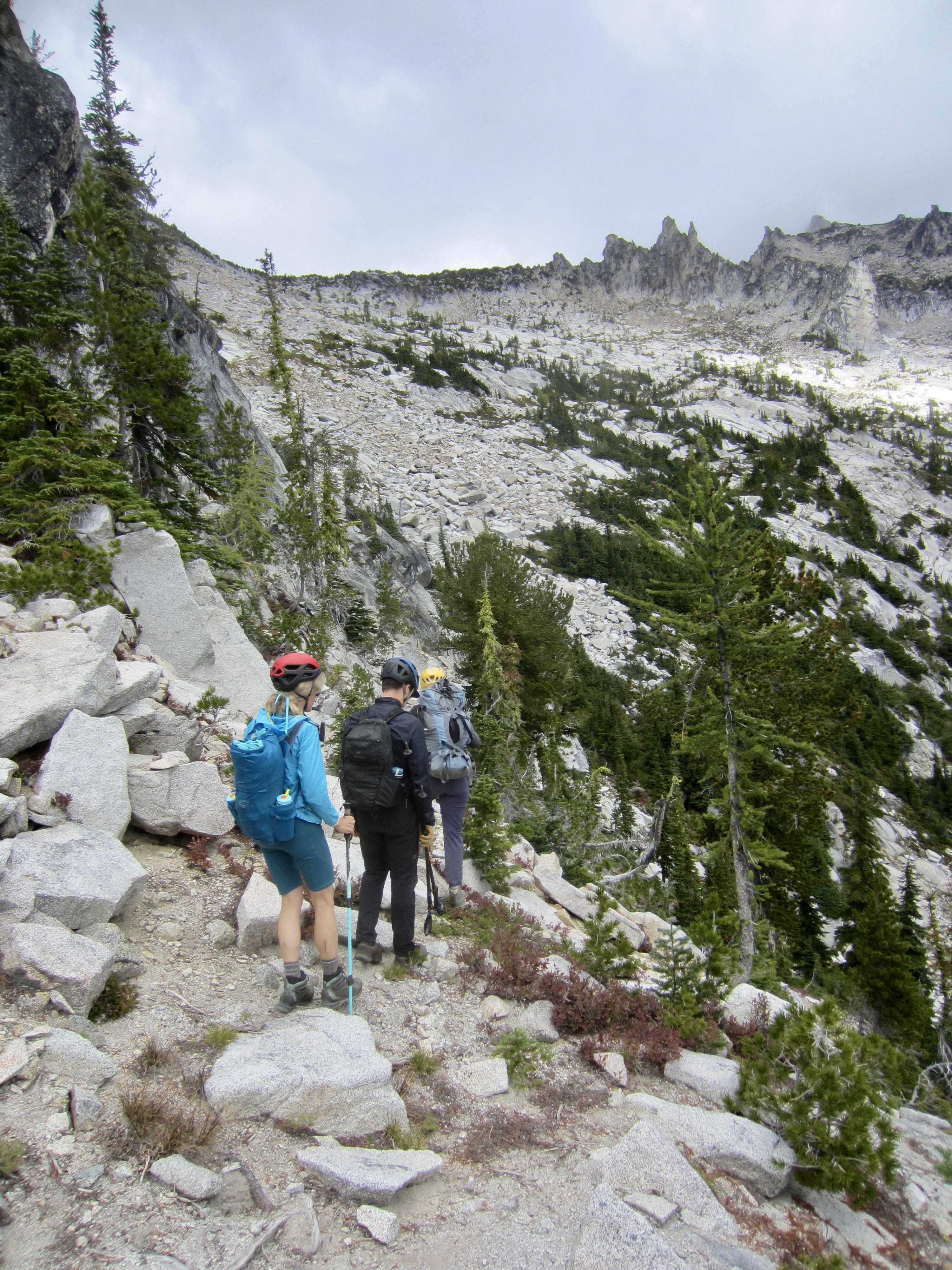 From the pass, we continued hiking down Fourth Creek on a well-maintained trail that descends to the southern shore of Ingalls Creek. An easy rock-hop across the creek brought us to a roomy campsite on the northern shore (5.2 hours + 5.5 miles + 2150 feet from TH). We pitched our tents and spent the rest of the afternoon doing assorted camp chores, which included a knot-tying practice session for Kerry and Cody, both of whom are aspiring mountaineers.