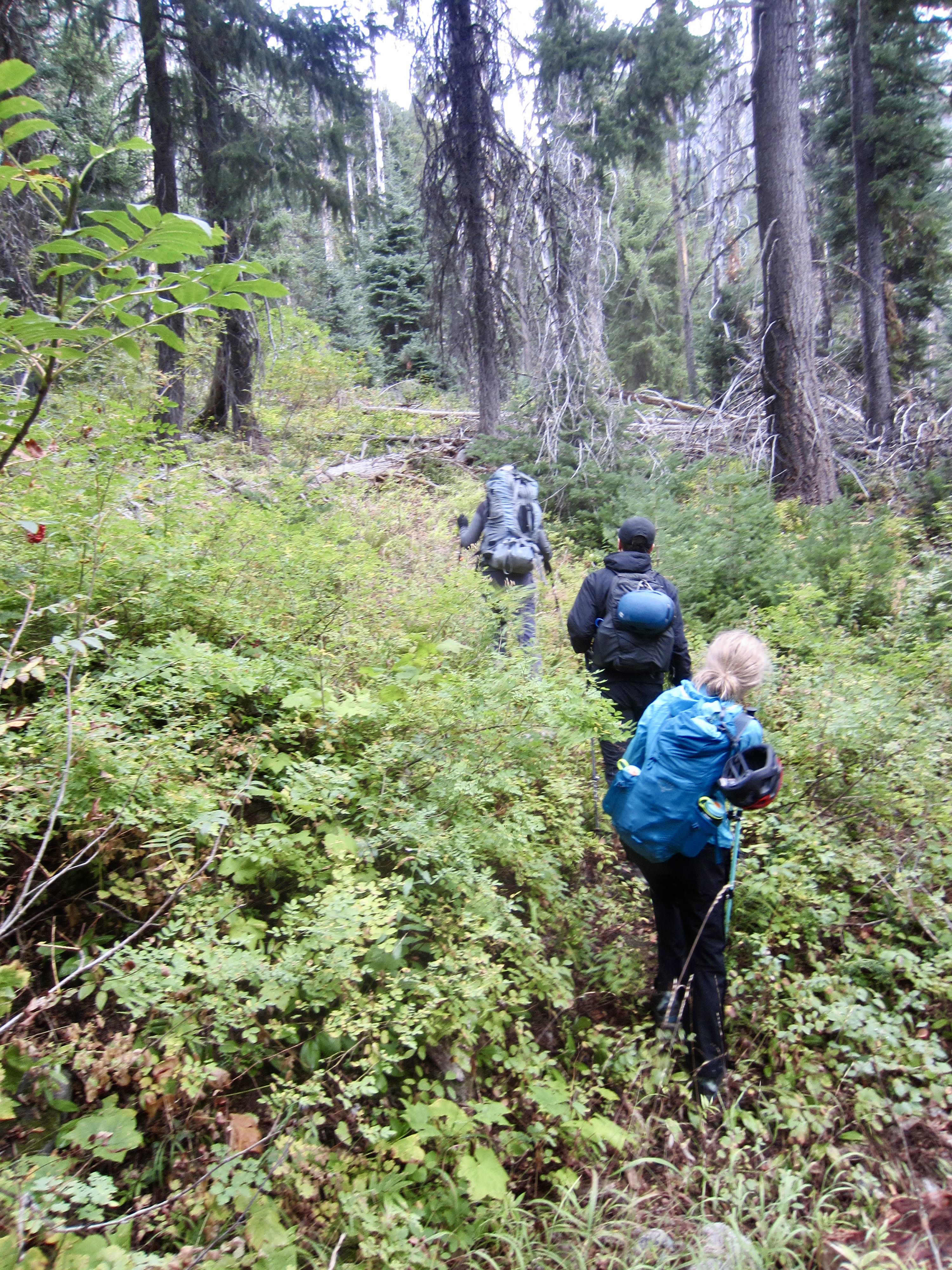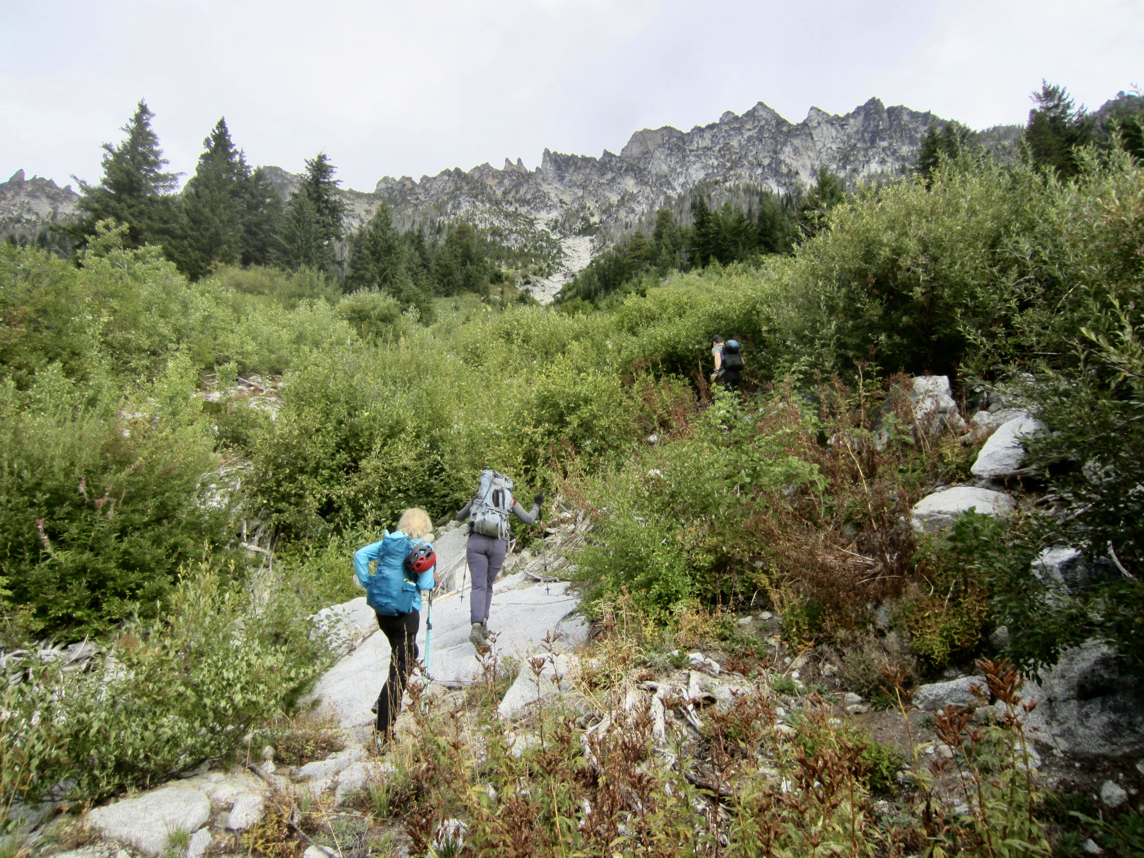 We awoke to an overcast morning and headed out with summit packs at 8:30am. After hiking downstream on Ingalls Creek Trail for ½ mile, we made a sharp left turn and began working straight upslope toward Argonaut Peak. Our ascent route took us through brushy jackstraw forest for 300 vertical feet, followed by horribly dense slide alder for another 1000 feet. This entire hillslope was a green purgatory, such that our rate of progress was frustratingly slow—a meager 400 feet per hour!