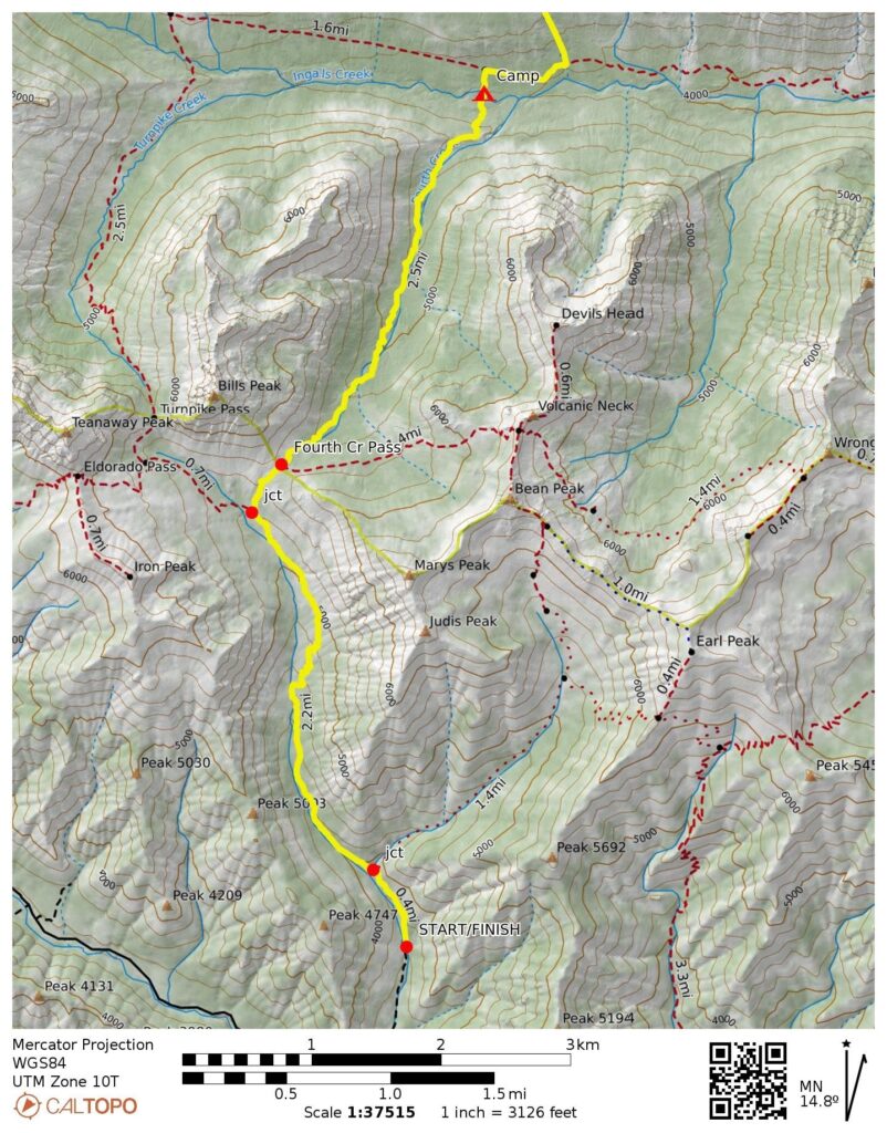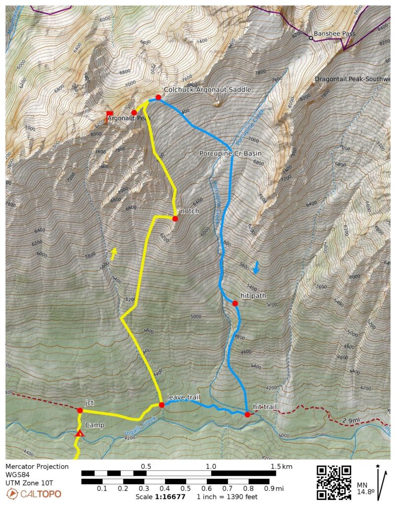 Sidetrip: Ingalls Creek Trail junction & South Argonaut Creek crossing (trail hike); Southeast Argonaut Ridge notch & Porcupine Creek Basin & Colchuck–Argonaut Saddle & Northeast Argonaut Gully (bushwhack & off-trail hike & rock scramble)