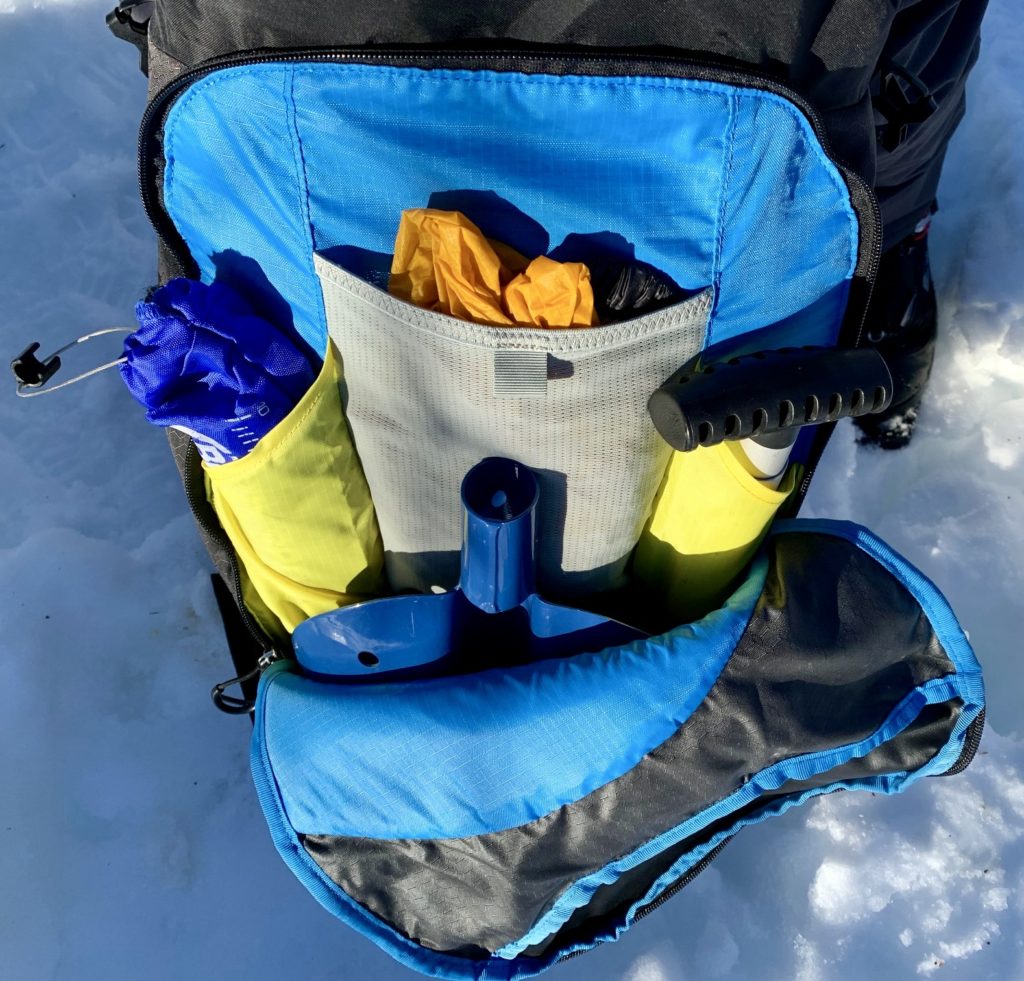 The Soelden 42 is loaded with convenience and organizational features, most important of which is an easily accessible avalanche safety pocket. This pocket has a J-shaped zipper opening and several internal sleeves for holding a shovel blade, shovel handle, probe, study kit, and other items. I’ve seen many snow packs that have ridiculously small avalanche safety pockets, but this one is roomy enough to accommodate all of my avalanche gear plus a large repair kit and raincover.