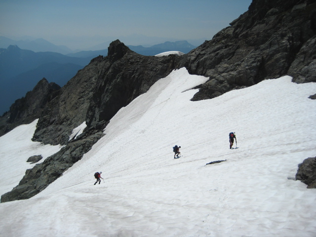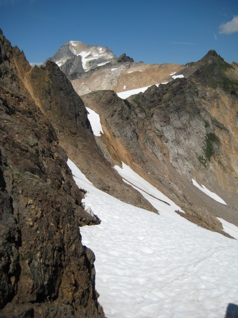 Although a climb of Hagan’s main peak had been on our agenda, we passed it up due to time concerns. Instead, we ducked through a dike-notch at the glacier’s northern edge, then traversed firm snow to reach a rotten bedrock gully (Class 3) that led back up to the Hagan–Blum crest.