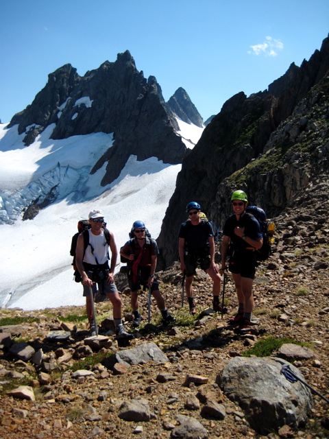 For our seventh annual Mid-Summer Climbing Trip, Jon, Eric, Adam, Todd, and I completed the Bacon-Hagan-Blum Traverse. This was particularly satisfying for me because I’d been waylaid by a broken ankle after getting about halfway through the Blum-Hagan-Bacon Traverse in 2007. This time, I figured I could best redress my past misfeasance by traveling in the opposite direction, thereby sneaking up on my demons from behind. It wasn’t easy, but it worked!