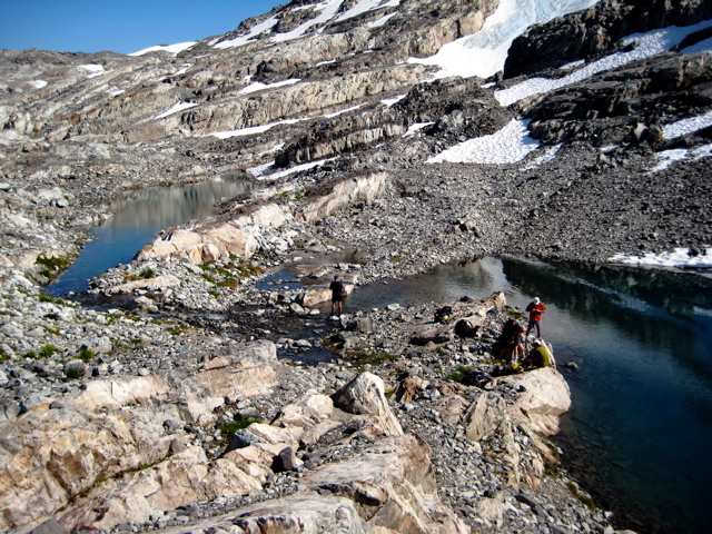 Leaving the summit behind, we quickly descended more snowslopes to the “Bacon Tarns,” a cluster of beautiful glacial-melt ponds on a rock bench below the Green Lake Glacier. The clear, frigid water ensured a very short but refreshing dip.