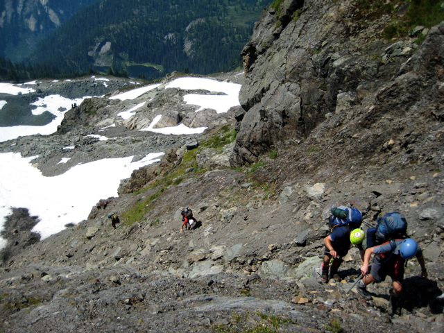 This was a day that looked easy on paper but turned out to be frustratingly long and painful. We contoured around to the west-trending crest of Blum Creek ridge at 5100 feet, hoping to find the faint fisherman’s path. Several hours and two handline rappels later, we stumbled across the path…then lost it…then regained it. This process repeated itself numerous times until we reached the most-welcome Baker River valley bottom, feeling drained and parched from the hot, humid, waterless descent.
