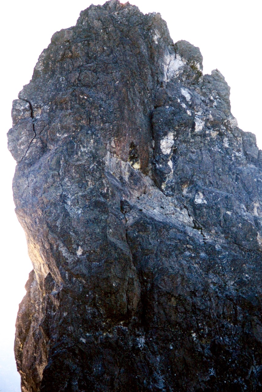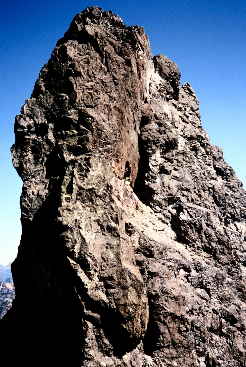 Once above the gully constriction, the angle eased slightly and the scrambling became more Class 2-3. We stopped at the “white fan” for a snack, then veered rightward up heather slopes and broken rock, finally reaching the ridge crest at the second notch left (northwest) of the summit block. An easy scramble over the intervening point brought us to the deep notch directly beneath the summit (3.2 hours from camp). This close perspective on the summit block, which is very steep on the right side and overhanging on the left side, gave us some trepidation. “Yikes! We have to climb that?”