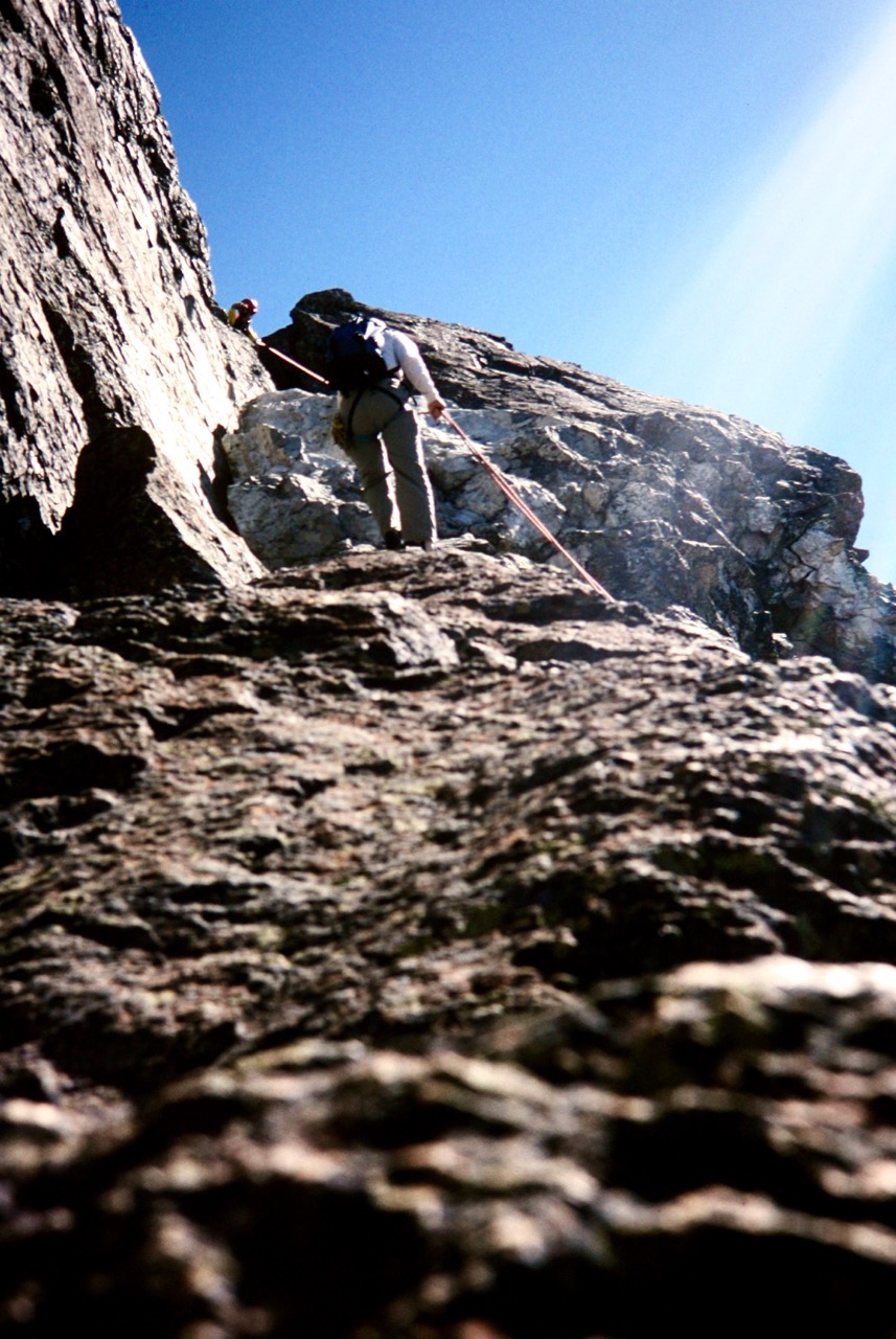 We donned harnesses and rock shoes and prepared two small summit packs. Possibly because I had carried up the gear rack, Mike and Kevin elected me to lead the summit block. The first pitch starts out on well-broken Class 3-4 rock but abruptly becomes quite steep—even bulging slightly—halfway up, and suitable cracks are difficult to find. I managed a decent stopper placement just below the bulge and then traversed rightward… then leftward…then rightward again…then leftward again. Nothing looked particularly easy or protectable, but I found an old knifeblade piton on my fourth traverse. Ahh, this must be the way. I clipped the piton and gave it a test jerk. It shifted about 3 inches (gulp!), so I placed a small, questionable stopper above it.