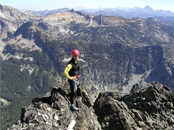 I placed several stoppers and cams en route to the final chockstone pull-up. We all enjoyed the climbing on this pitch immensely. A short Class 2 scramble then earned us the summit (6.0 hours from camp). I immediately waved at Laura in the chance she might be watching. (It turned out that she was, indeed, monitoring our entire climb through binoculars.)