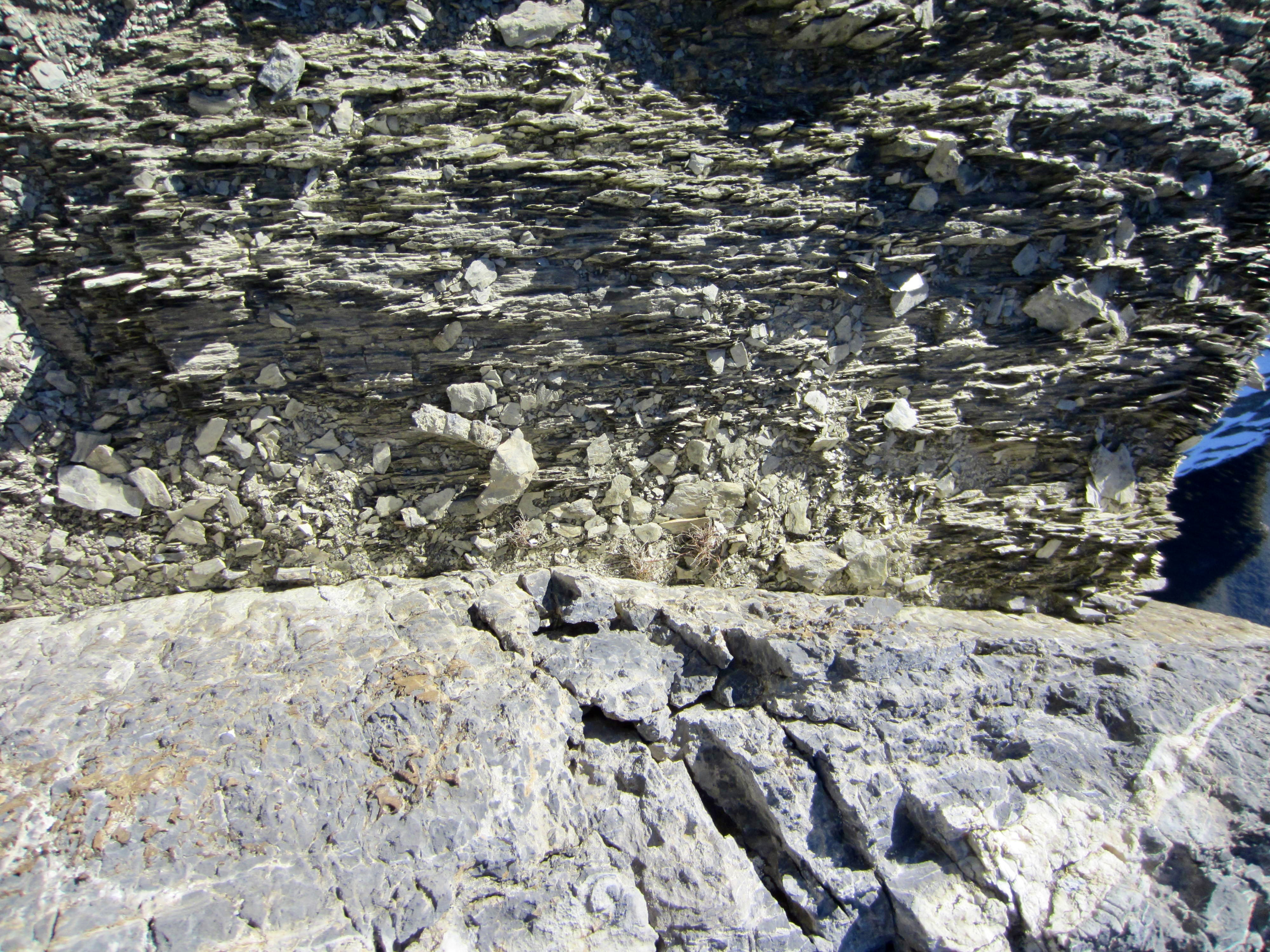 The summit block of Beaverhead Peak consists of steeply dipping, interlayered shale and limestone, which results in highly convoluted terrain. Because the limestone is relatively resistant to erosion, it forms pronounced ledges, fins, and parapets. The shale, in contrast, is very erodible and forms narrow gullies and slots between the limestone.