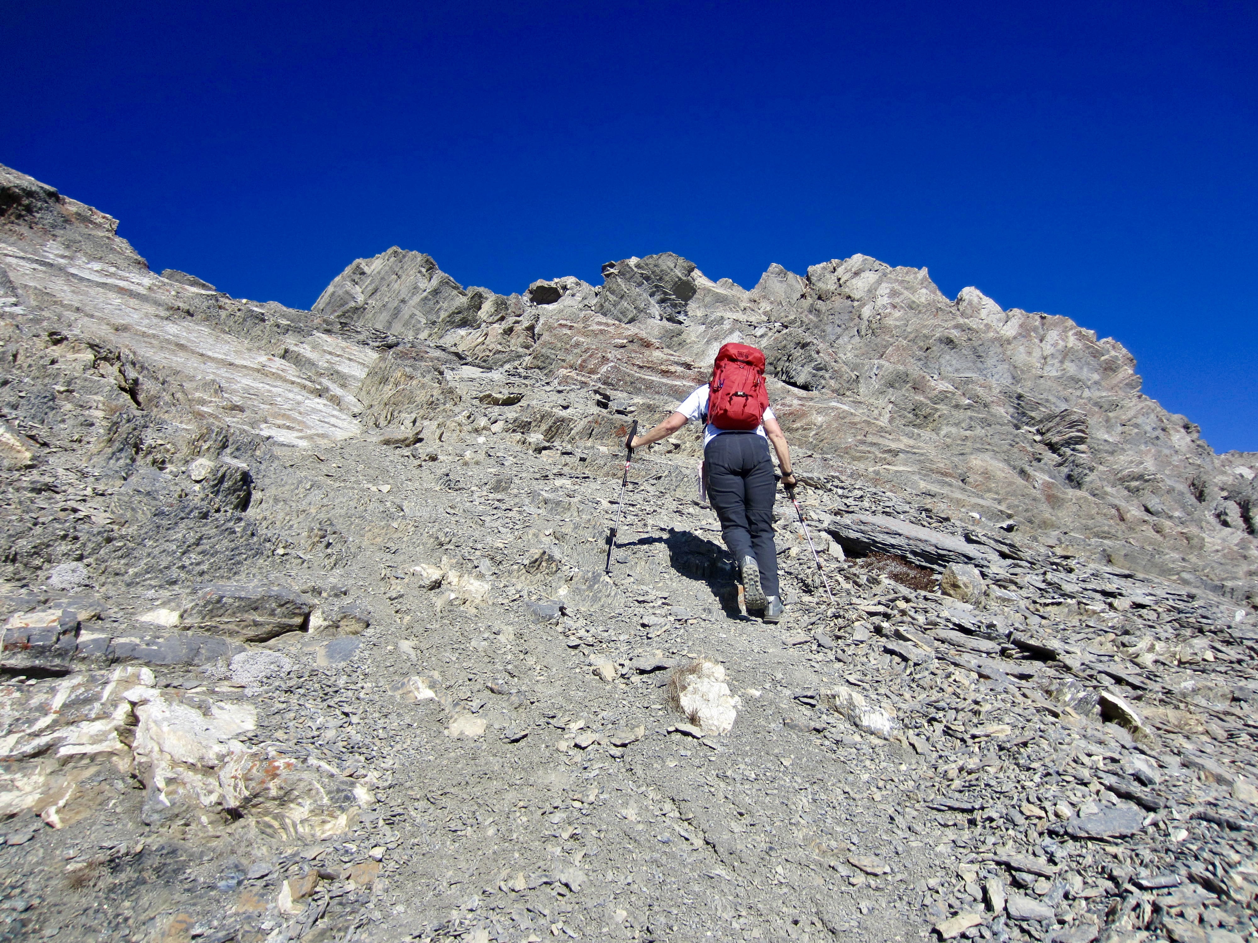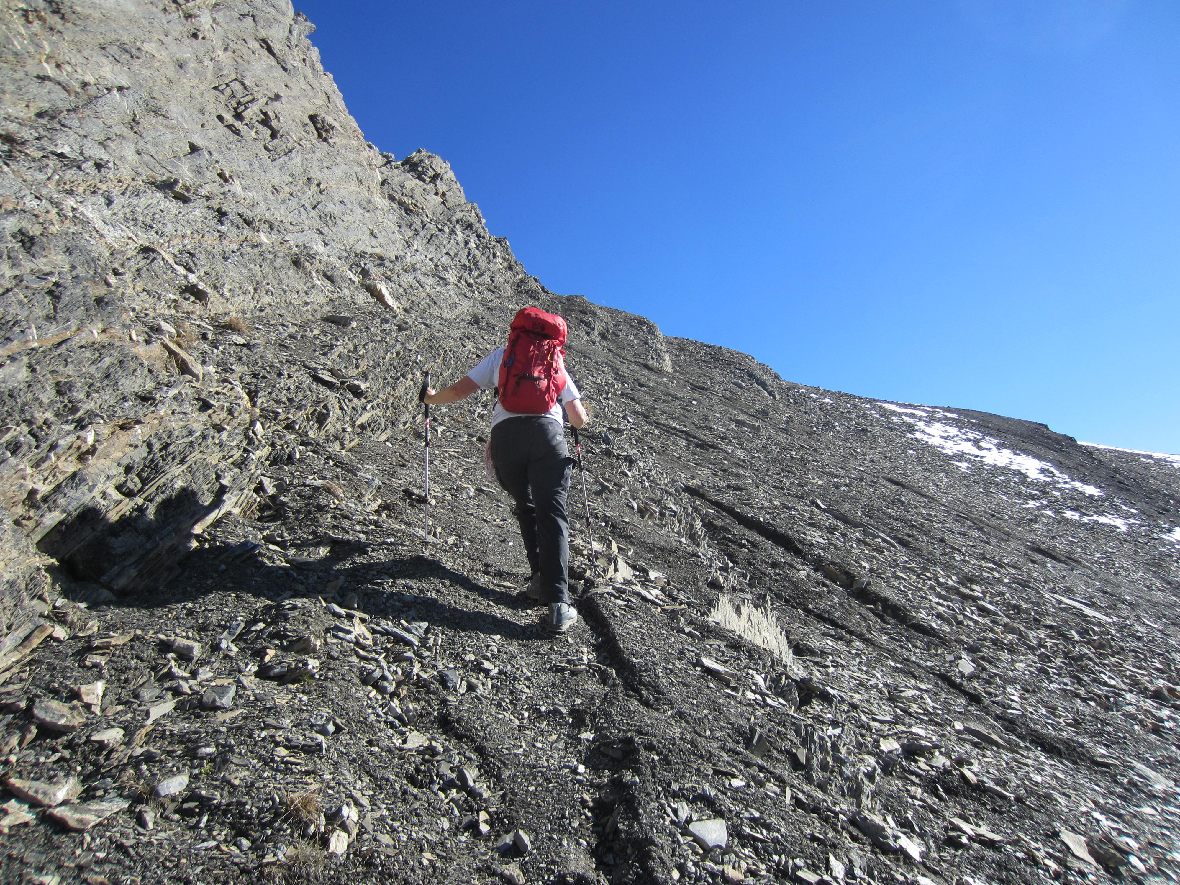 The knoll gave us a clear view of the route ahead.  Multiple paths could be seen going up the northwest ridge, traversing rightward under the summit block, and disappearing around the southwest ridge. We headed up the highest path, which was little more than a boottrack stomped into the soft slope composed of disintegrated shale.