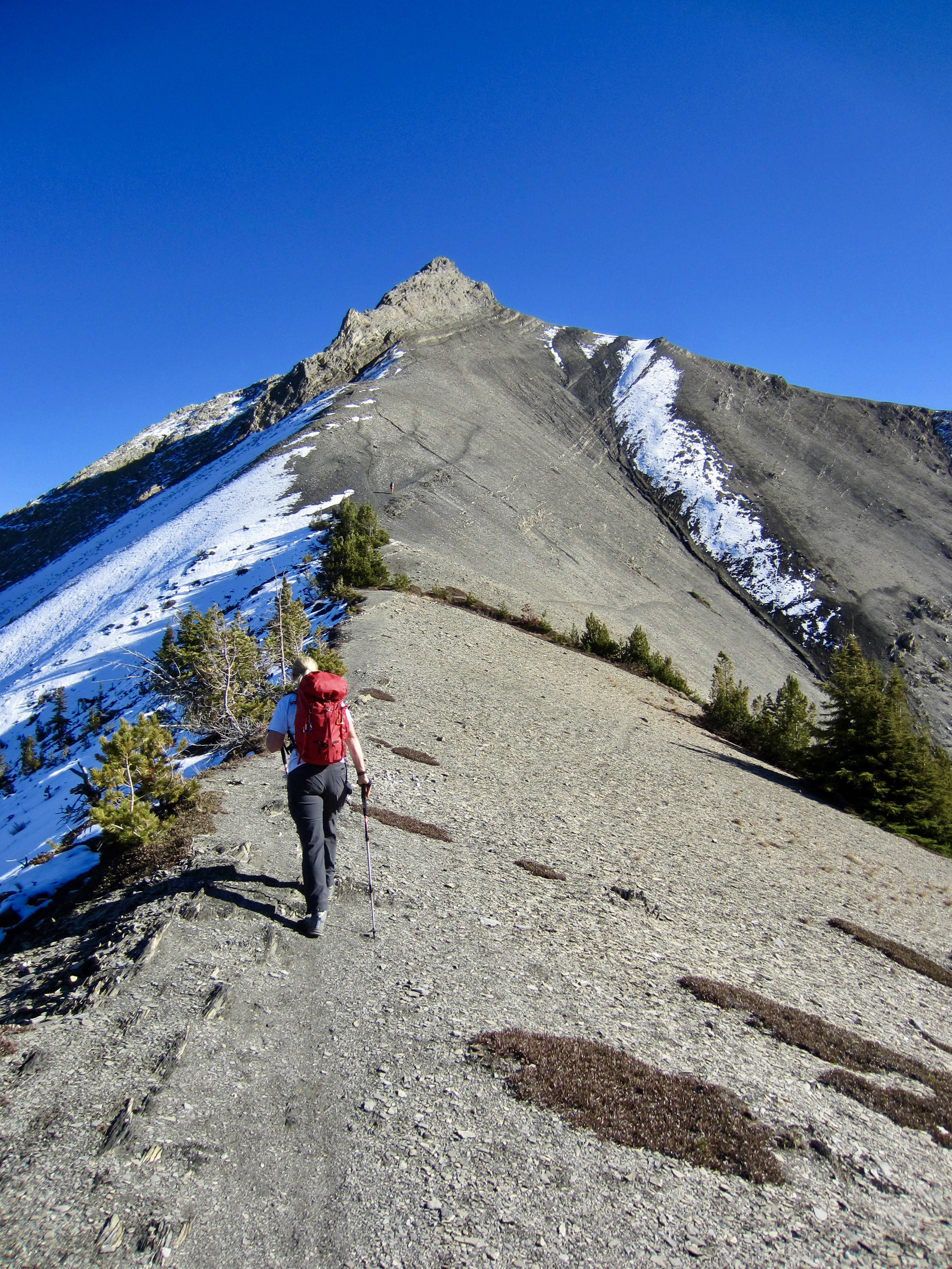 A lone hiker ascends a rounded ridge toward the summit of Beaverhead Peak in the Beaverfoot Range near Golden, BC.