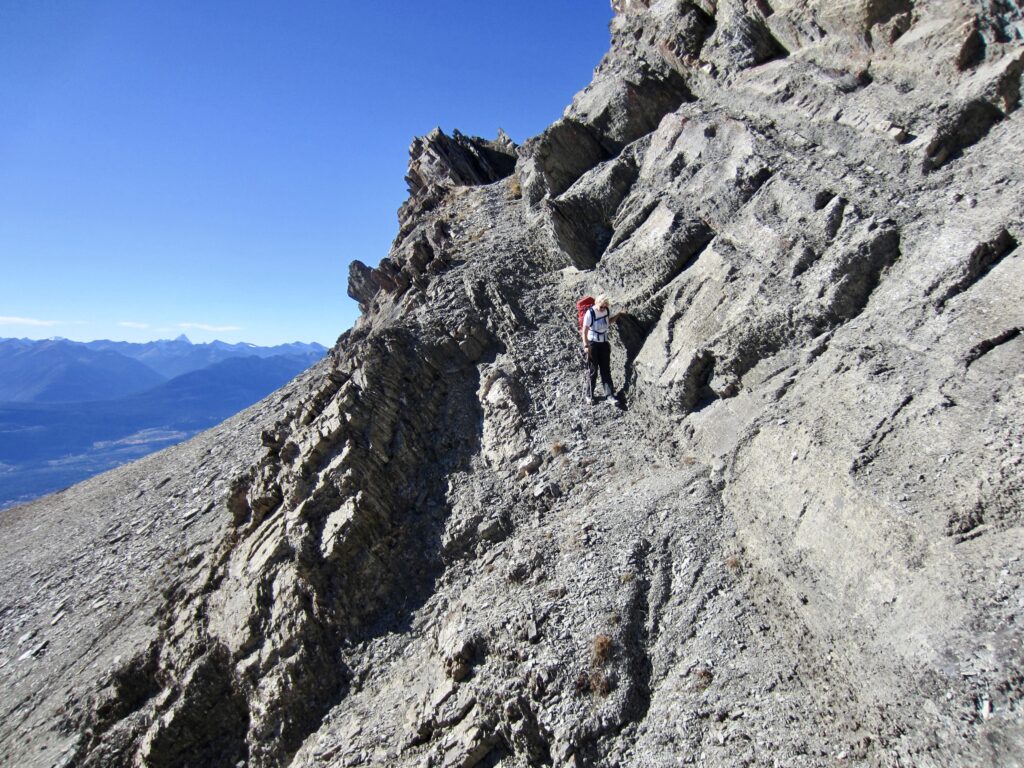 Upon reaching the upper-right corner of the west slope, we crossed over to the southern side of the peak’s southwest ridge.  The summit block stood over us, presenting several possible scramble routes.  We took an undulating rightward traverse that crossed over numerous rock ribs and gullies by means of ramps, slots, and ledges, .  We could never see past the next rib, but there was always a reasonable Class 2 or 3 scrambling route ahead.