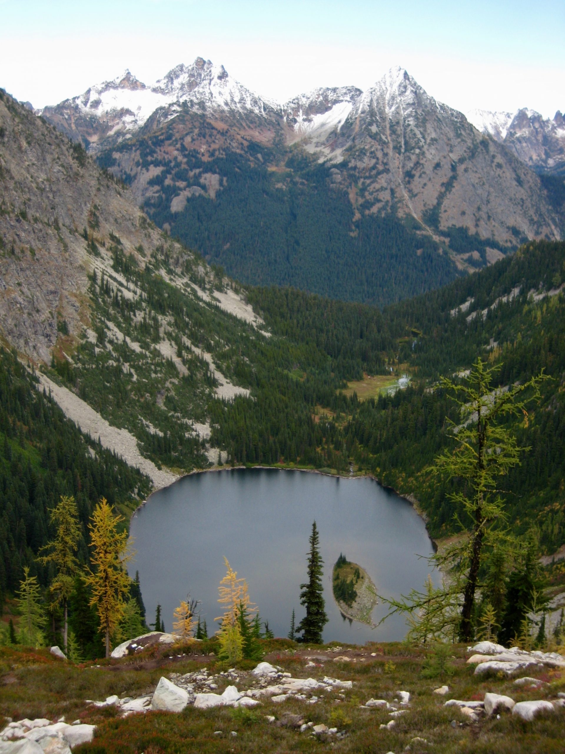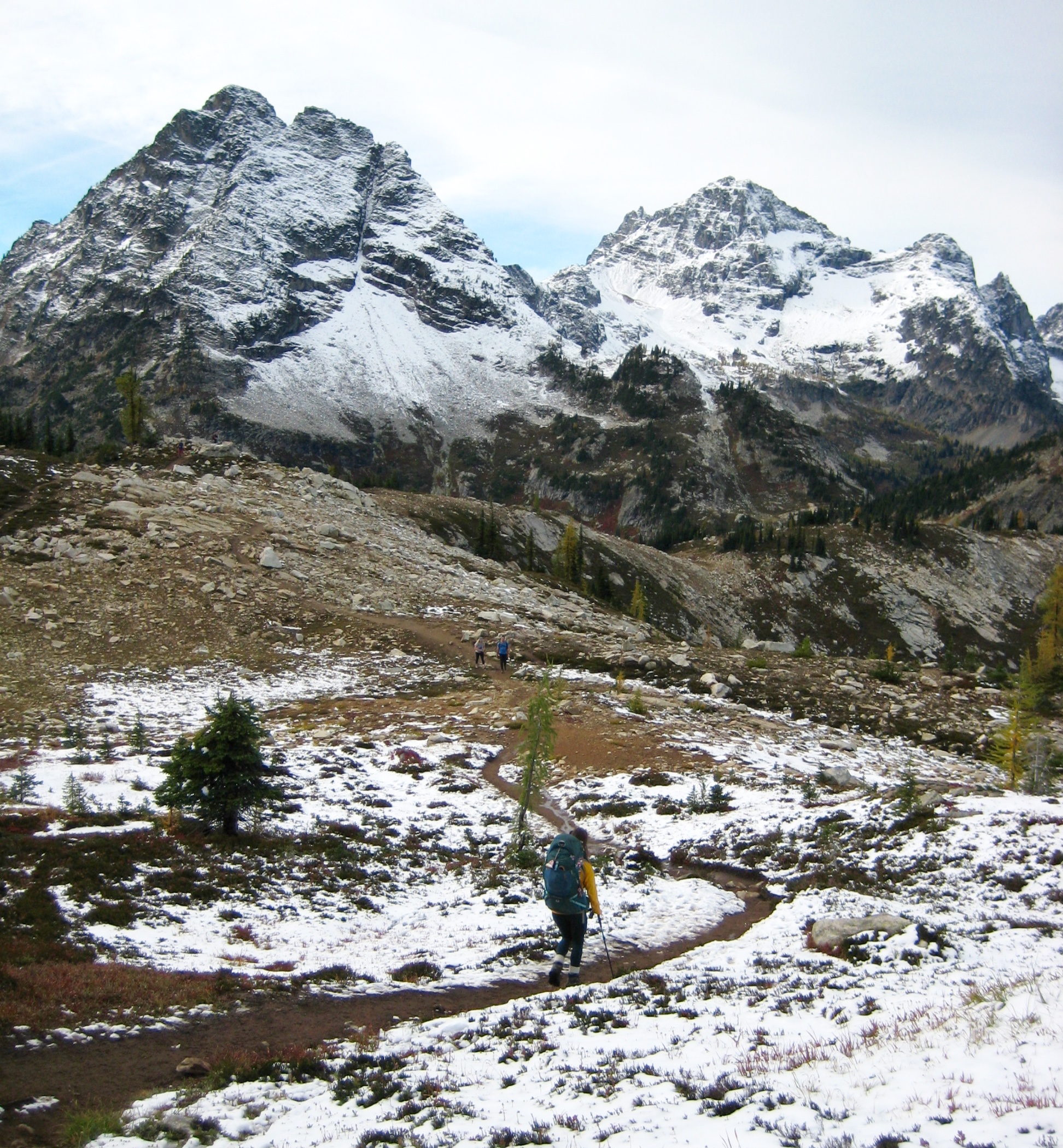 We headed out on the Maple Pass Loop Trail, following a clockwise route up Rainy-Ann Ridge to Maple Pass.  Several hundred day-hikers were coming down the opposite direction, which somewhat hindered steady progress.  The autumn foliage and larch trees appeared to be shy of full color, but the whole scene was enhanced by a skiff of fresh snow on all the surrounding peaks.