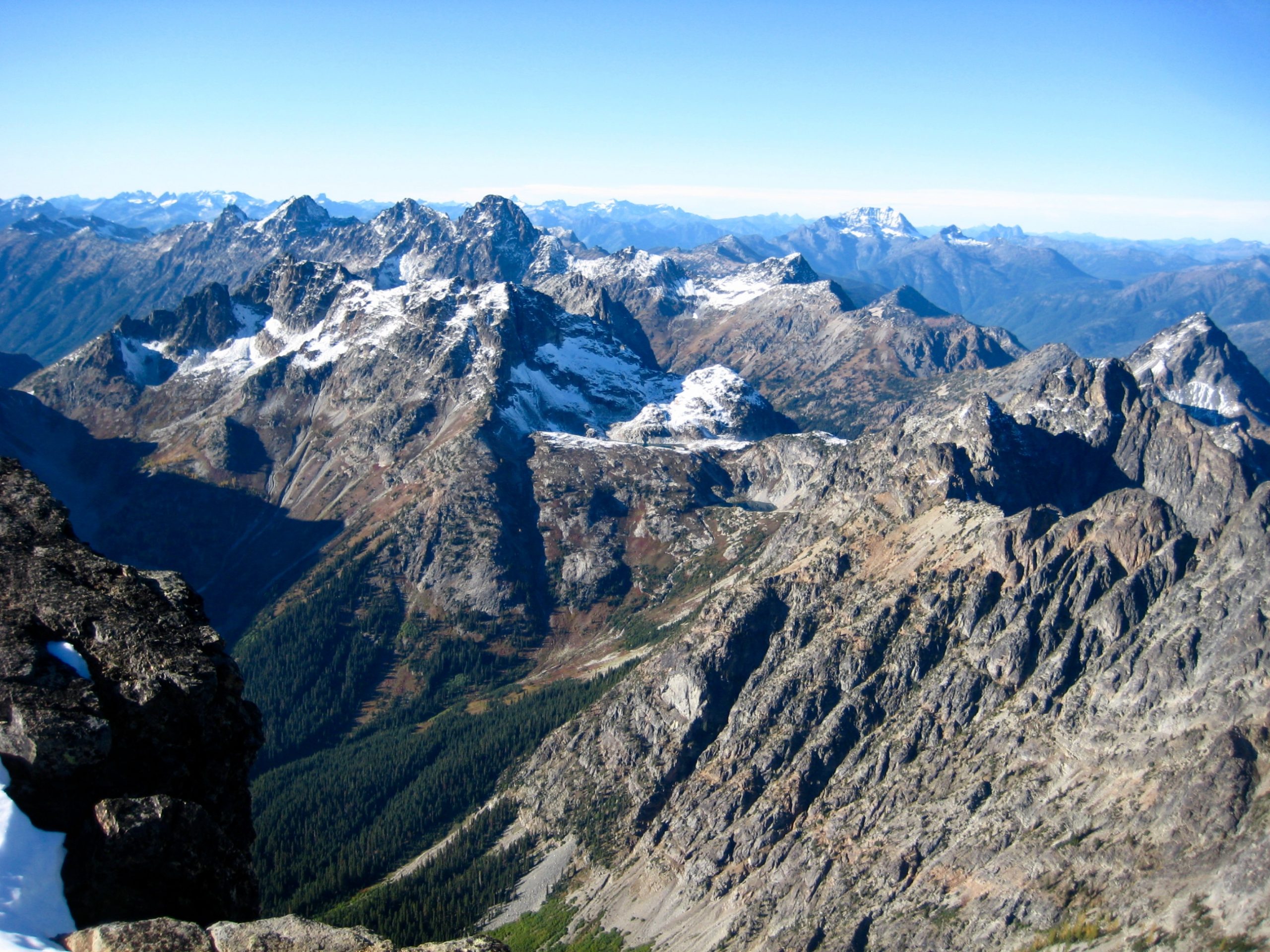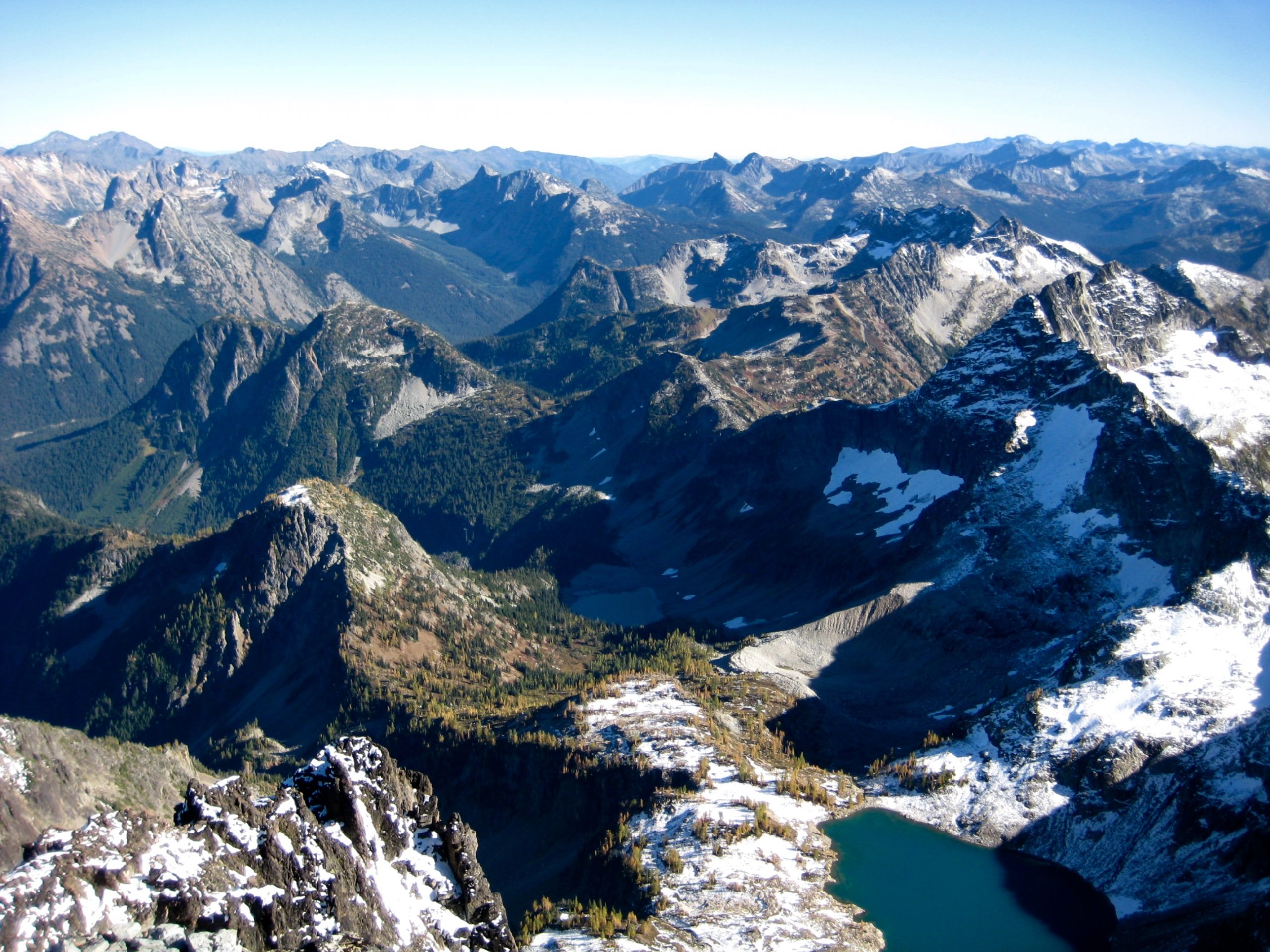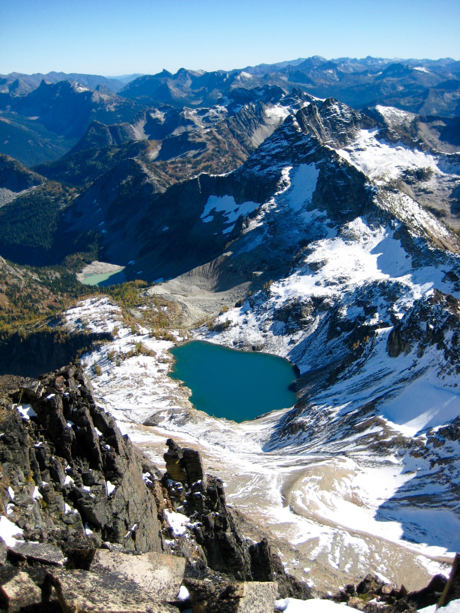 Looking down at Wing Lake and Lewis Lake from Black Peak in the North Cascades