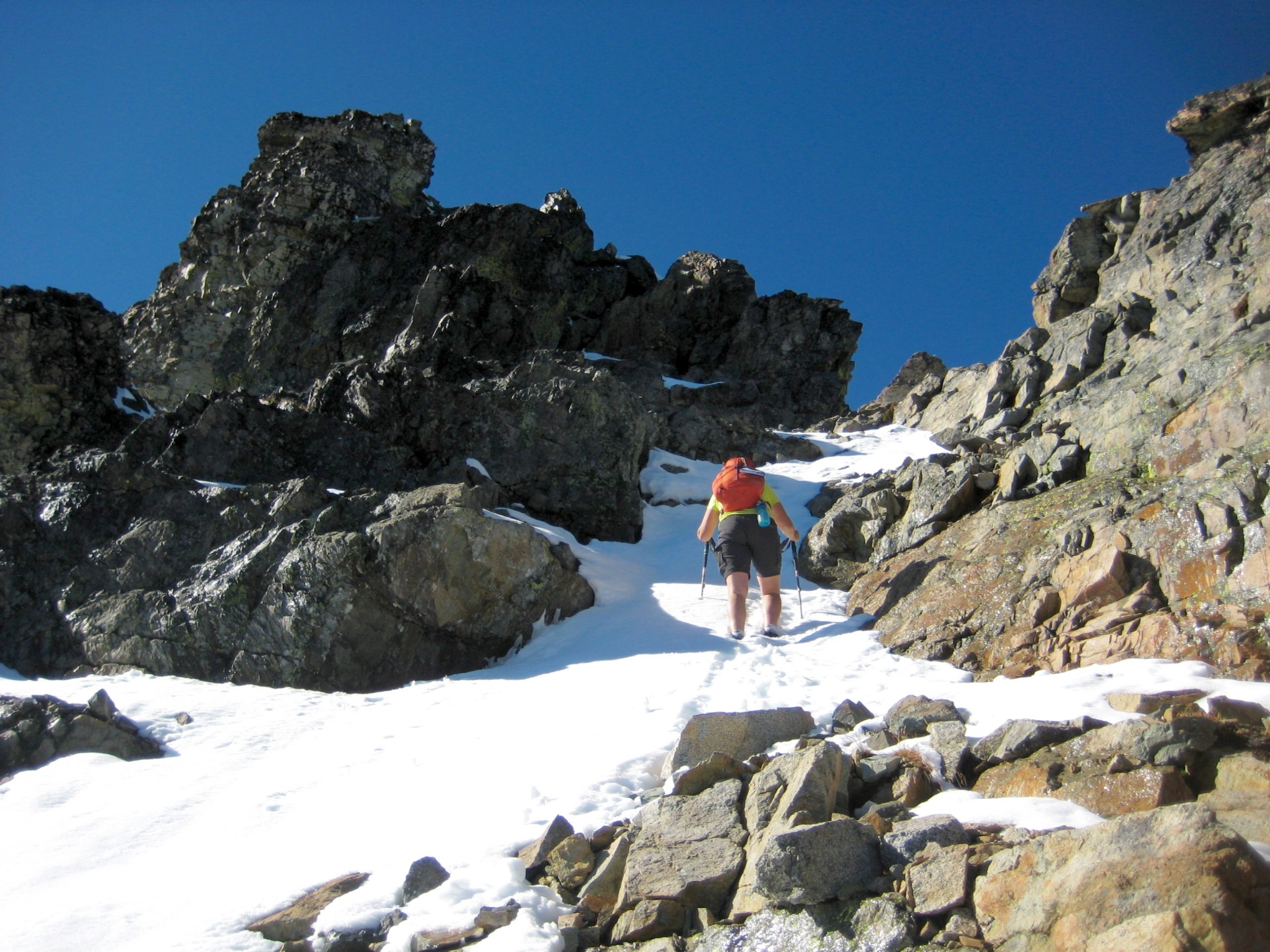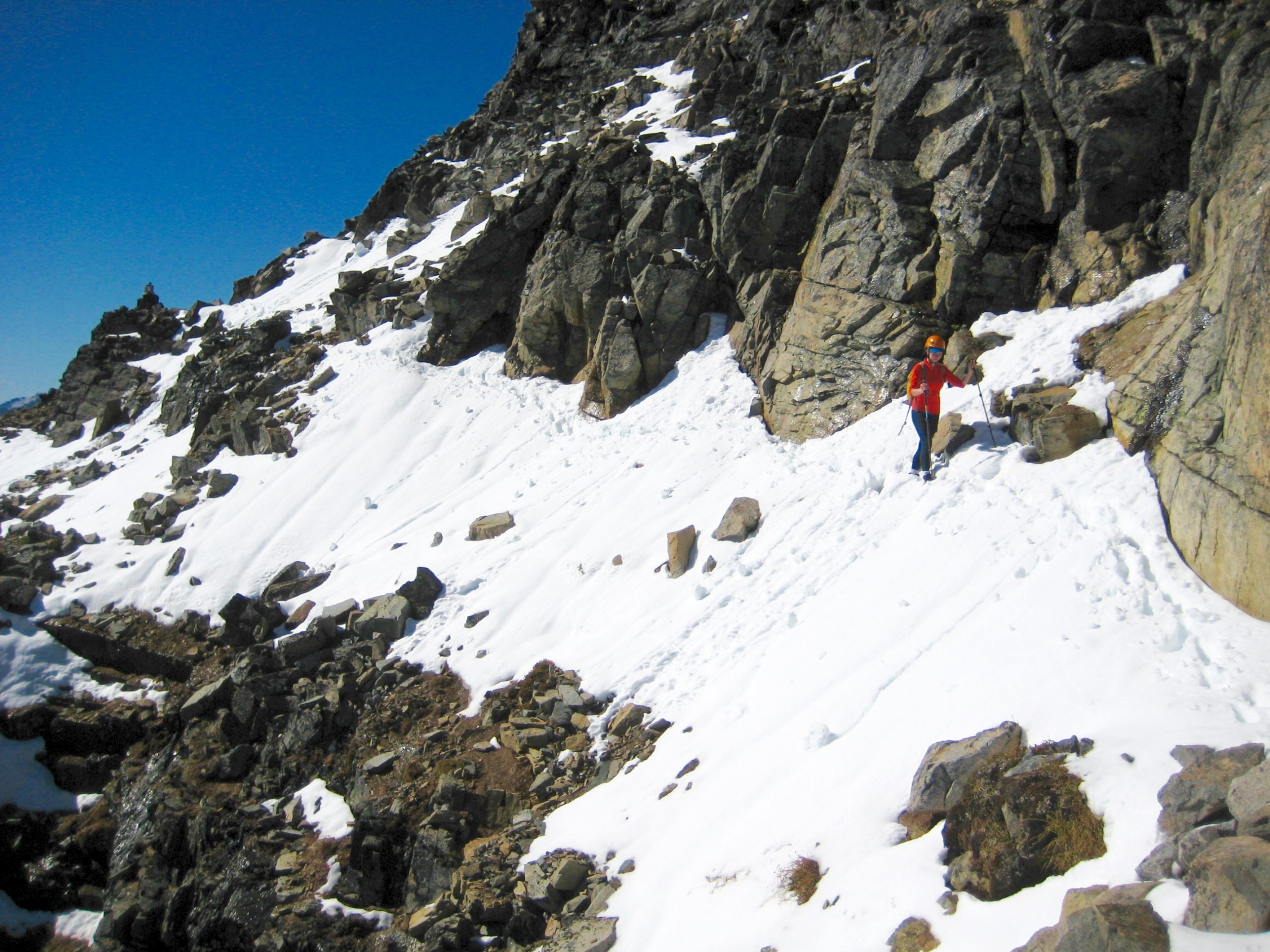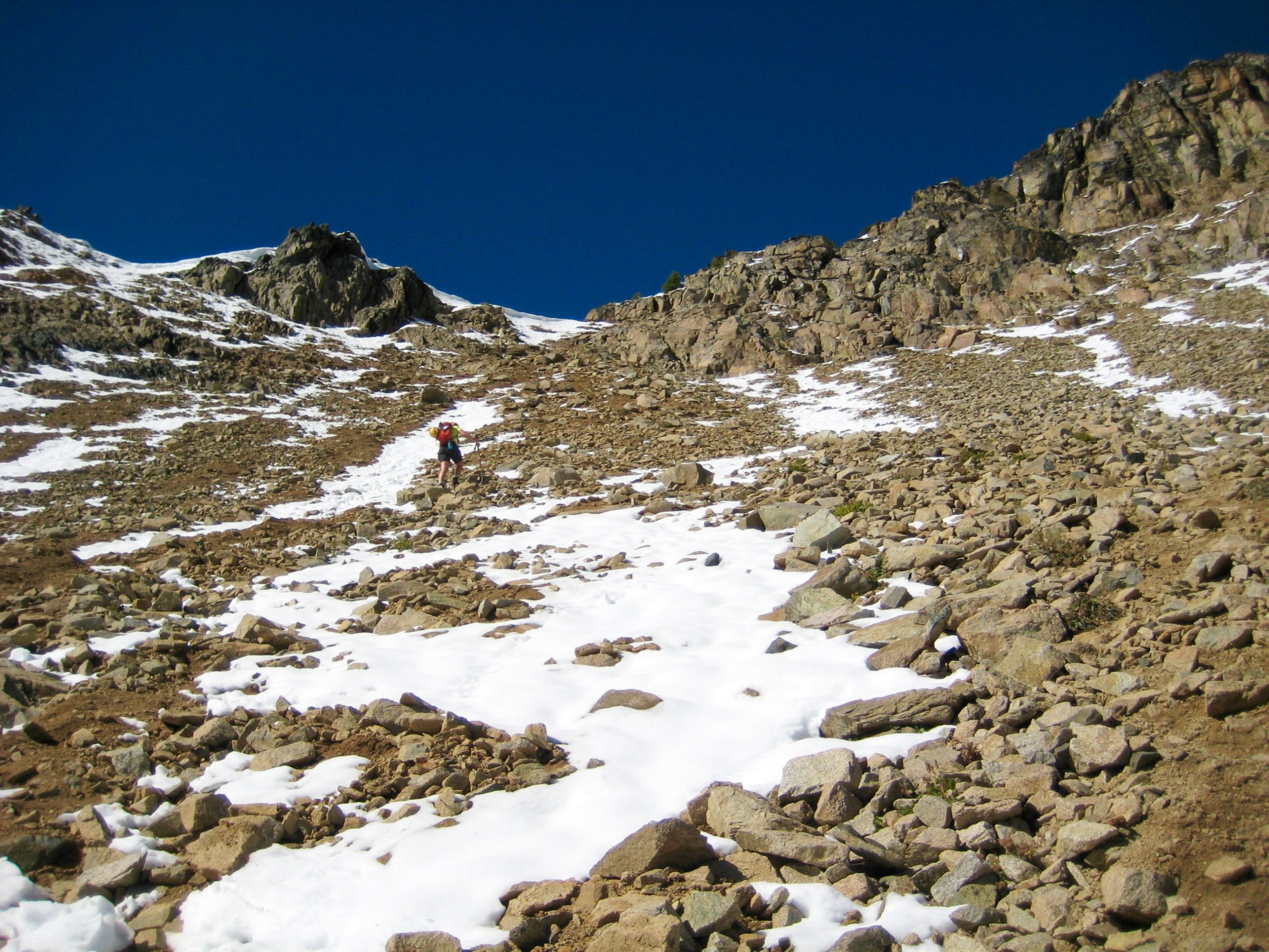 Continuing past Wing Lake, we ascended a broad couloir on Black Peak’s southeastern flank.  This couloir was filled with snow but the margins were mostly bare.