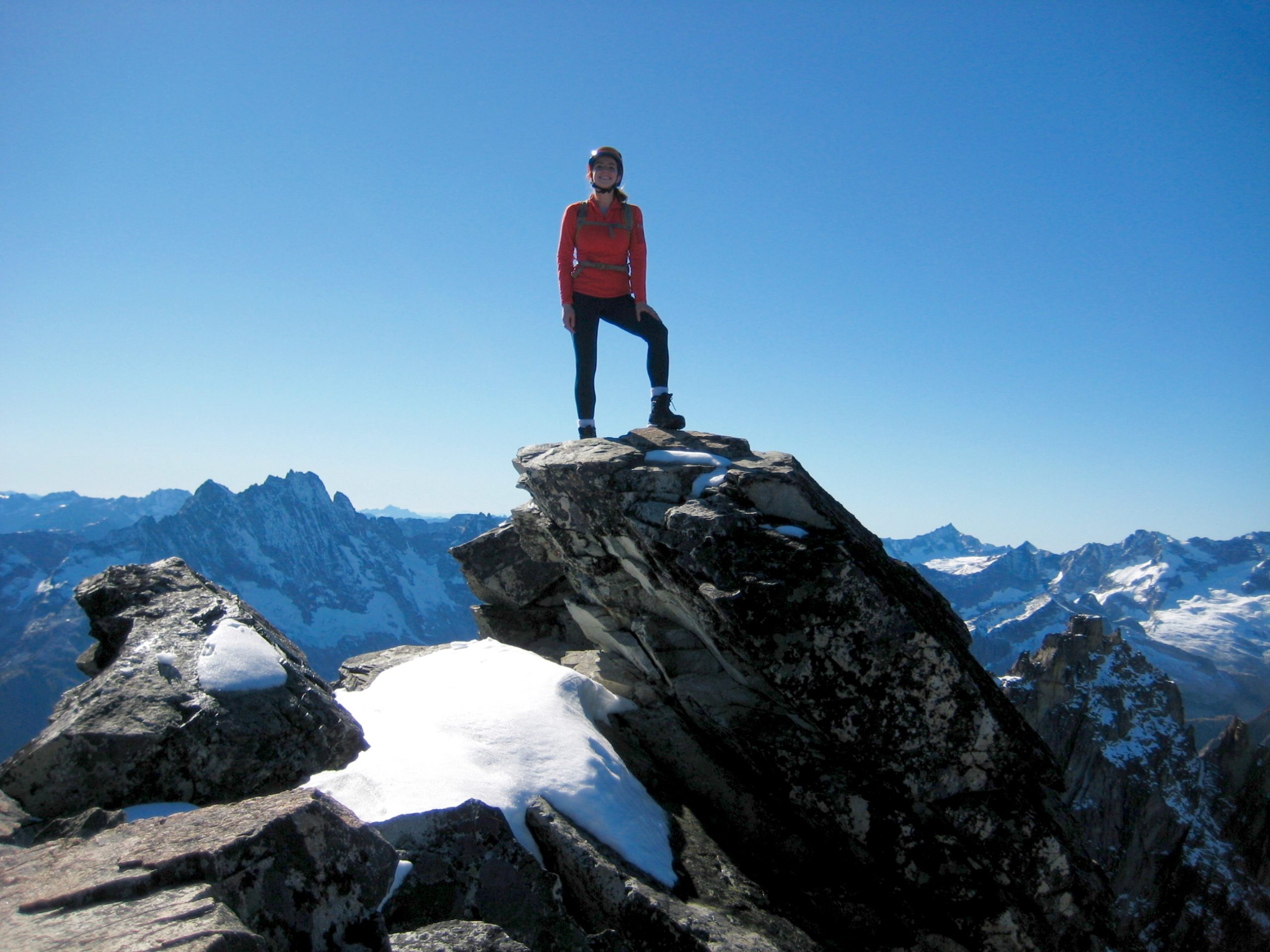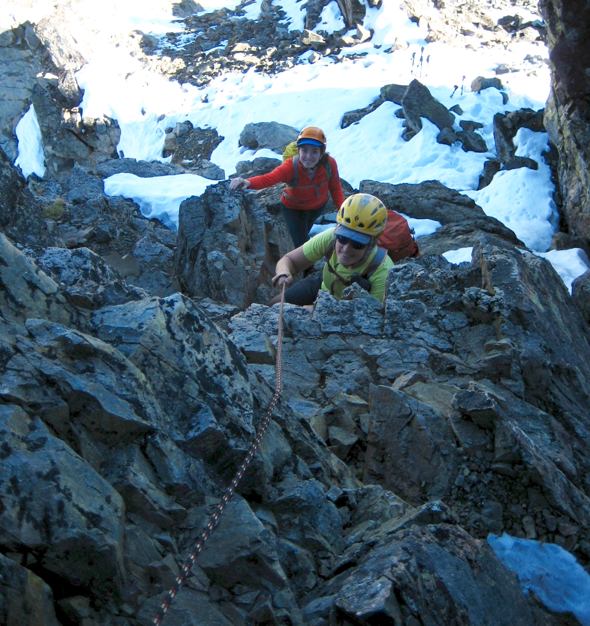 In order to safely scramble up the final 35 feet of wet and snow-covered Class 3+ rock, we used our panic rope as a handline.  By 3:00pm (5.4 hours + 3300 feet from camp), we were all sitting on the lofty summit.