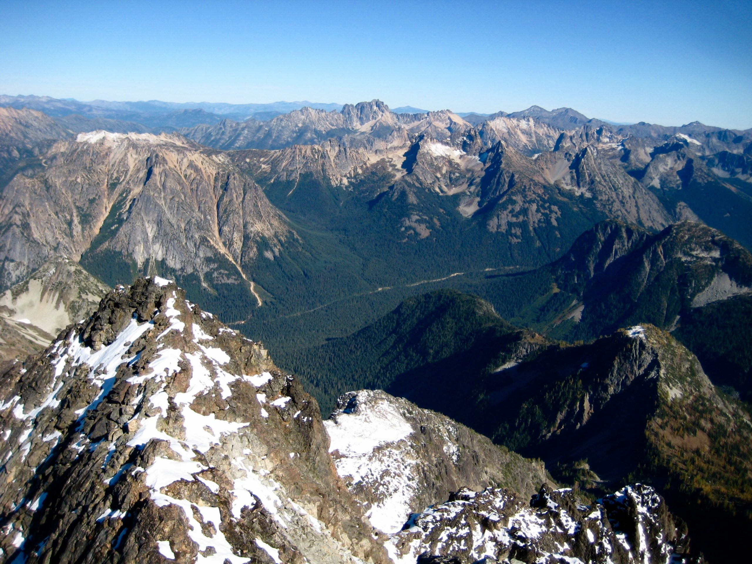 Upon reaching the top of the couloir, we were presented with a fabulous view of rugged, snow-dusted mountains in all directions.  Brooke had never really seen the North Cascades before, so she was understandably astounded.  Even old-timers like Eileen and me were awestruck.