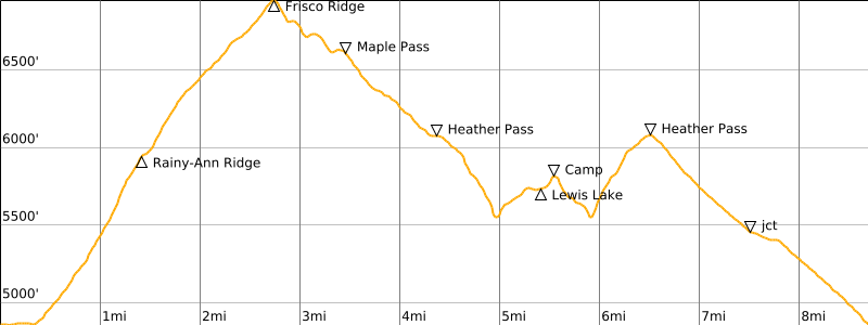 Way Points: Rainy-Ann Ridge shoulder & Frisco Ridge crest & Maple Pass & Heather Pass & Lewis Lake & Lewis Lake Knoll & Heather Pass & Lake Ann Trail junction (trail hike & off-trail hike)