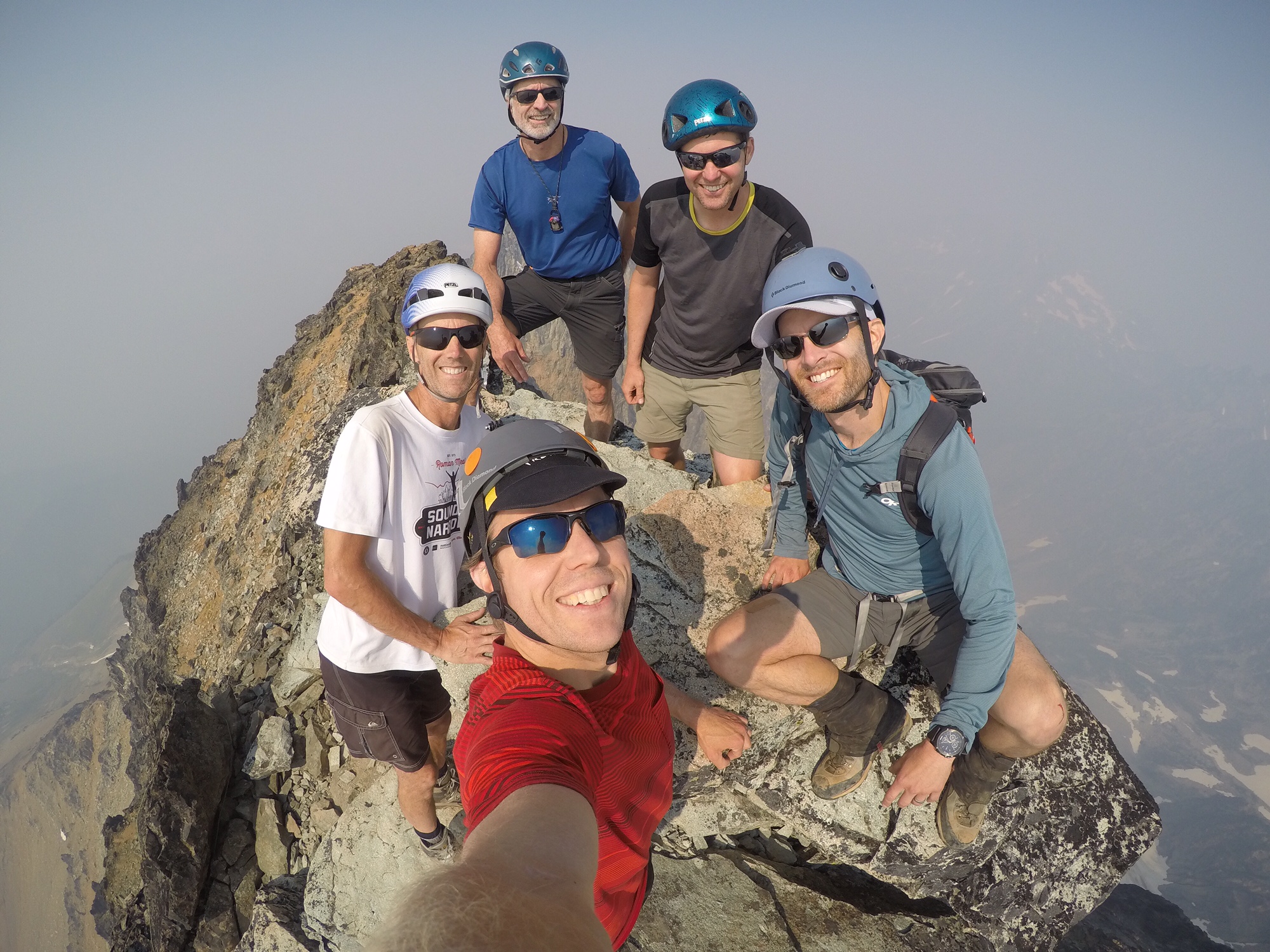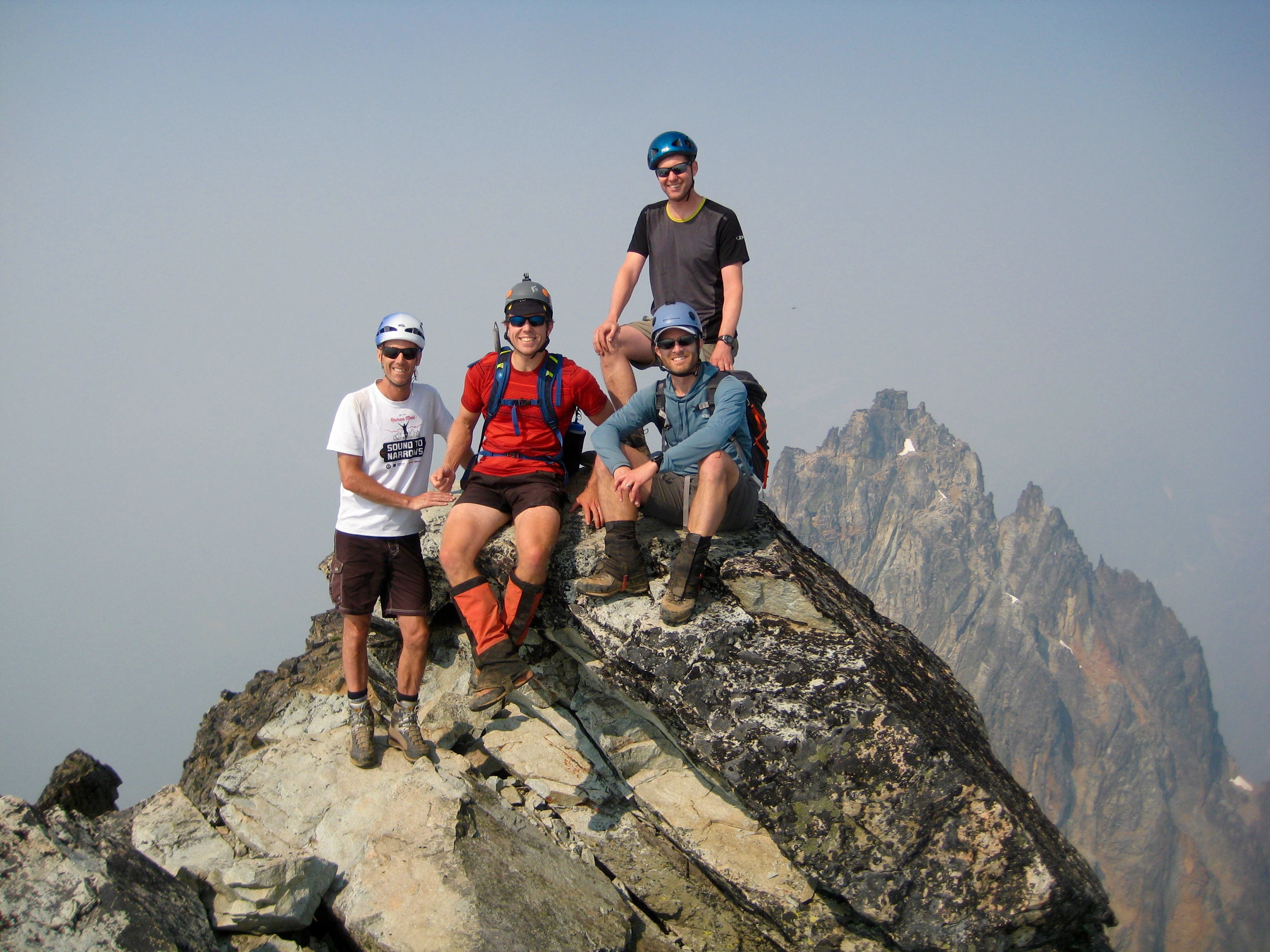 For our 15th annual Mid-Summer Climbing Trip, I teamed up with Jon, Todd, Eric, and Adam for a bid on Black Peak and Corteo Peak near Rainy Pass. This was actually a consolation trip, because our original plan was scuttled by the pervasive heat and smoke.  However, if we initially wondered how much fun could be had when an extreme-heat warning coincides with an air-quality advisory, the answer soon became pretty clear: A lot! An unexpected benefit of the heavy smoke was that it filtered out most of the sunlight, so the forecasted extreme heat never manifested itself.