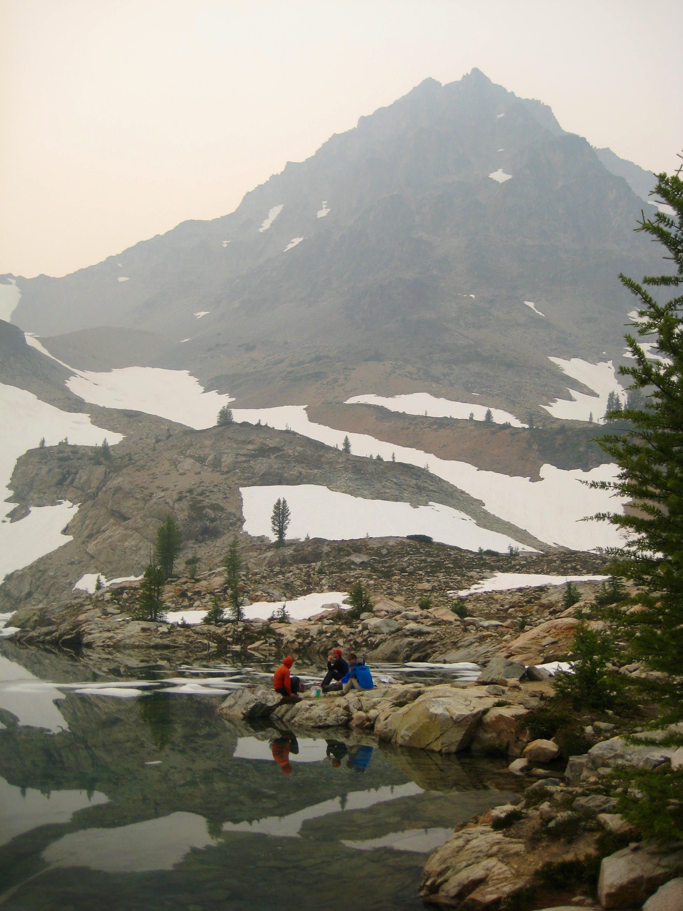 We arrived at the Heather Pass / Lake Ann Trailhead before noon and were immediately struck not only by the poor visibility but also by the strong odor of wood smoke hanging in the air. Remarkably, we became desensitized to the smell within a half hour and never really noticed it for the next several days.