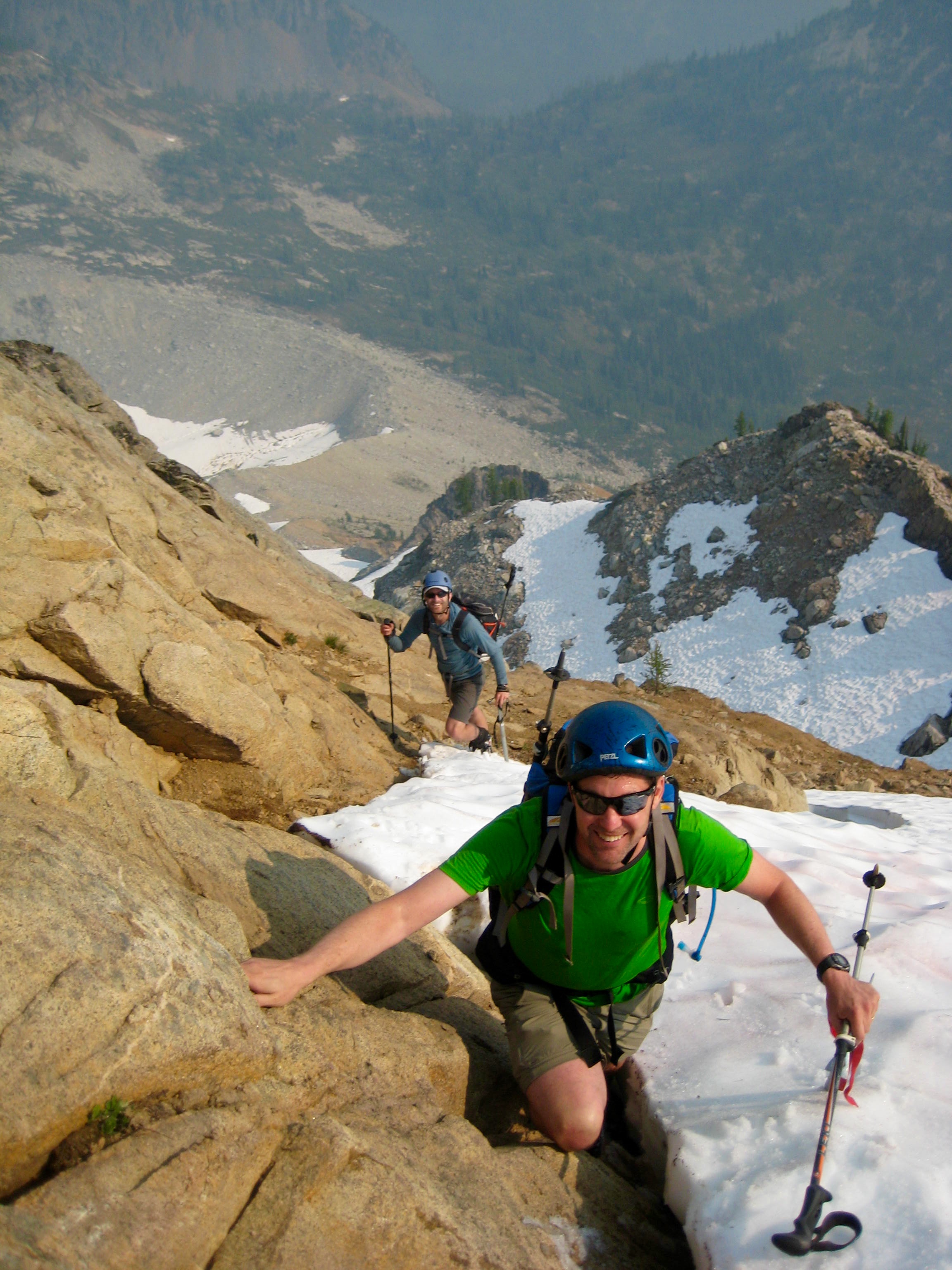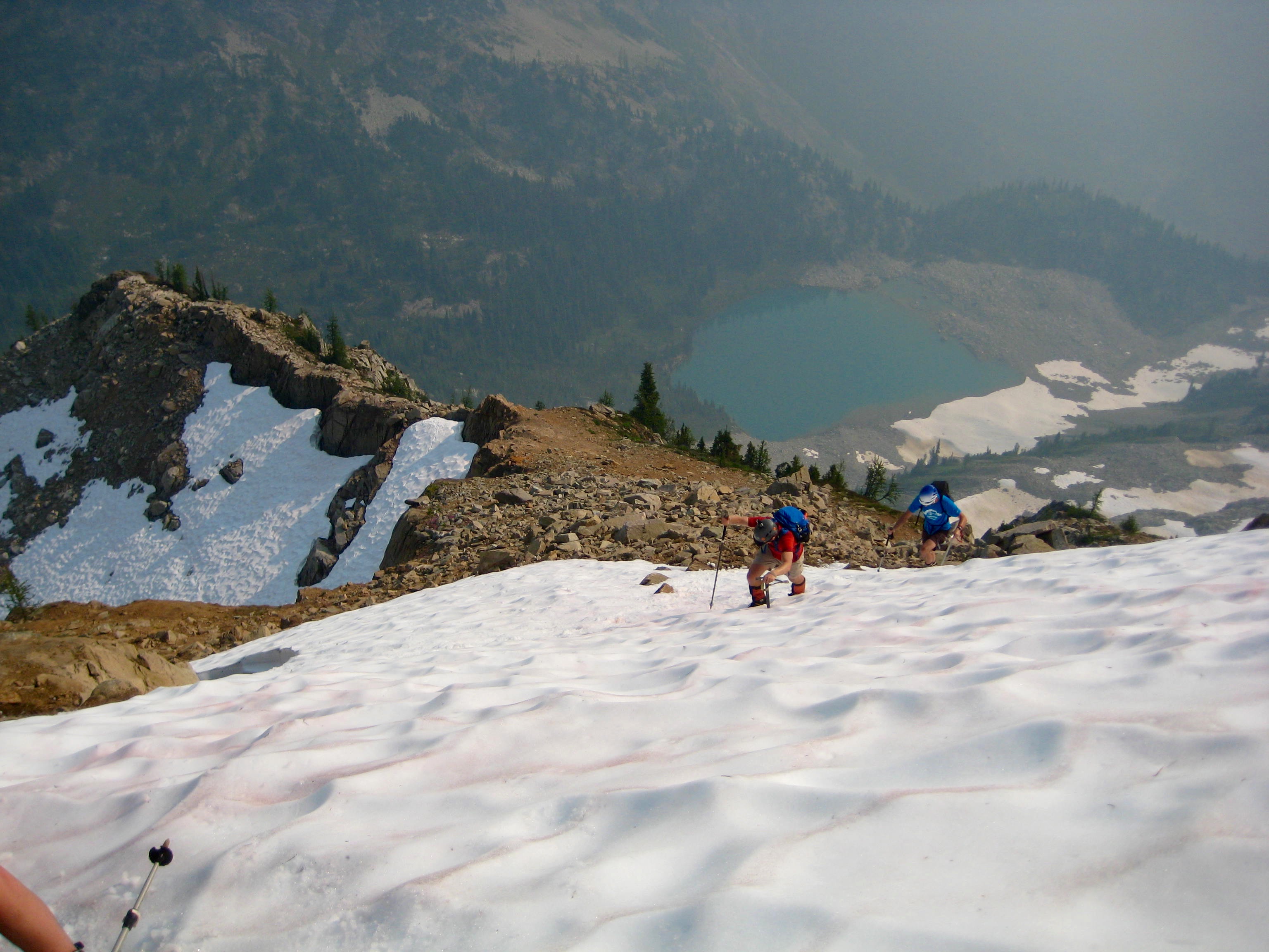 We circled around the lake and ascended an easy snow couloir that led to the south ridge. There was a solo climber ahead of us and a pair of climbers behind us; otherwise, we had this very popular mountain to ourselves.
