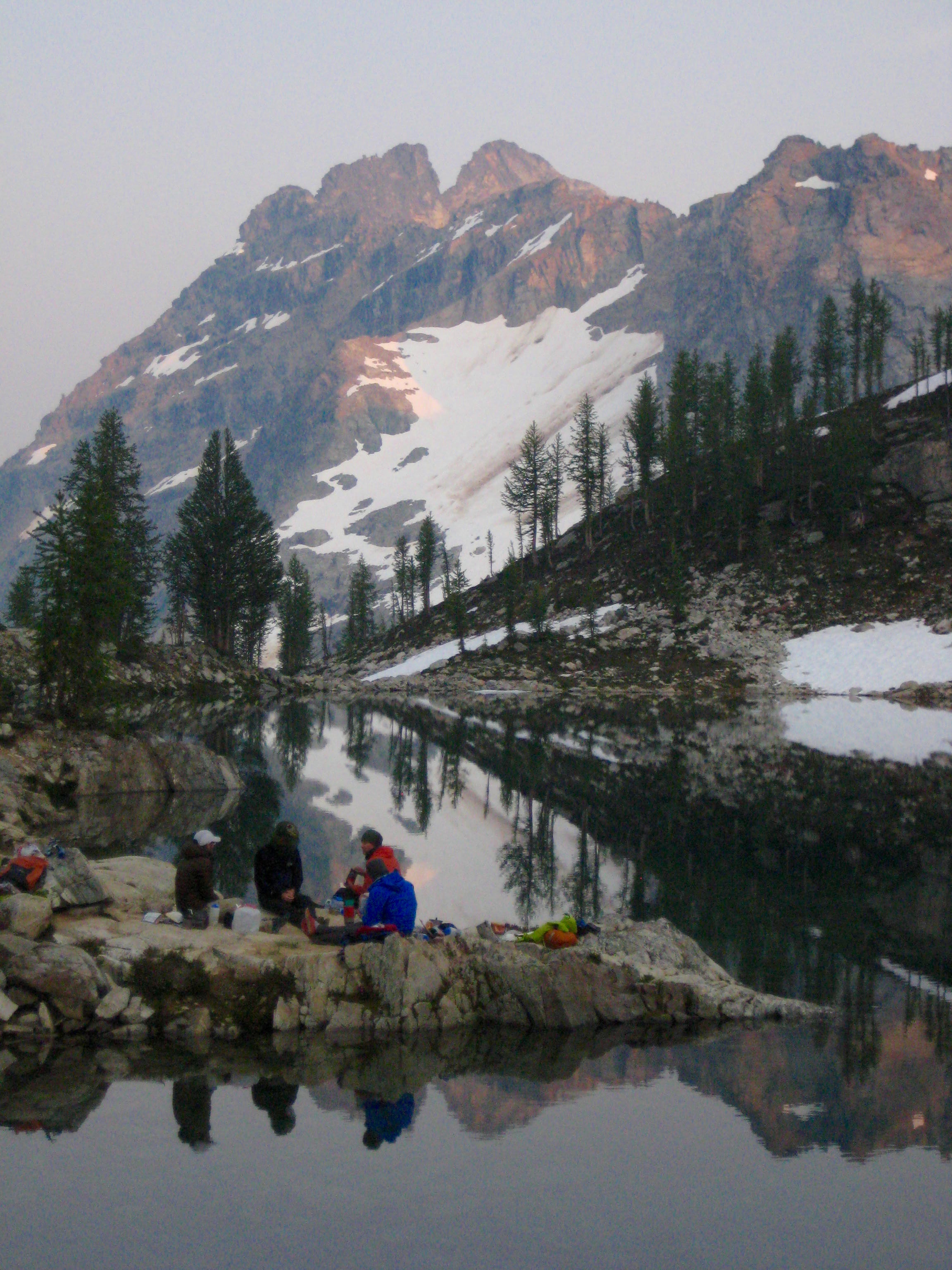 We carefully down-climbed the ridge crest with the protection of running belays, then retraced our back across the cirque, over the northwest ridge, and down the Lewis Glacier. It was early evening when we arrived at camp (4.3 hours from summit), and by now all of the weekend hikers and climbers had packed up and left. The lake once again felt peaceful and silent.