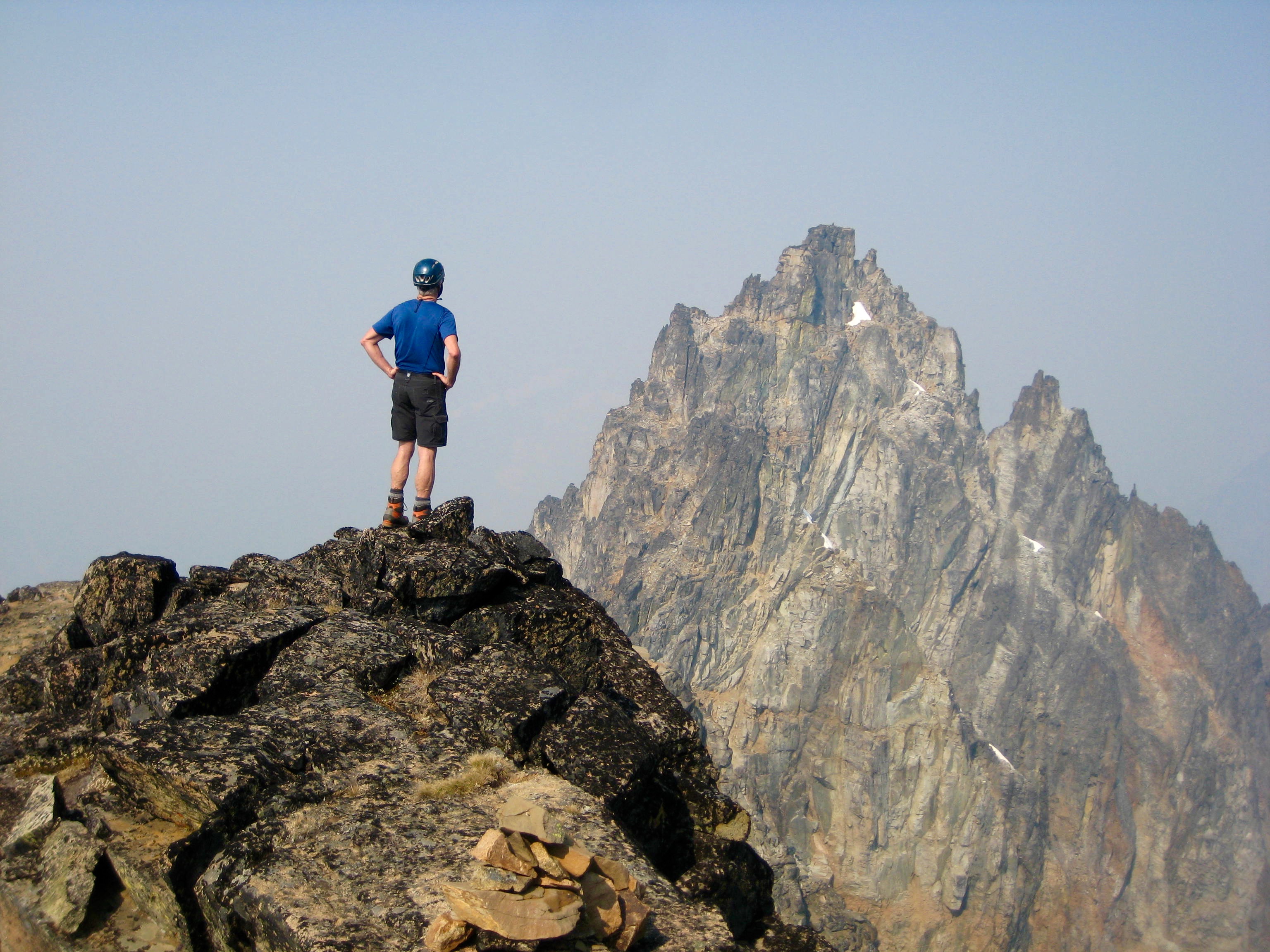 We reached the summit in late morning (2.1 hours from camp). Visibility was limited to a scant mile, but Black’s craggy satellite peaks were impressive in the ominous haze.