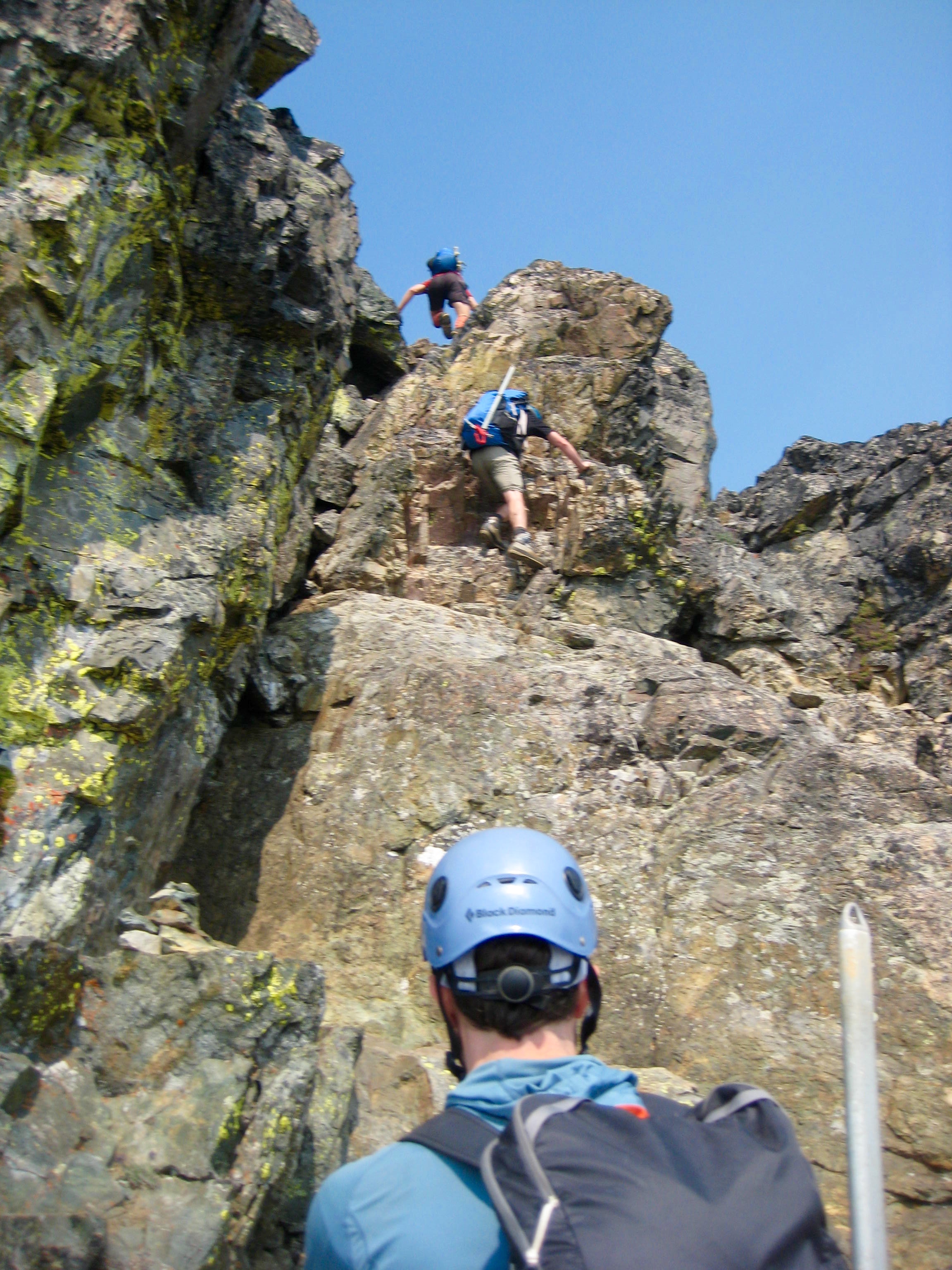 At a high platform above the chute, a rightward traverse took us around to the northeastern edge of the summit block. A short Class 3.5 scramble on good rock led to the top.