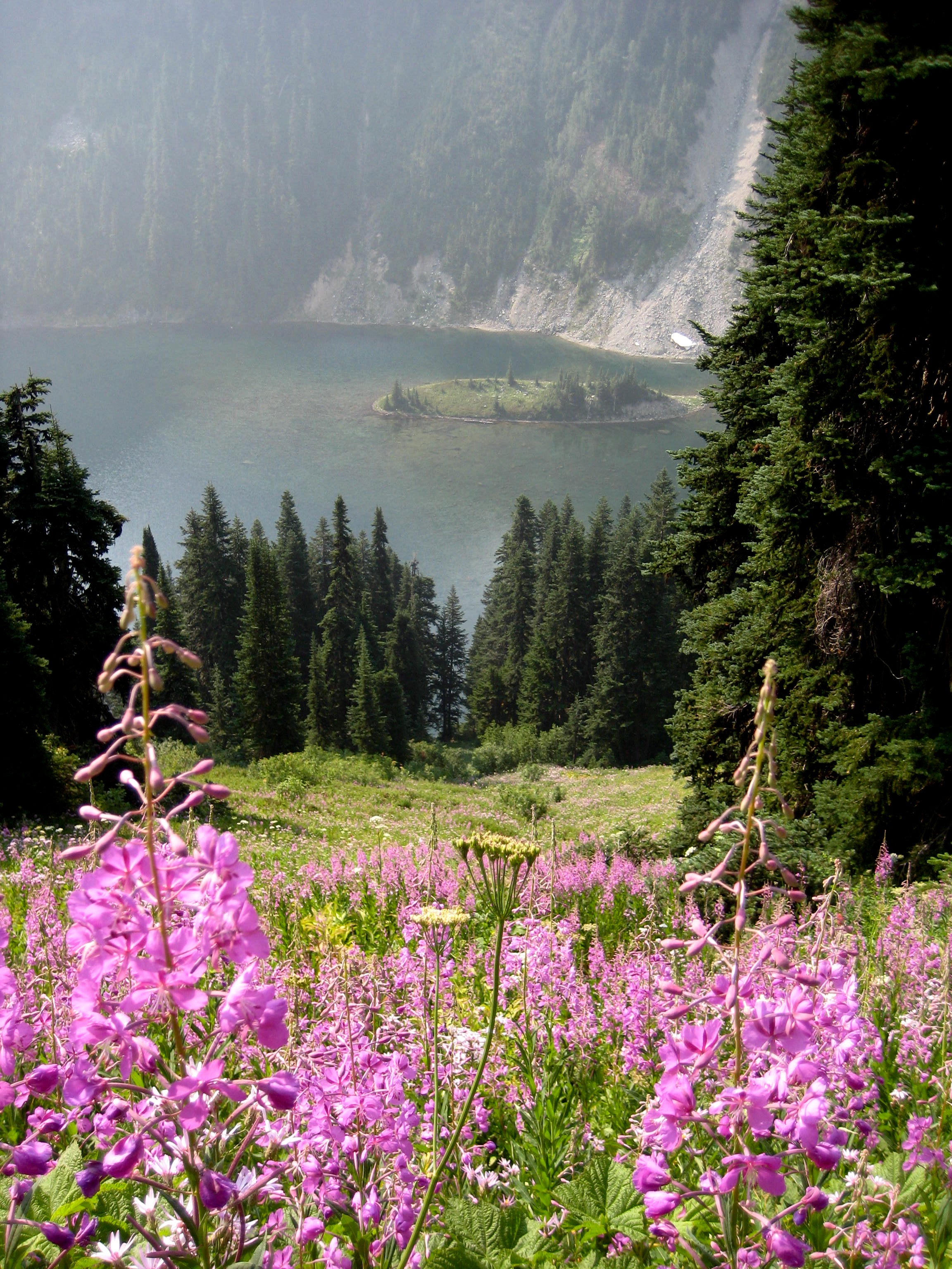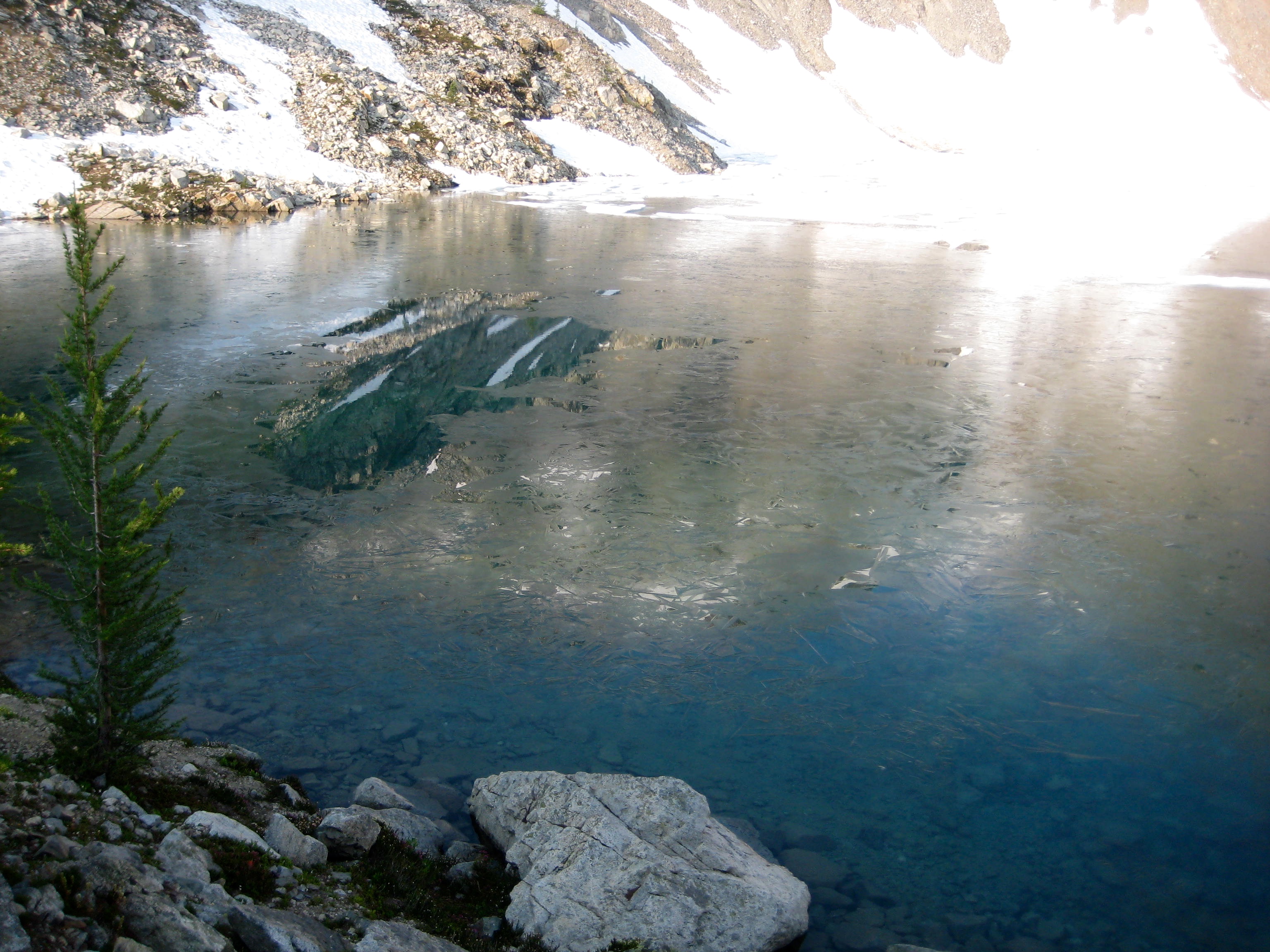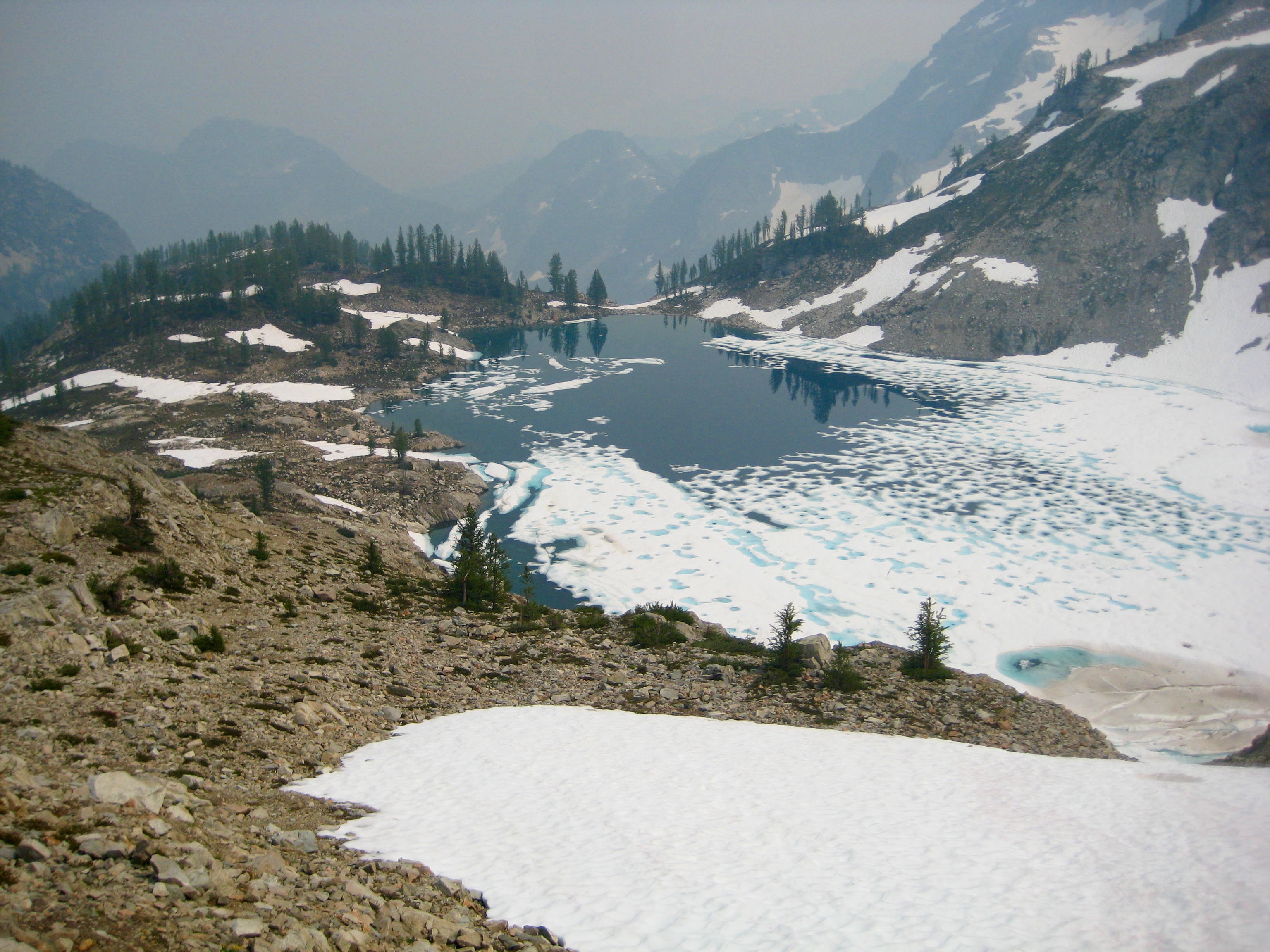 The morning sky was again very smokey except for a deep blue patch around Black Peak. We were packed up and ready to hike out by 7:45am. it was interesting to see that a veneer of ice had formed on Wing Lake during the night, confirming our feeling that this was a cold lake!