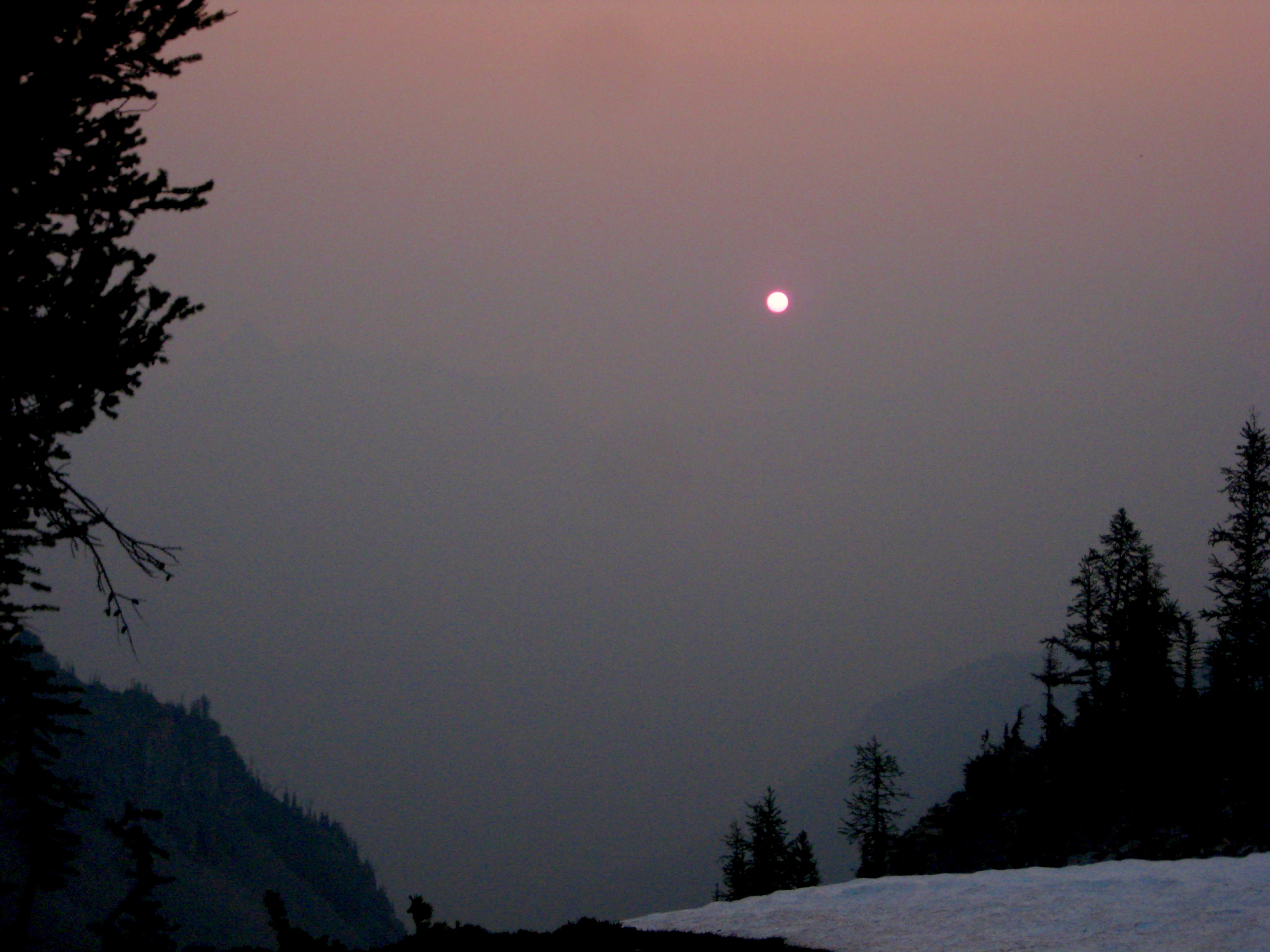 We awoke with high hopes of seeing clear skies all around, but it was just as smokey as ever. The rising sun hung in the sky like a Martian orb (although none of our cameras detected the strong red color).