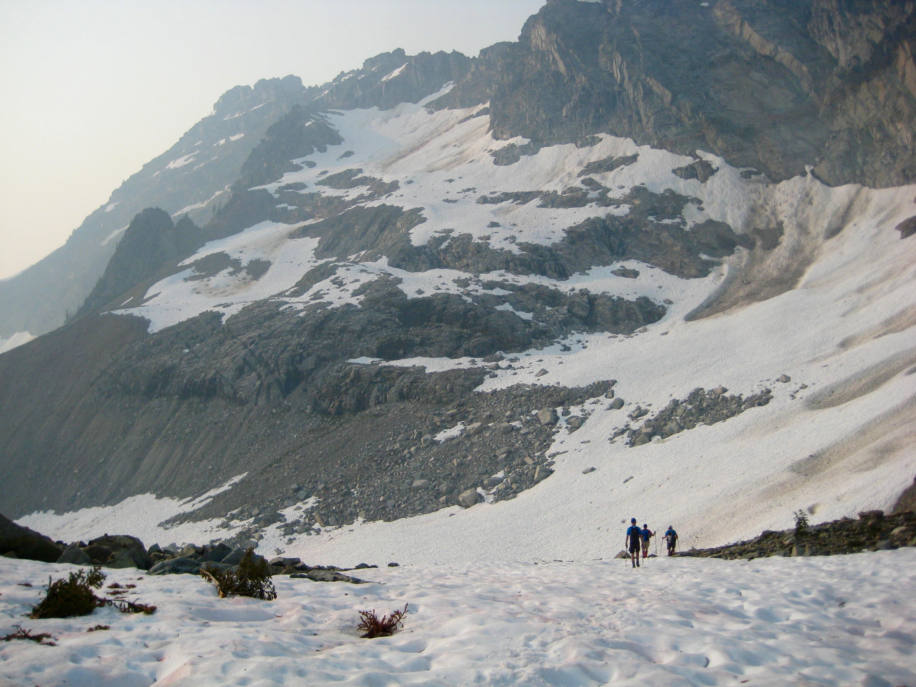 By the time we left camp, small patches of semi-clear sky were letting some sunlight through. We descended several hundred feet to reach the bottom edge of the Lewis Glacier (now just a snowfield), then cramponed up to the top-left corner of the glacier, where snow laps onto a level shoulder.