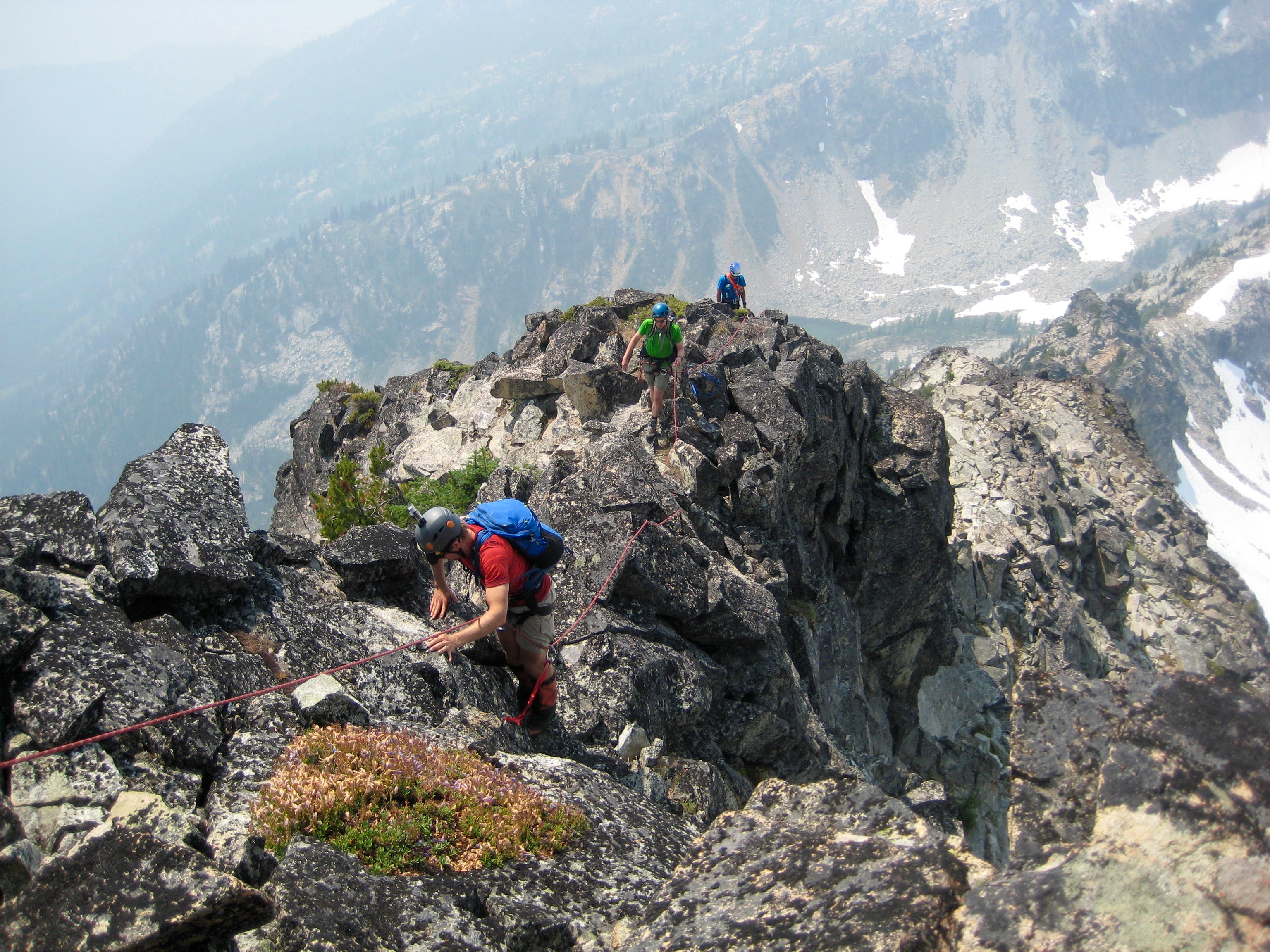 At the notch, we roped up and began simul-climbing along the south ridge crest. This ridgeline offers enjoyable Class 3-4 scrambling on blocky granite, with a few zones of shattered rhyolite tossed in to keep things interesting.
