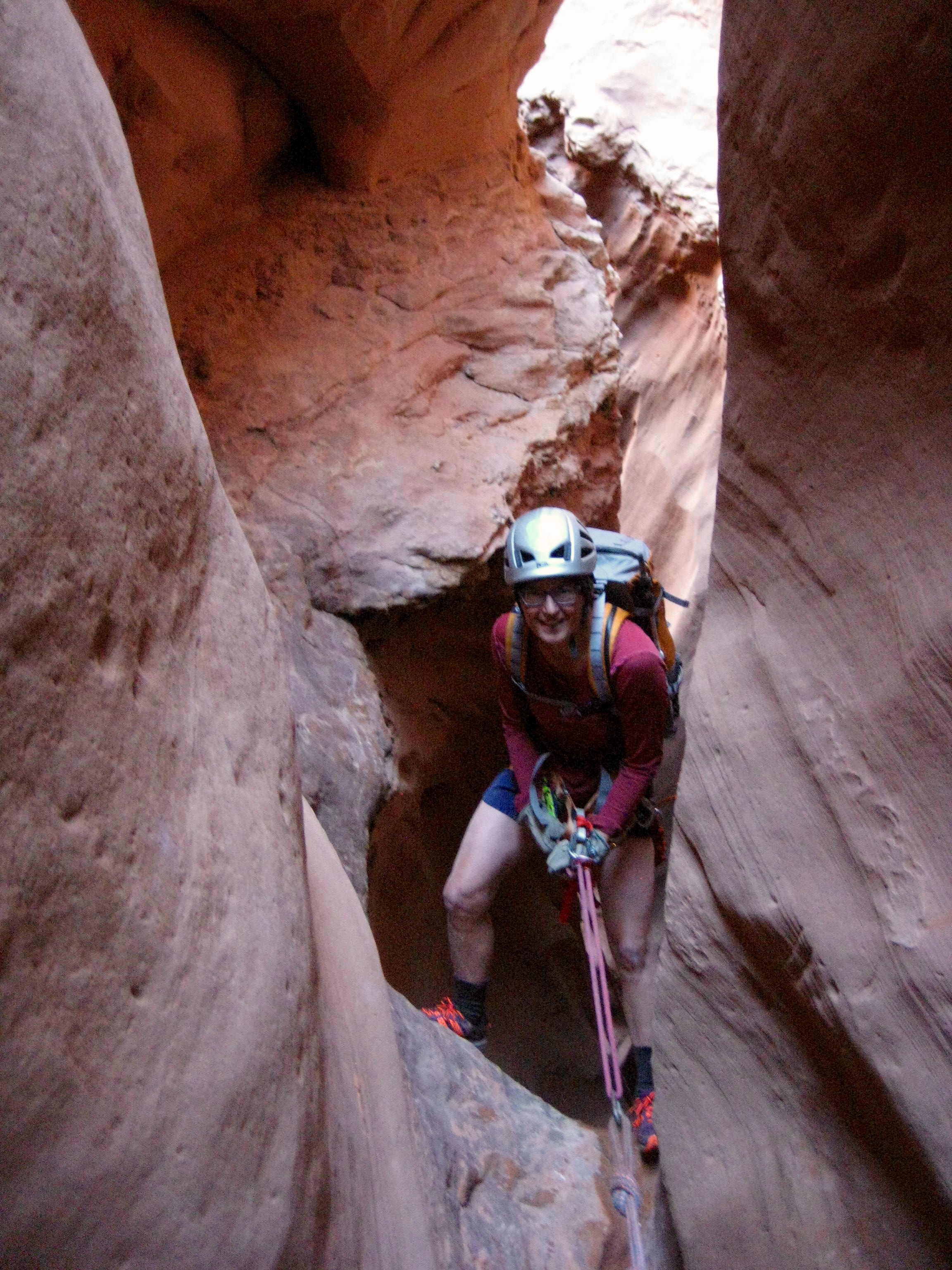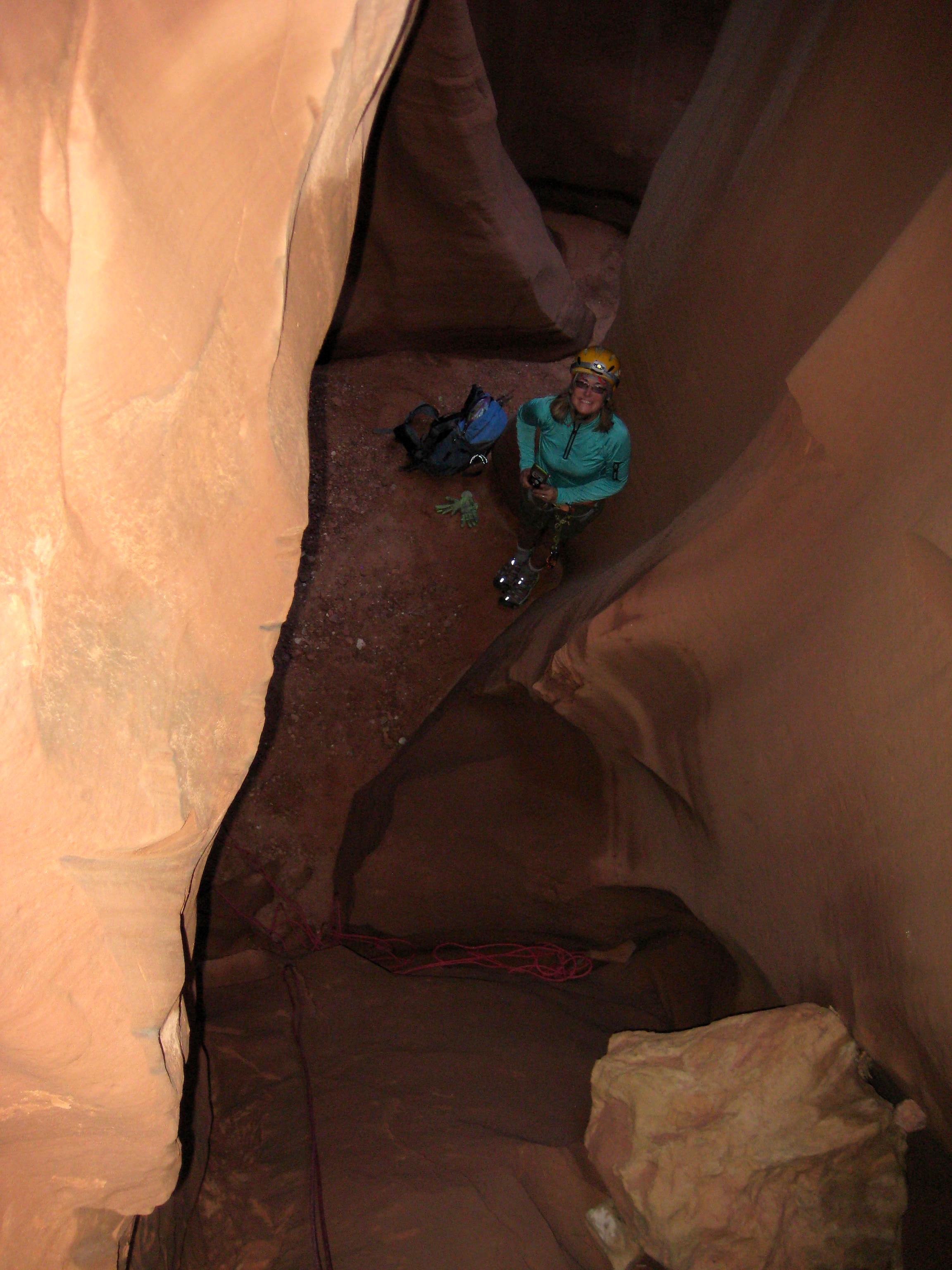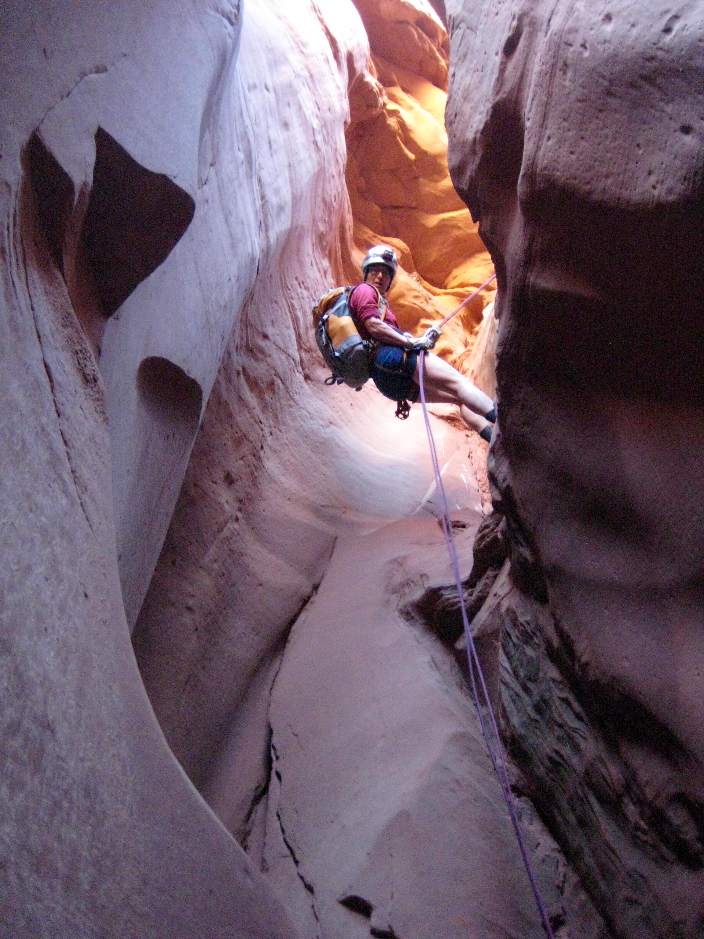 After some initial scrambling, we came to a steep drop. Here, we made the first of several rappels into deep, dark slots.