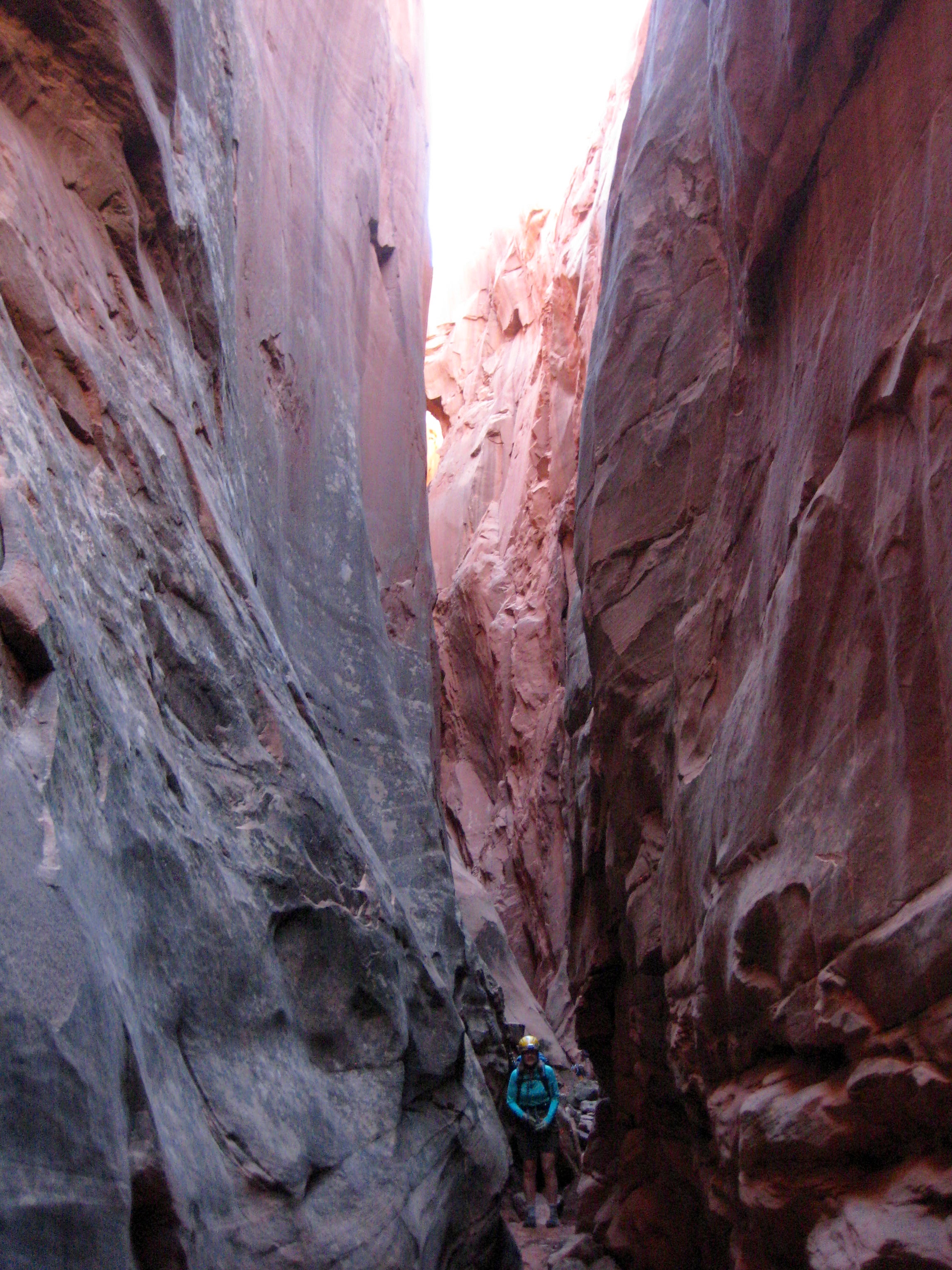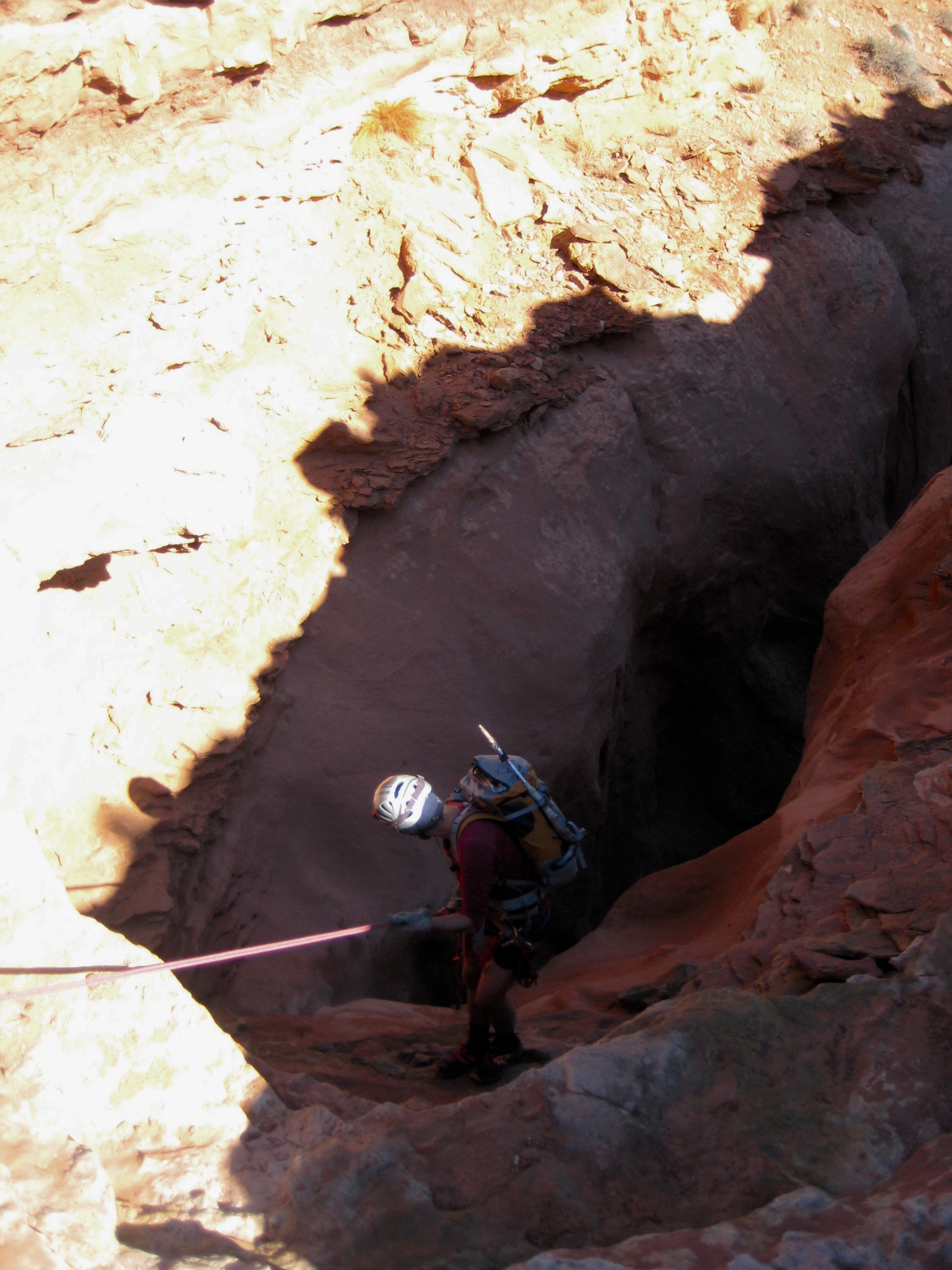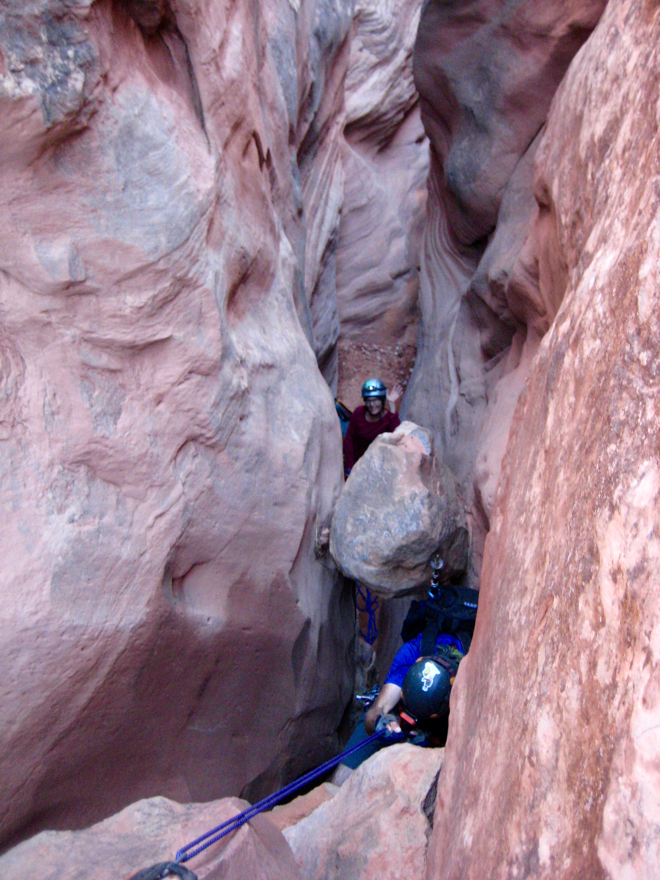 After some initial scrambling, we came to a steep drop. Here, we made the first of several rappels into deep, dark slots.