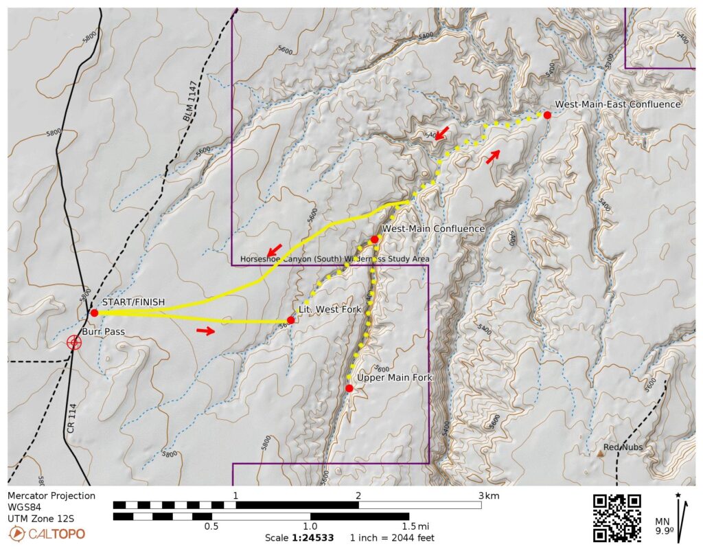 Upon returning the Little West – Main canyon confluence, we walked a mile downstream to the East-Main-West canyon confluence. Our exit from the canyons was made via a westside gully that led back up to the Bluejohn Mesa and the Burr Pass Camp parking lot (8.2 hours round trip).