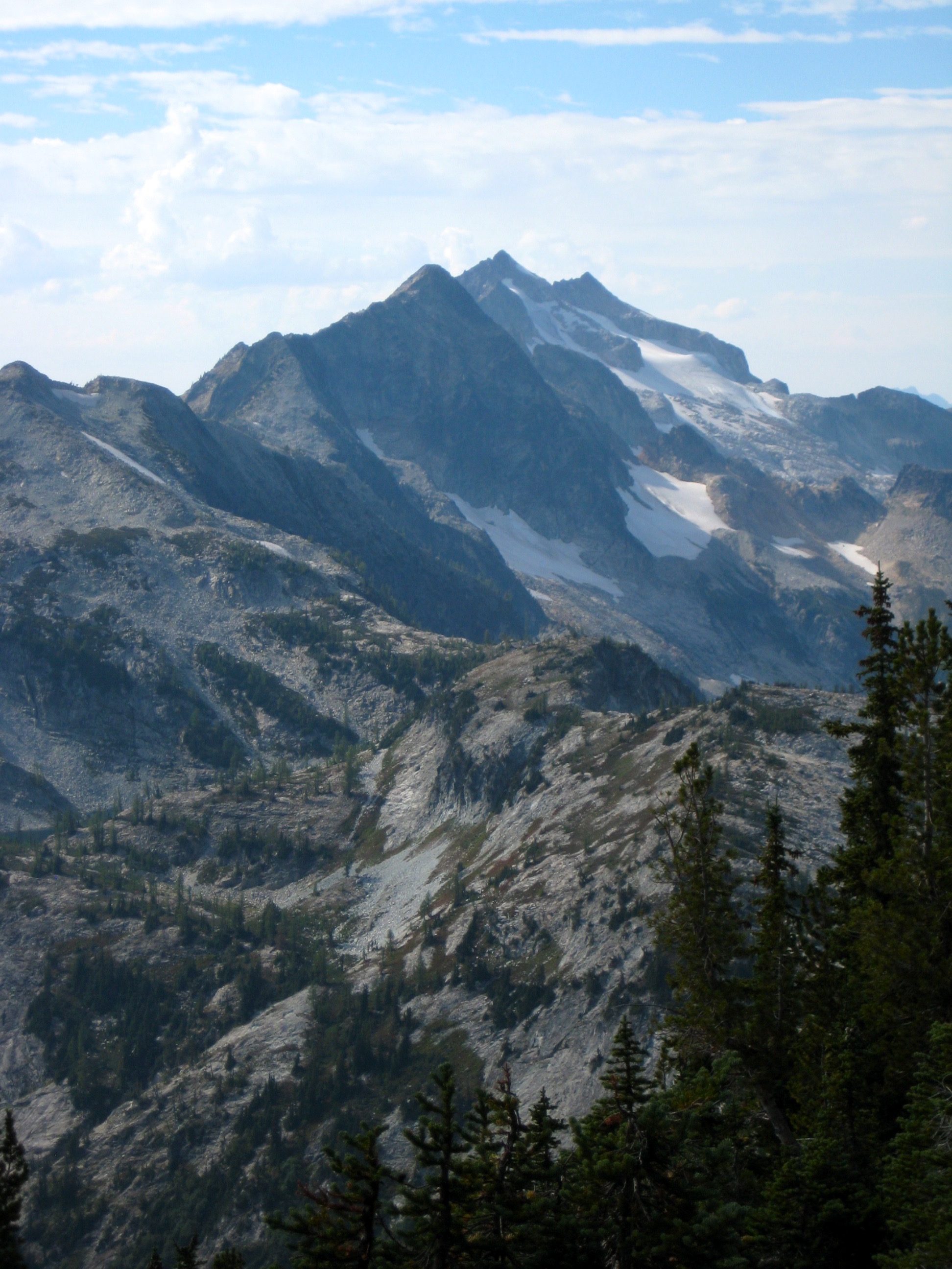 Our traverse route contoured eastward along the southern side of Rainbow Peak (Point 7237) and Rainbow Ridge. We wandered through heather meadows decorated with white boulders and green larches. This area would certainly be gorgeous in October, when the larches turn gold.